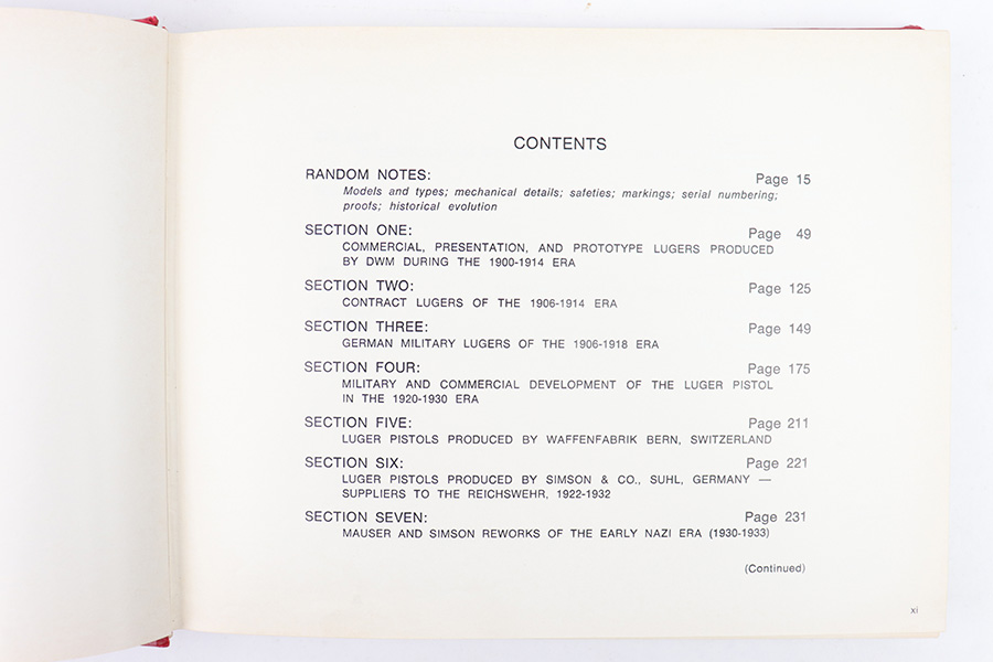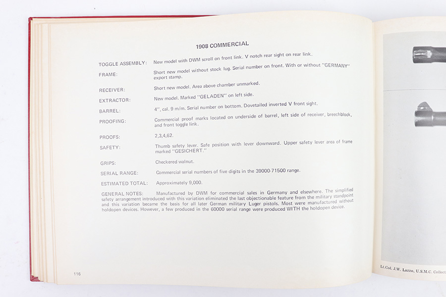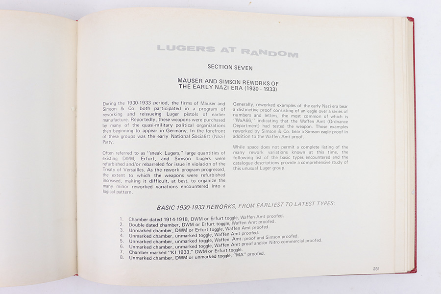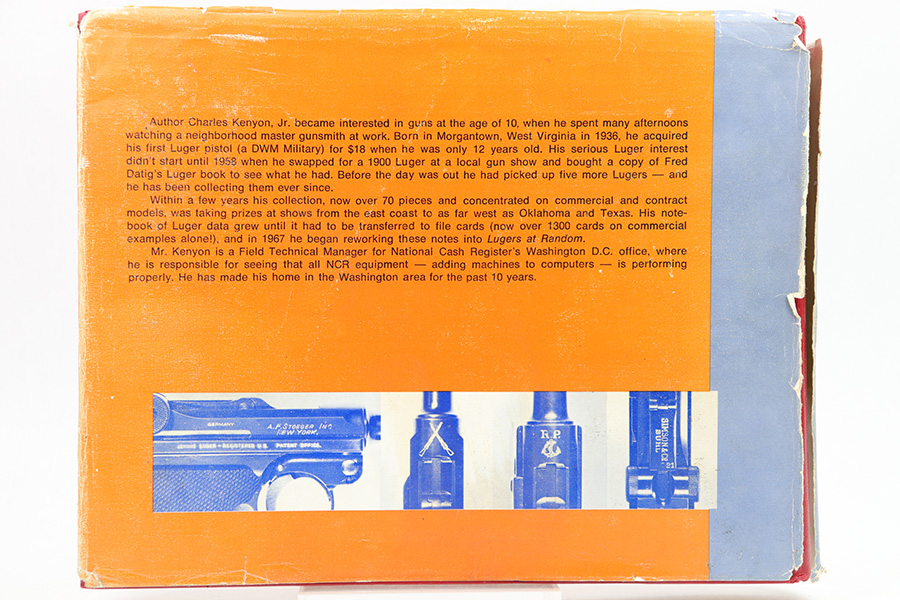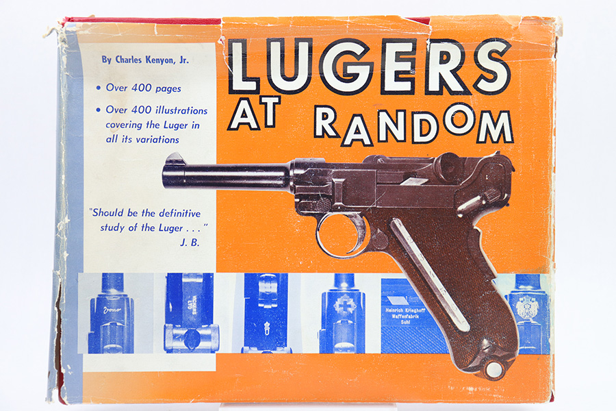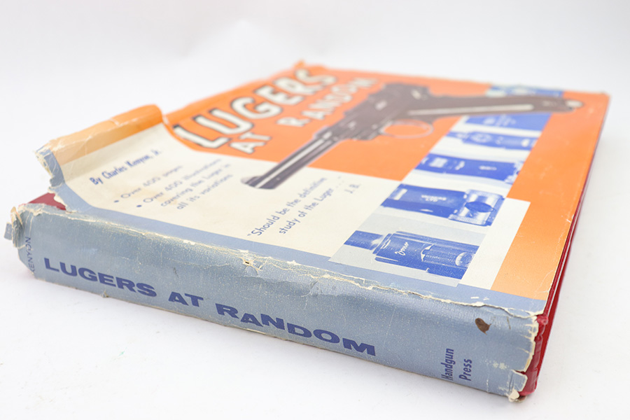 2/10/23 – Lugers at Random by Charles Kenyon Jr. is an excellent book for Luger collectors. The book describes the basic differences in models and types and shows side by side photographs to help clarify them. It has disassembled guns with individual part names and a brief section on Proof Marks. The book is 420 pages and features dozens of Luger pistol photographs. There is considerable cosmetic wear/damage on the book sleeve, as shown, but the hardcover book is in great shape. All the pages are in excellent condition.