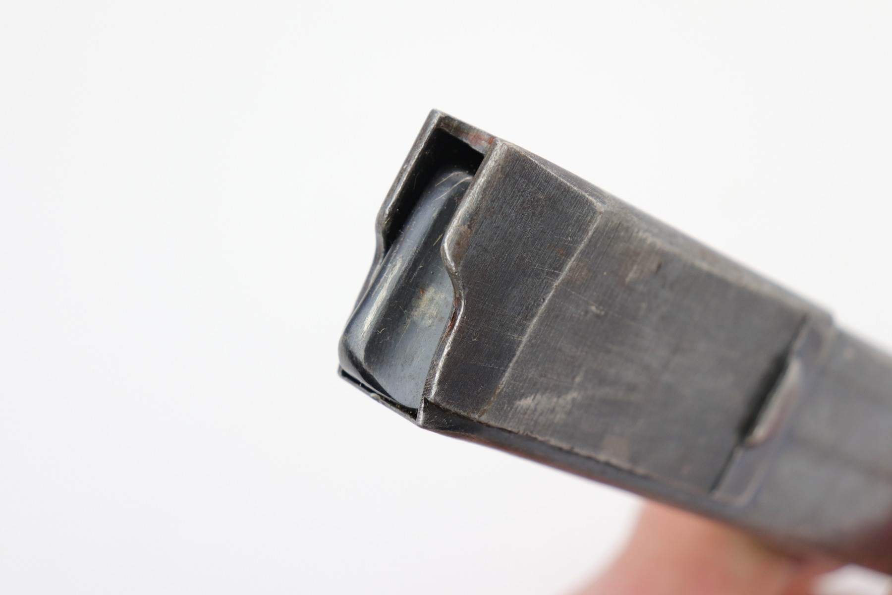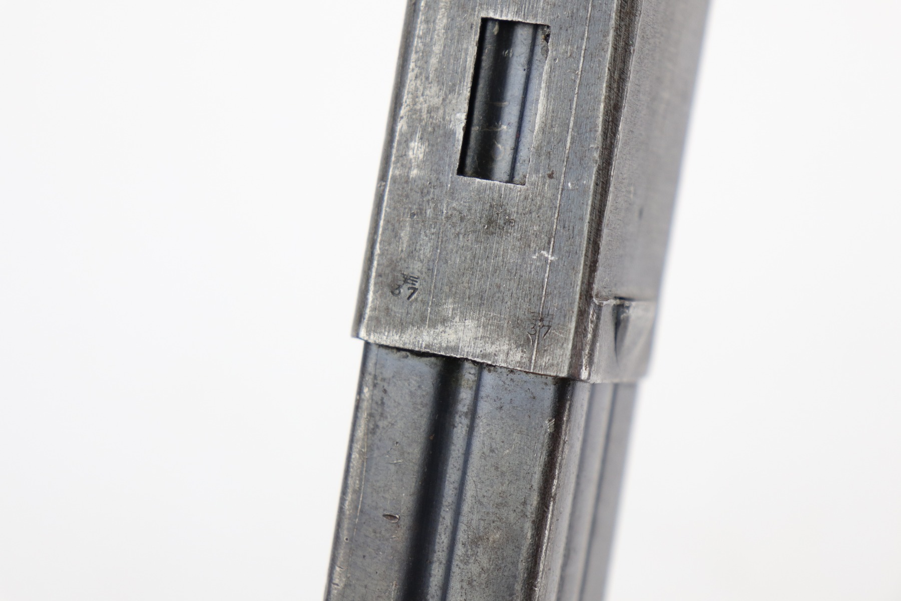 1/14/20 – This is a fairly scarce MP 40 magazine that is stamped “M.P. 41” on the left side of the frame. There’s also a Haenel maker stamp on the left side. The spine is properly waffen eagle/37 proof stamped and “32” numbered. The finish is fading and worn throughout the magazine, but no major issues or flaws. Strong, fully functional spring.