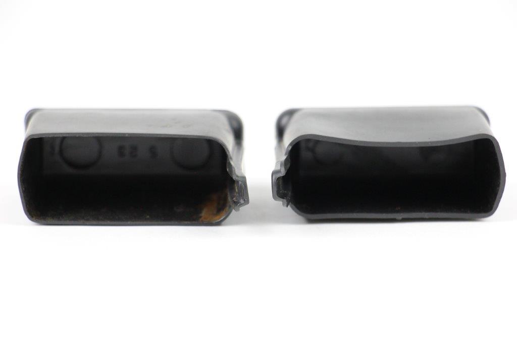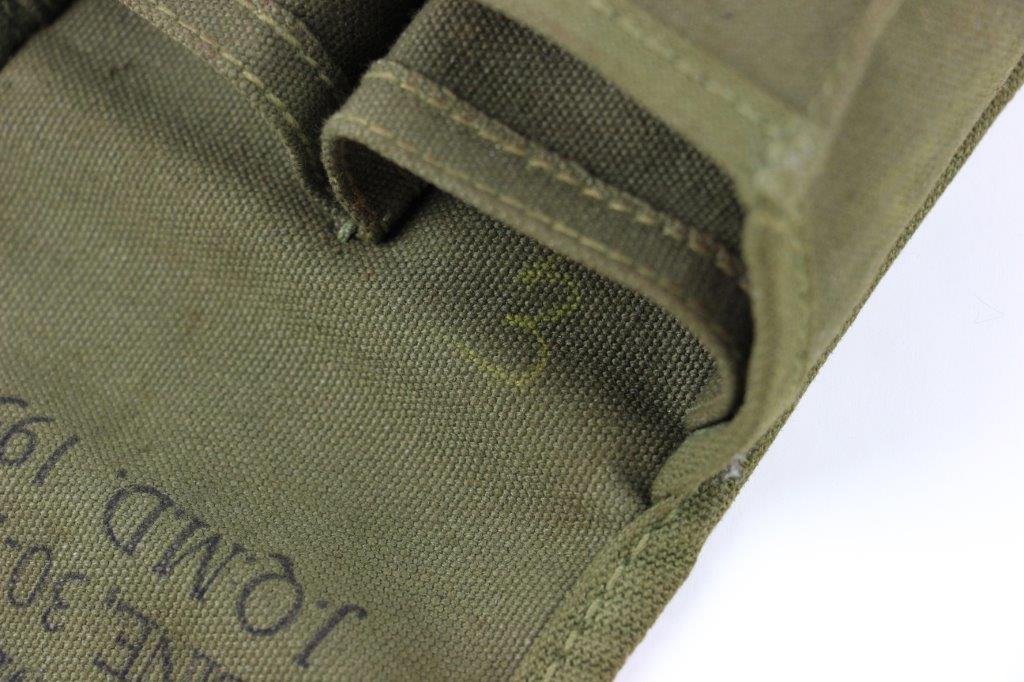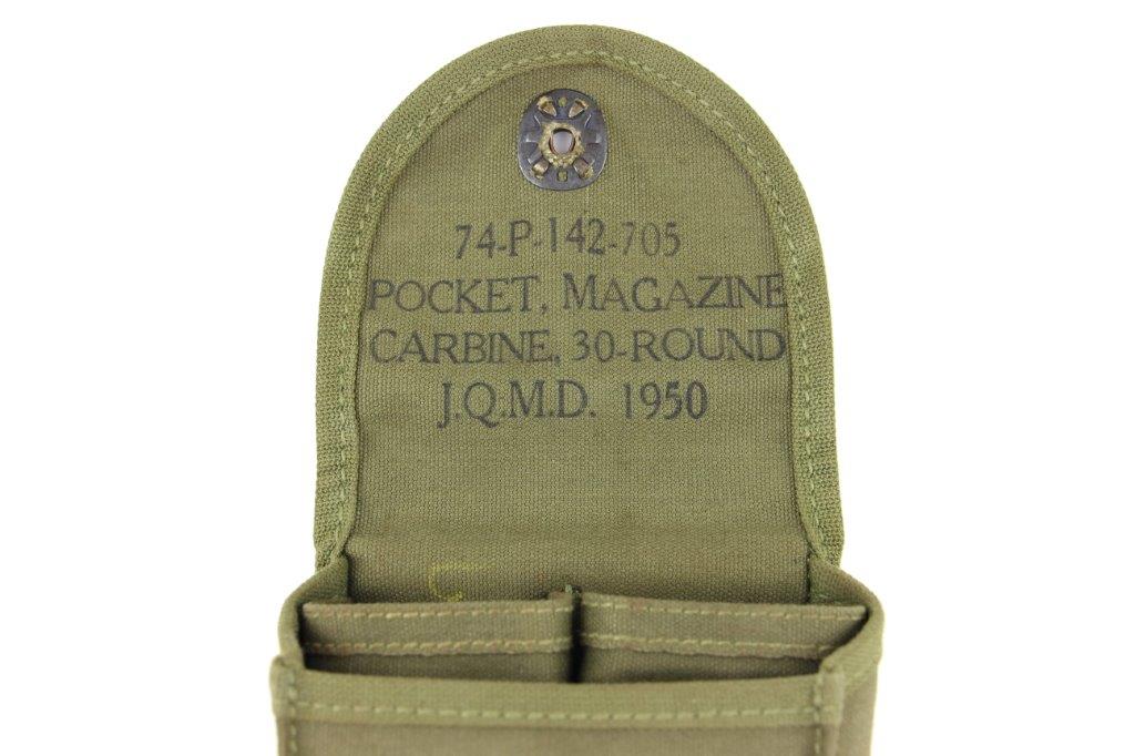 2/19/24 – This is a set of 30 round M1 Carbine (M2) magazines, complete with original rubber mag covers, and a canvas US military pouch. The pouch is excellent condition with an ink stamp indicating maker and 1950 as the date. The magazines are minty condition with strong, functional springs.