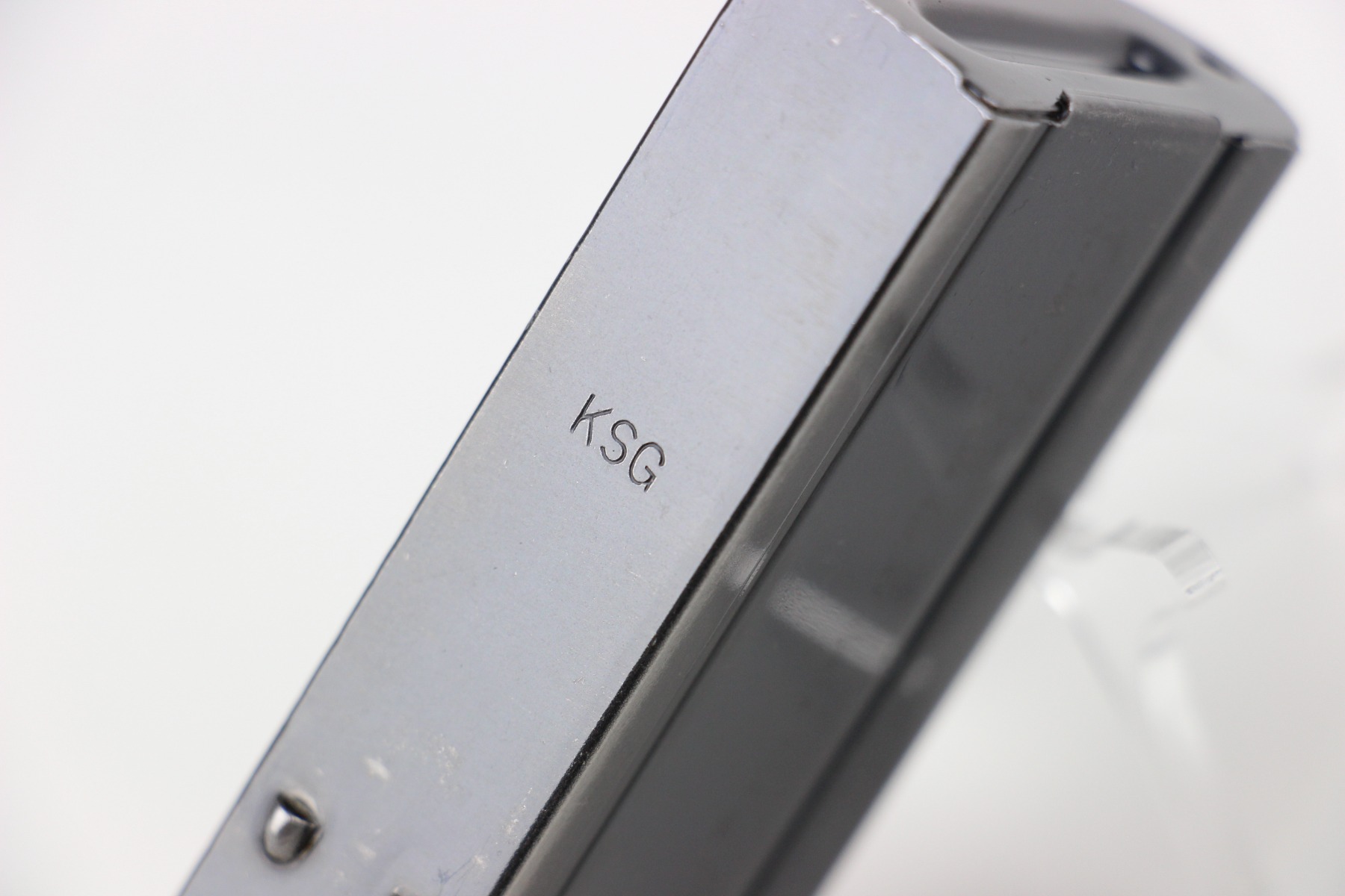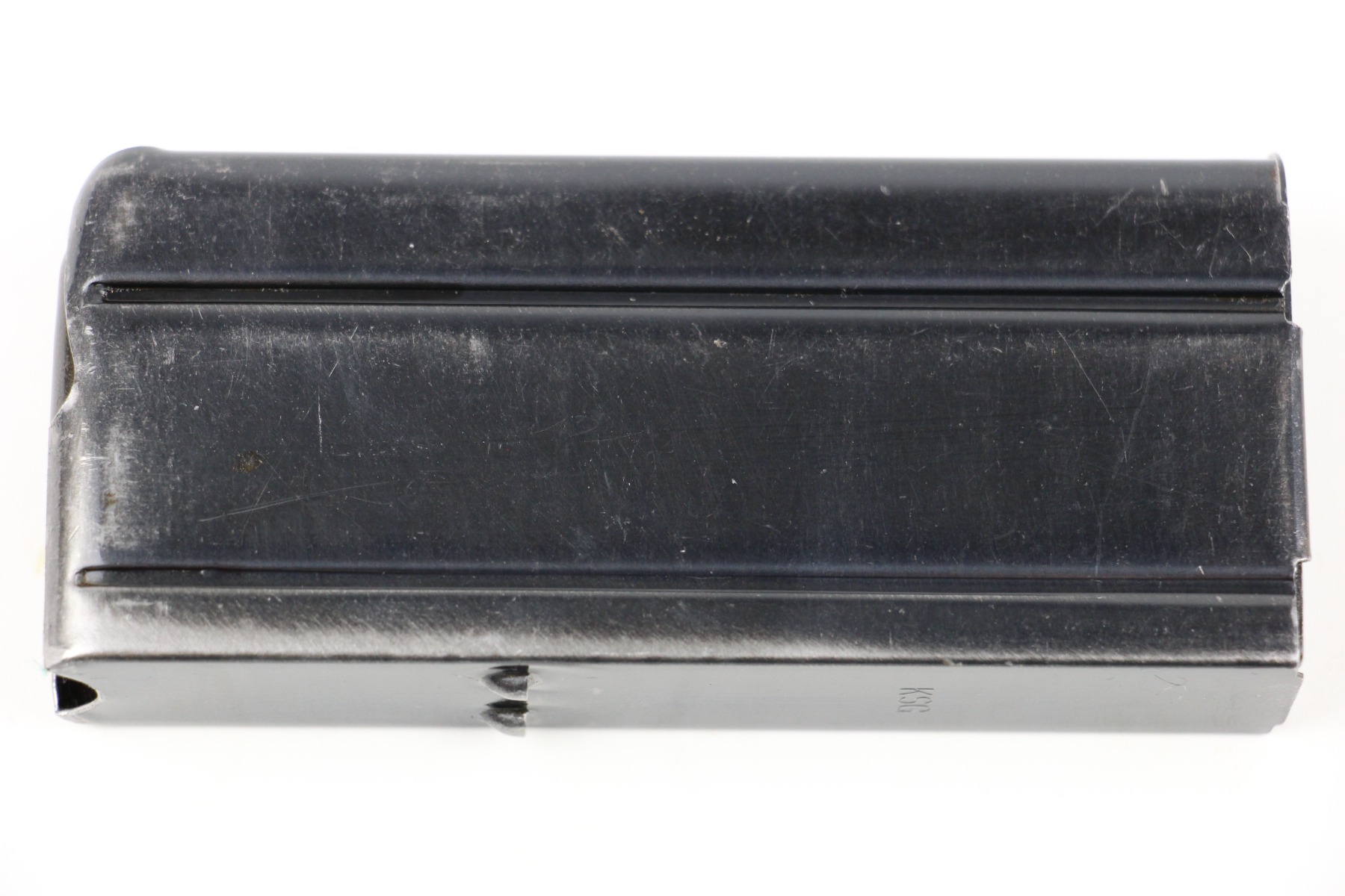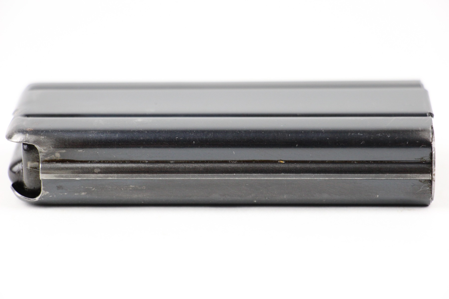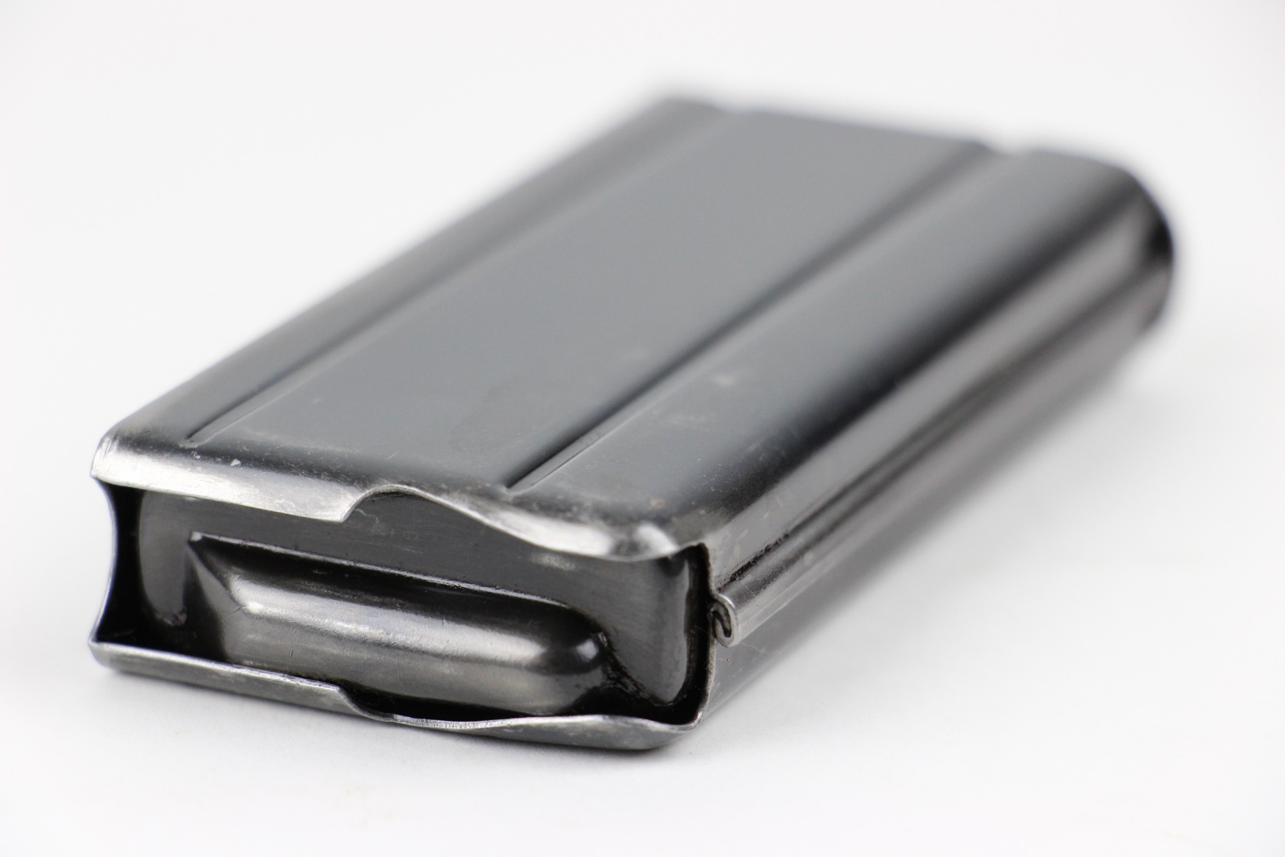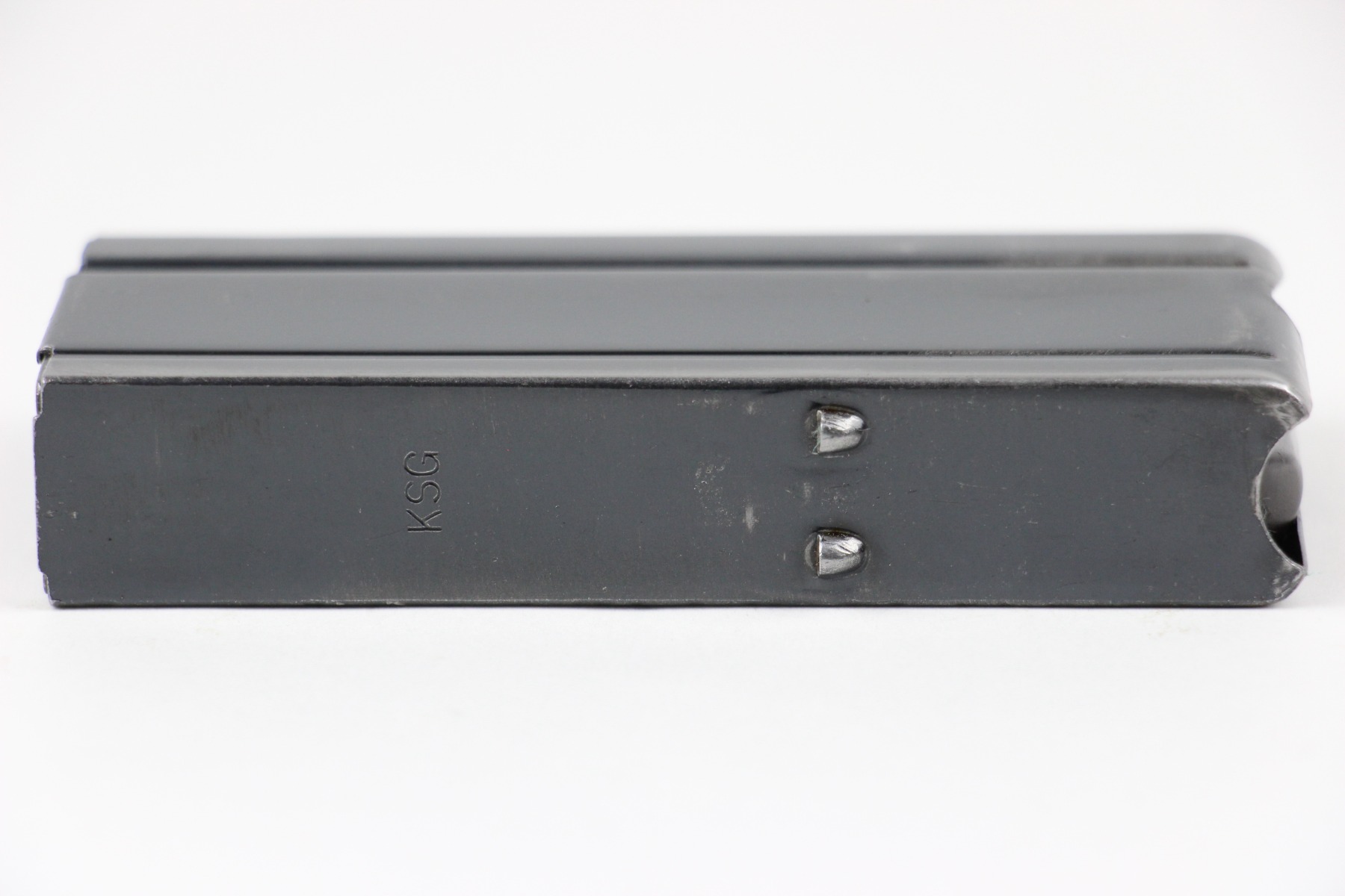 5/6/24 – This is an original WW2 era M1 Carbine rifle magazine. Holds 15 rounds of .30 caliber ammunition. The magazine is in near excellent condition with all original finish and minimal finish loss. Strong, fully functional spring. The spine is maker stamped with an upside down “KSG”. Type 5 magazine base indicates late-wartime production.