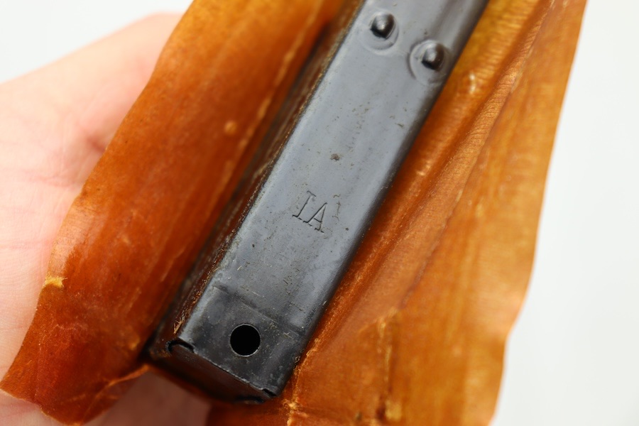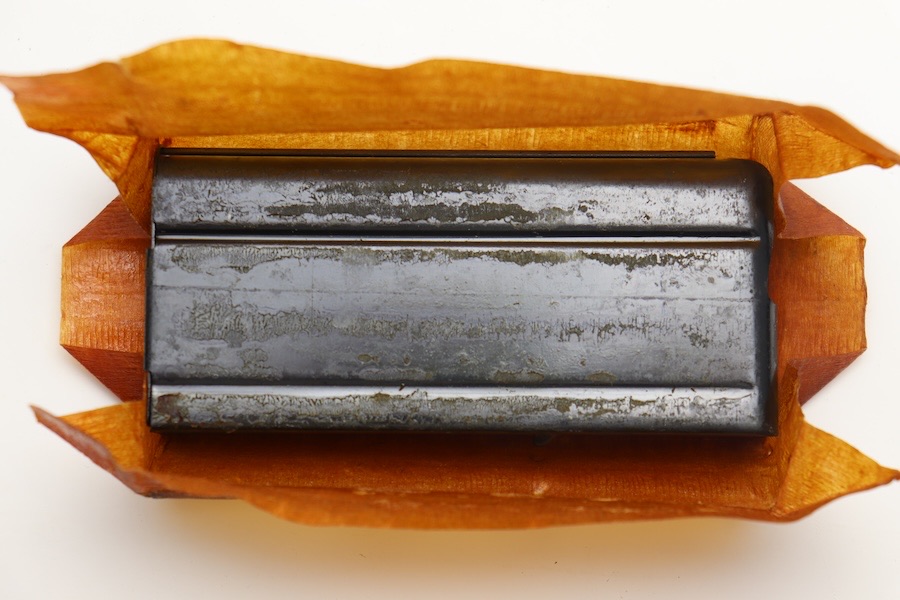 3/14/24 – This is an original M1 Carbine magazine in wax paper. The outer wax paper has held up quite well and only has one minor pinhole. The mag itself is mint condition with no finish loss and is fully functional with no dents. We carefully unwrapped the magazine to check the maker’s mark (IA). This is an excellent addition to any M1 Carbine collector.