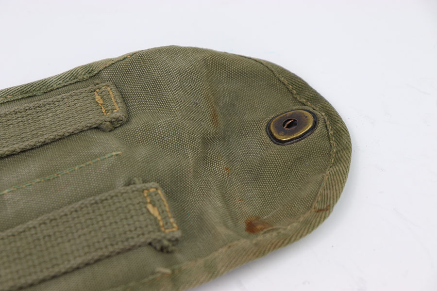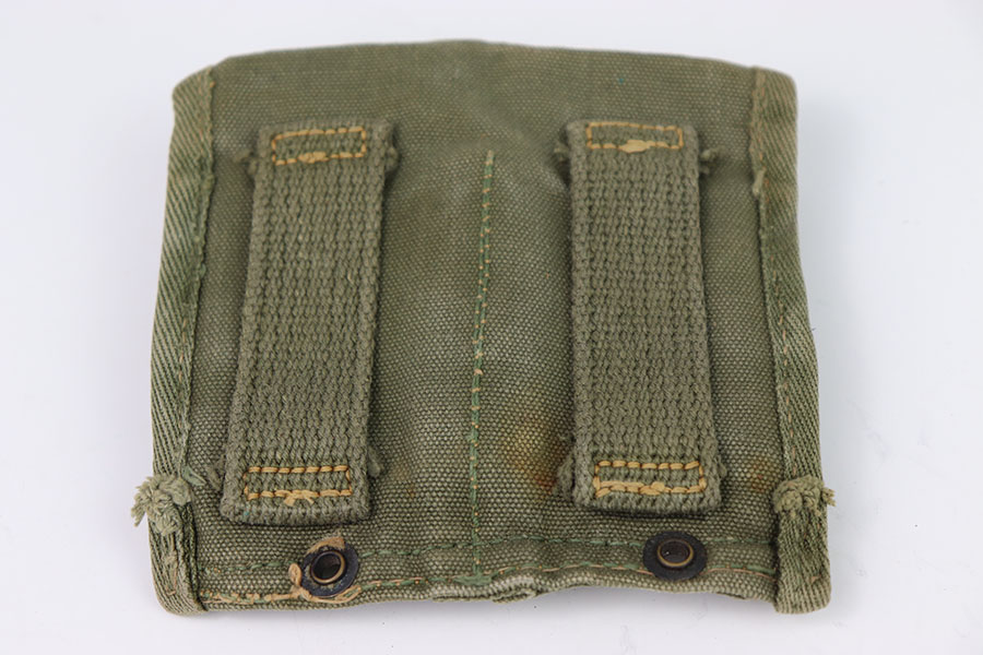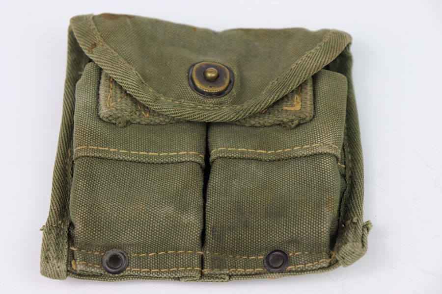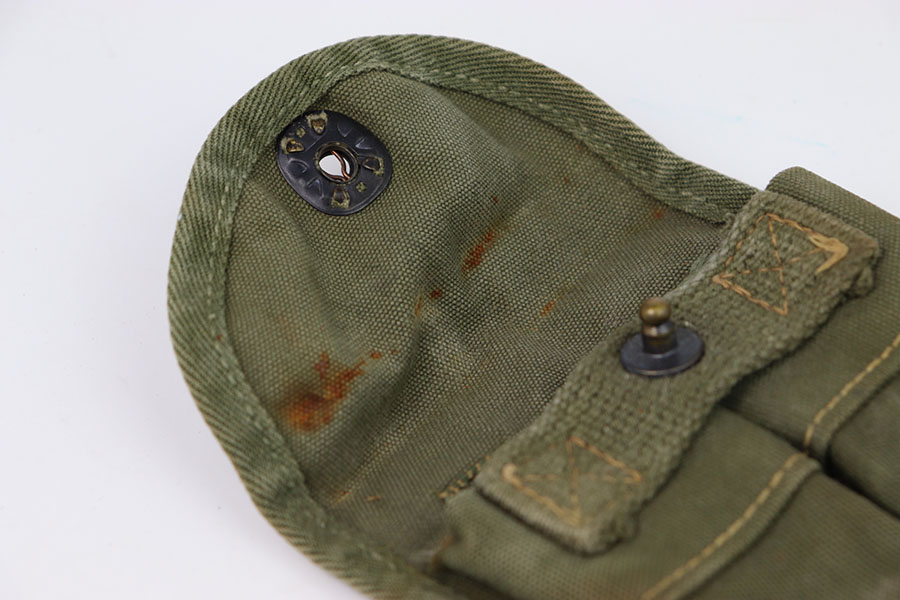 2/26/24 – This is an excellent example of a WW2 M1 carbine magazine pouch. This magazine pouch is in great overall condition, it has a few rust stains from likely a rusty magazine which was stored inside. See photos. This magazine pouch has no markings. The closing button is fully functional with a strong hold.