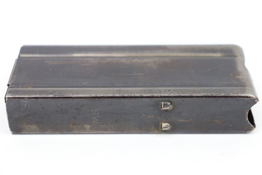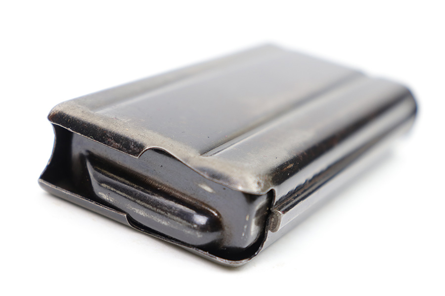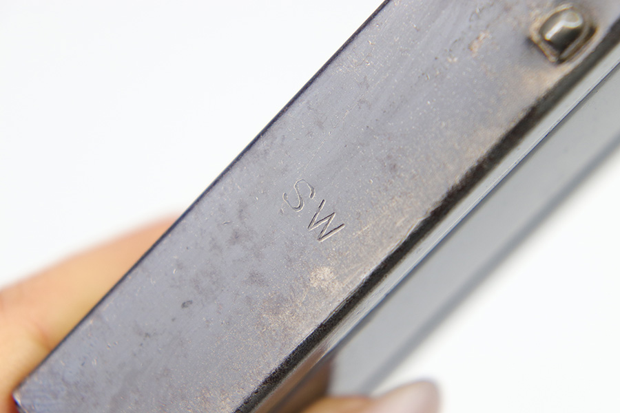 1/26/23 – This is an original M1 Carbine rifle magazine from WW2. The magazine has some mild finish loss and surface patina, but no rust or pitting and a fully functional spring. The spine is stamped “SW” by the maker (Stanley Works).