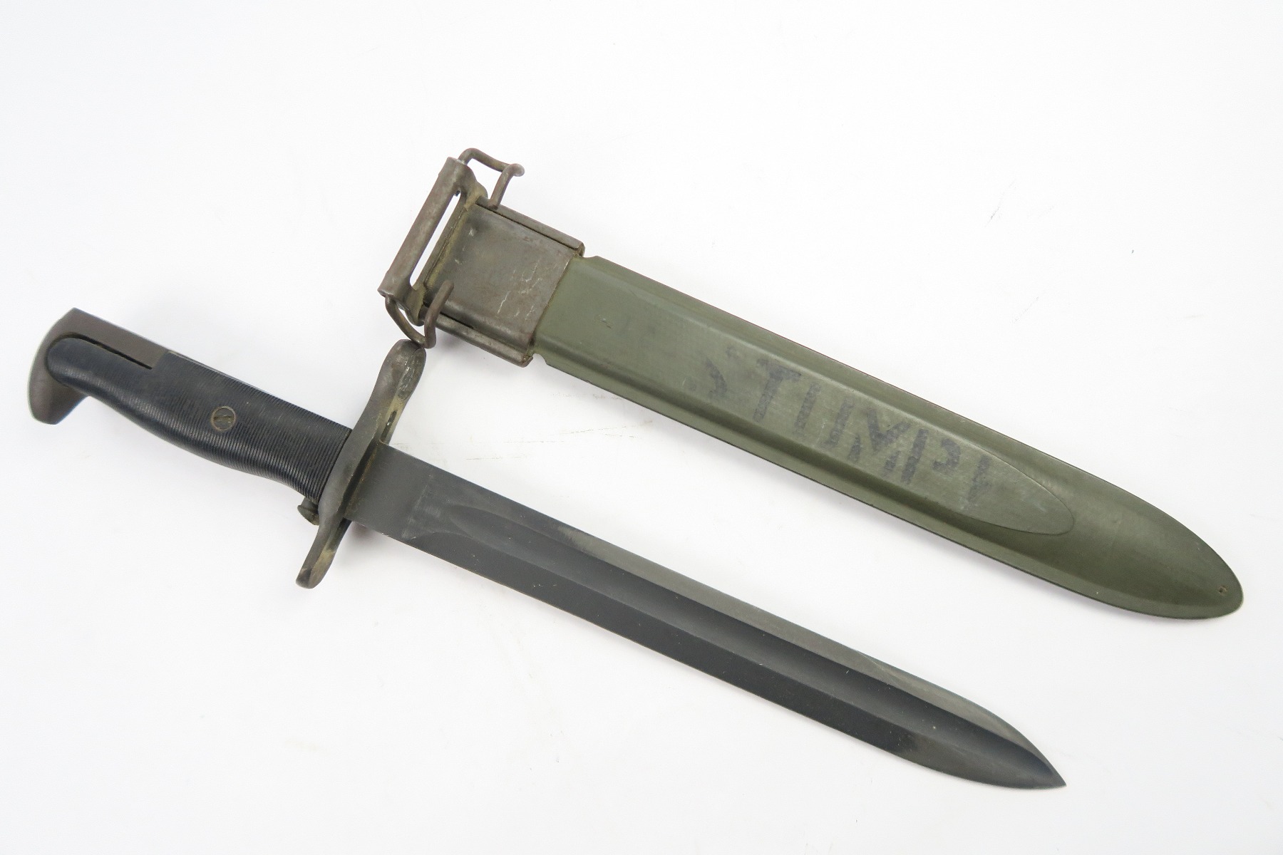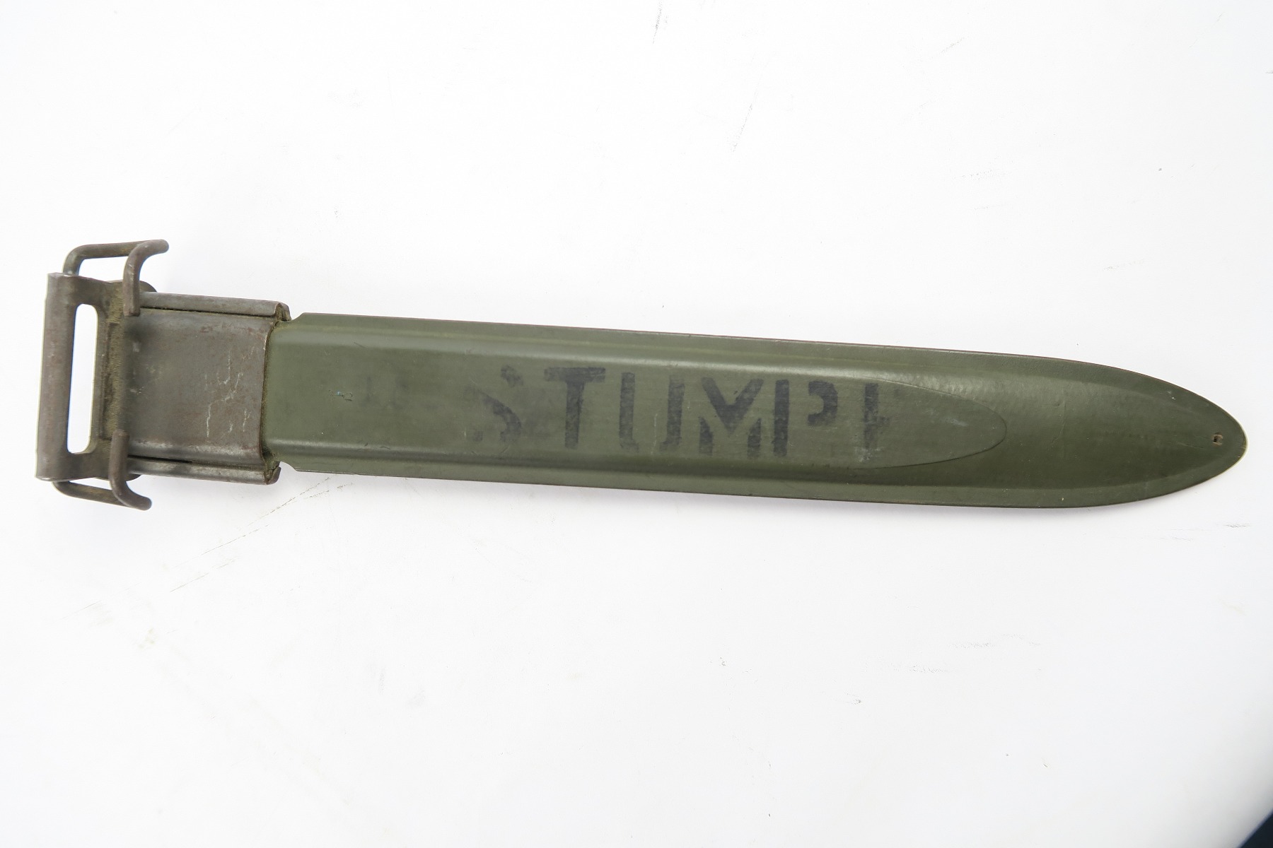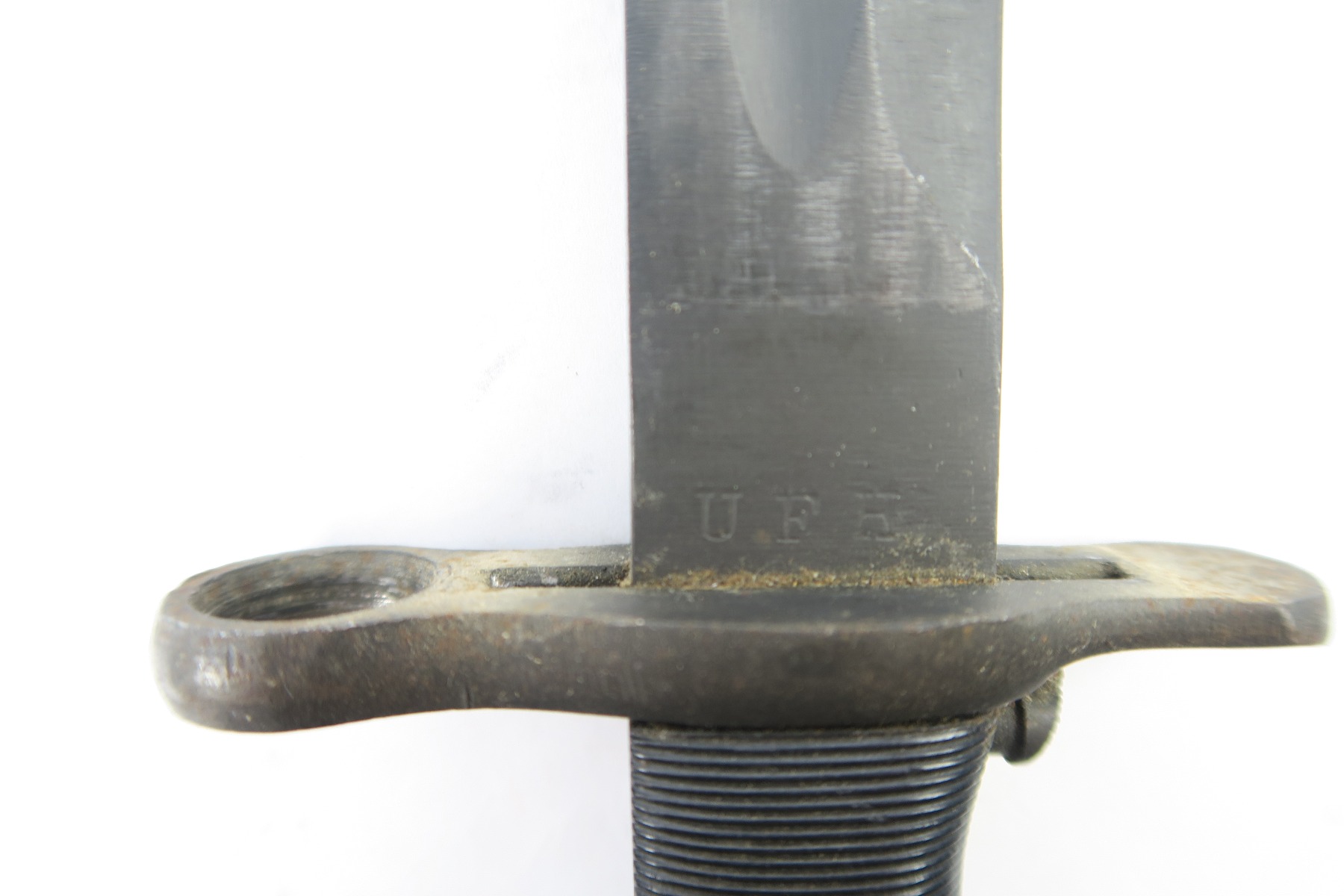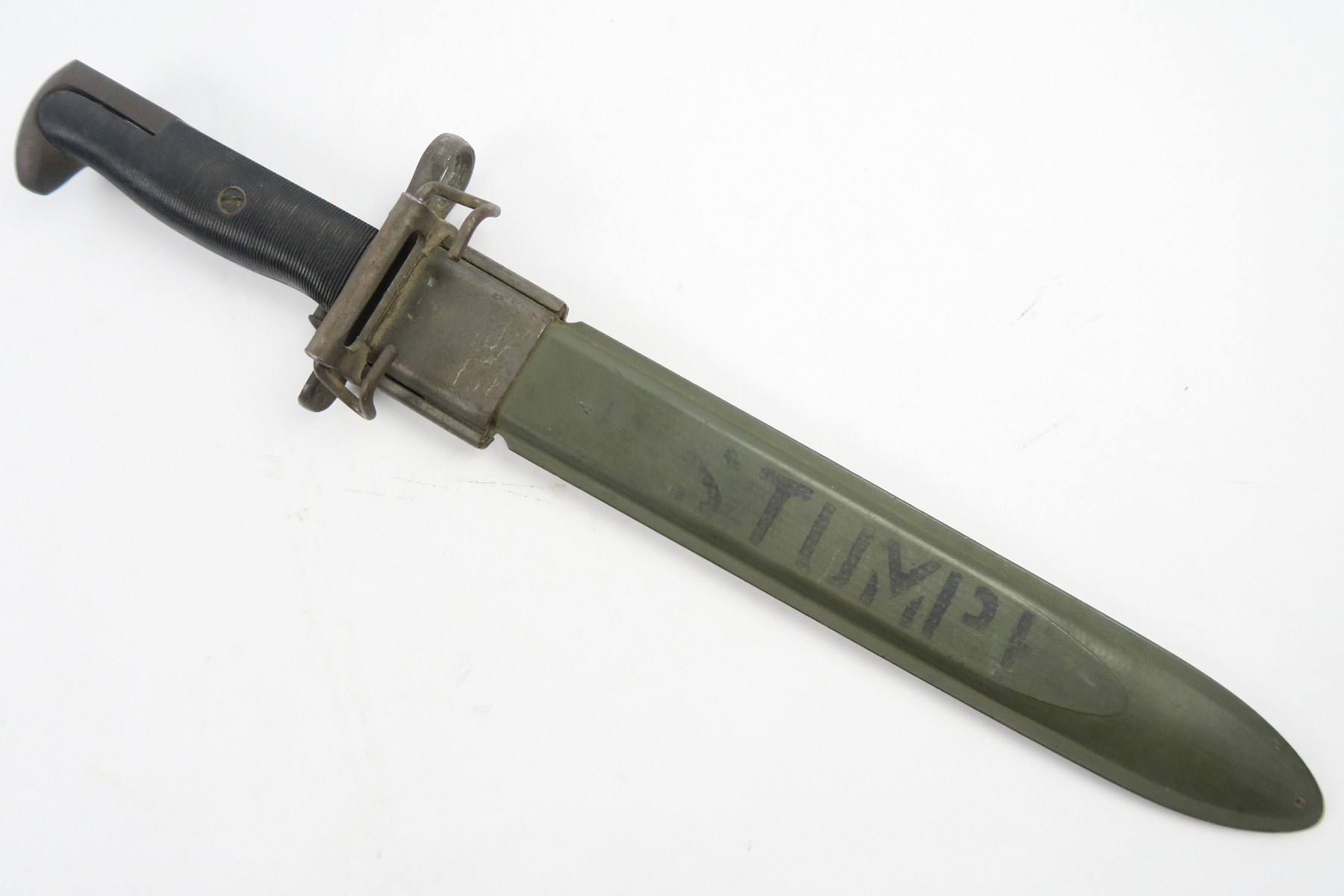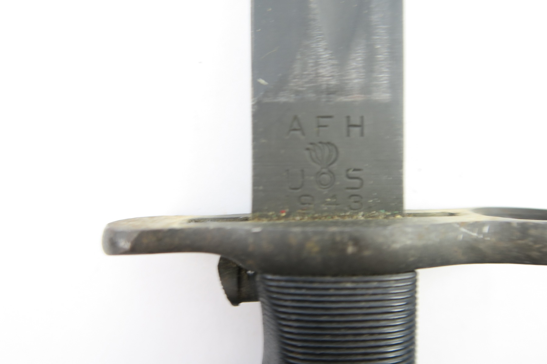 5/2/18 – This is an original 1943 dated M1 garand bayonet. The bayonet has been cut, as was done by the arsenals during WW2. The blade is excellent and unsharpened, maker stamped AFH with a US flaming bomb and 1943 date. The reverse side is UFH stamped. The handle is also excellent with no cracks or chips. The scabbard is original as well and it looks like someone painted their name on the back with a stencil “STUMPH” (?). Guaranteed all original and authentic.