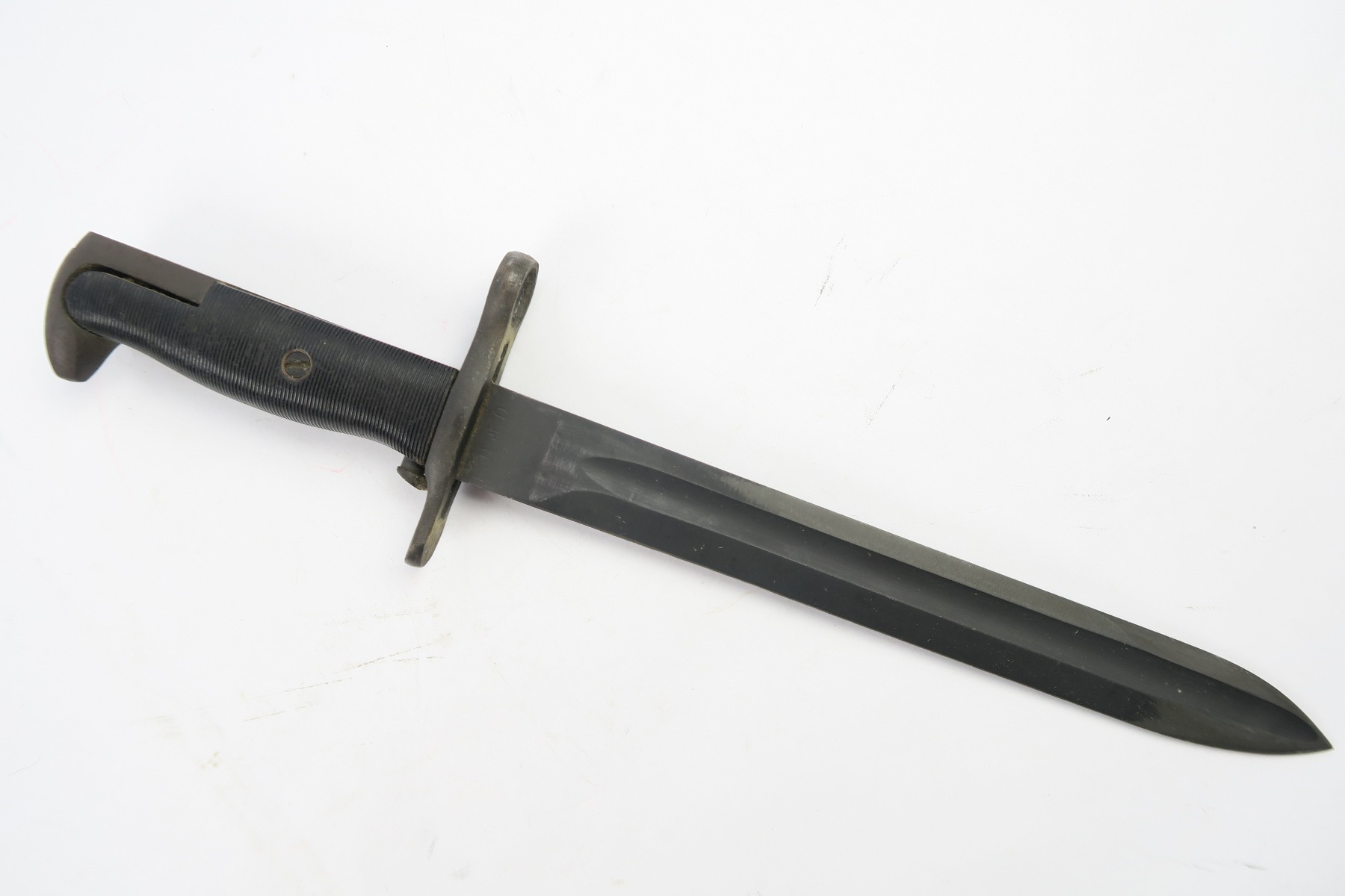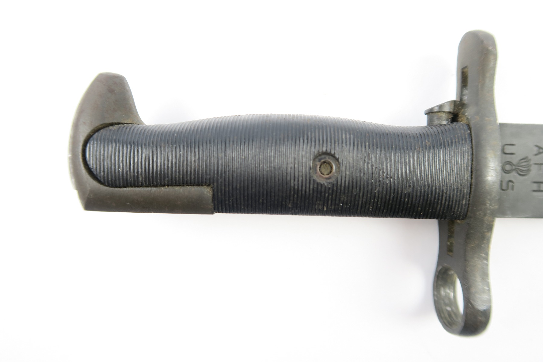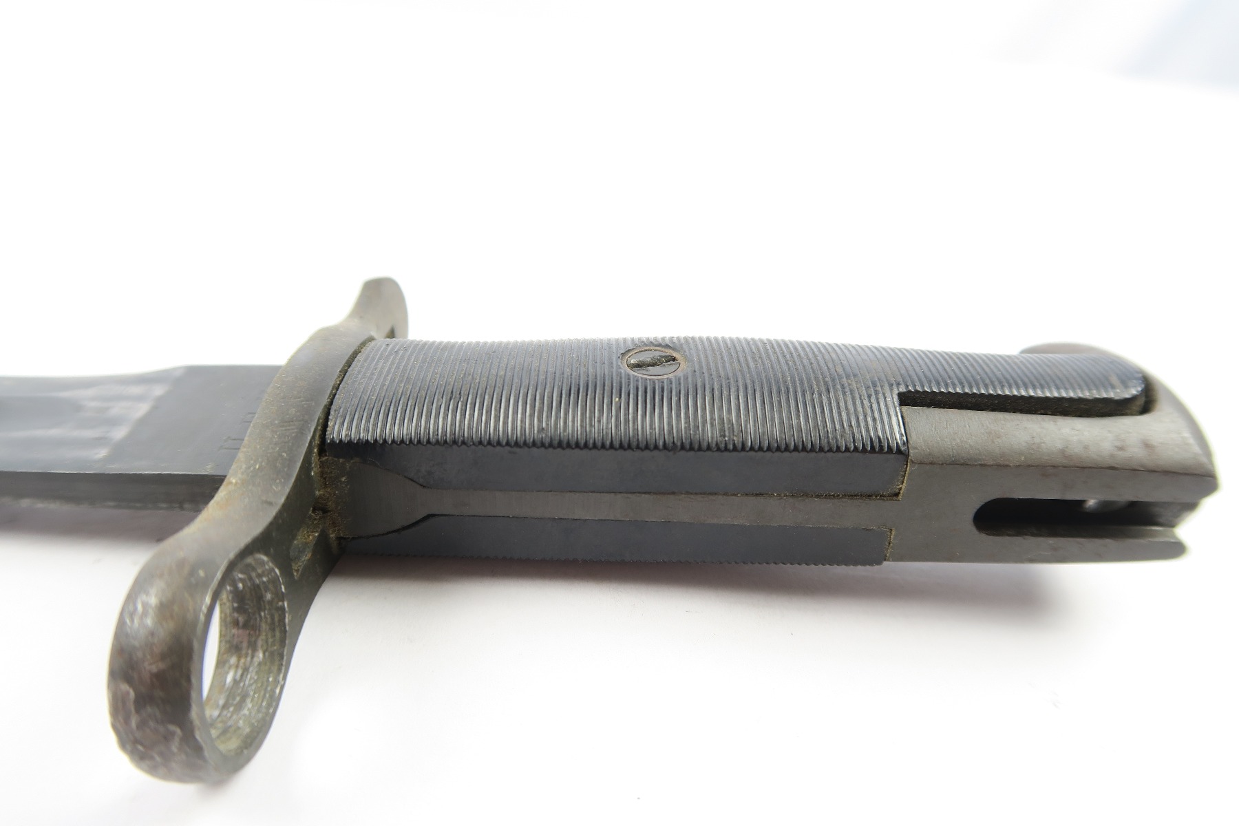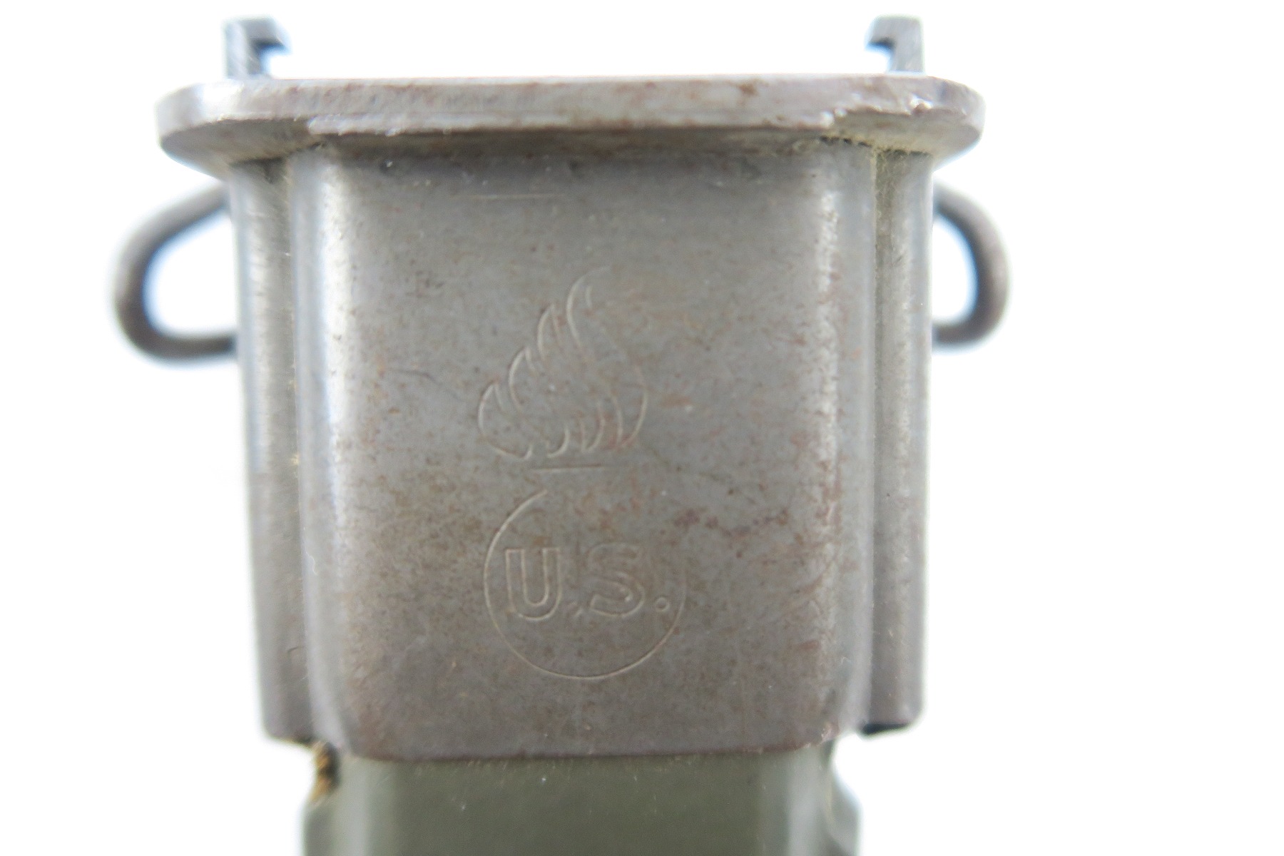 5/2/18 – This is an original 1943 dated M1 garand bayonet. The bayonet has been cut, as was done by the arsenals during WW2. The blade is excellent and unsharpened, maker stamped AFH with a US flaming bomb and 1943 date. The reverse side is UFH stamped. The handle is also excellent with no cracks or chips. The scabbard is original as well and it looks like someone painted their name on the back with a stencil “STUMPH” (?). Guaranteed all original and authentic.
