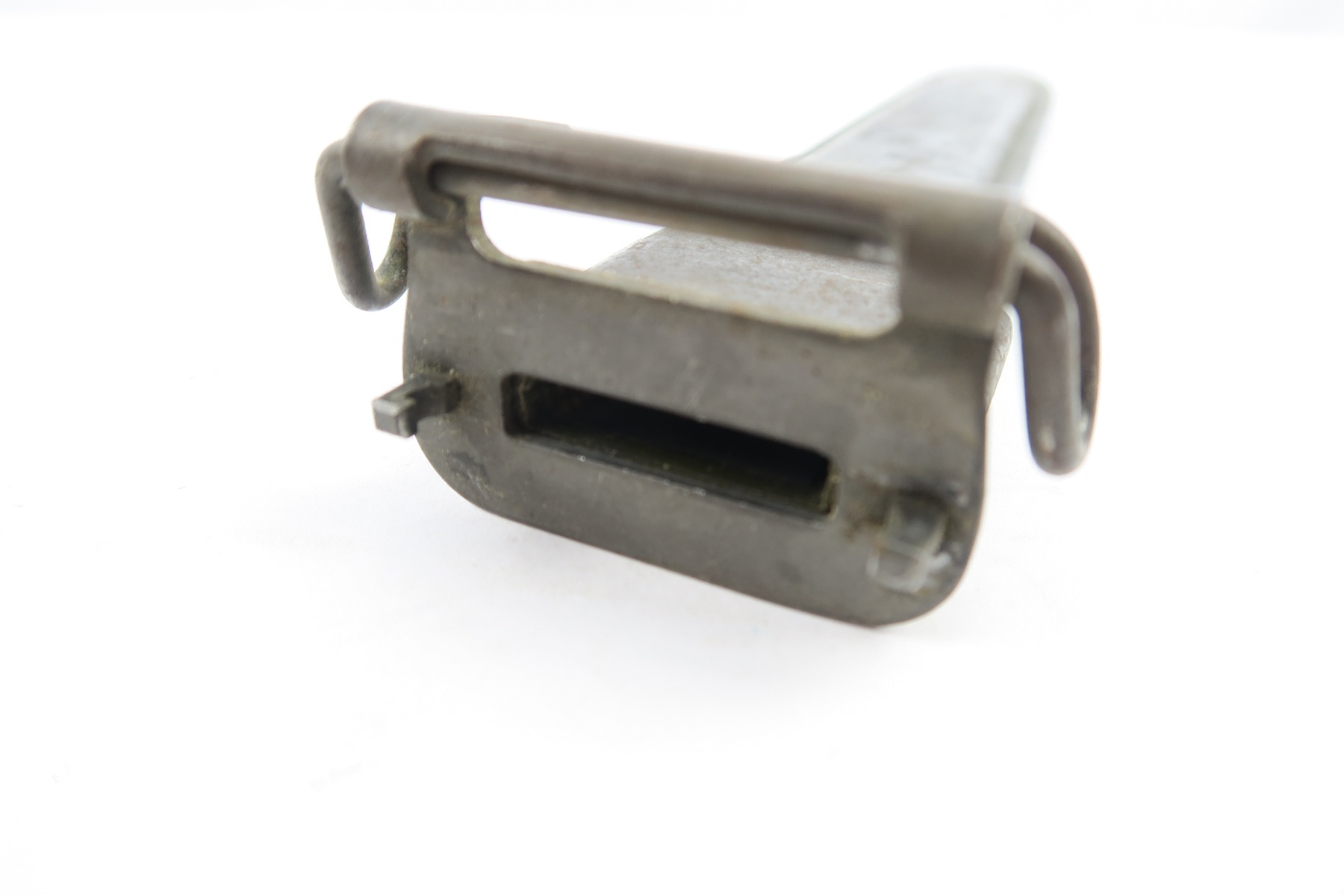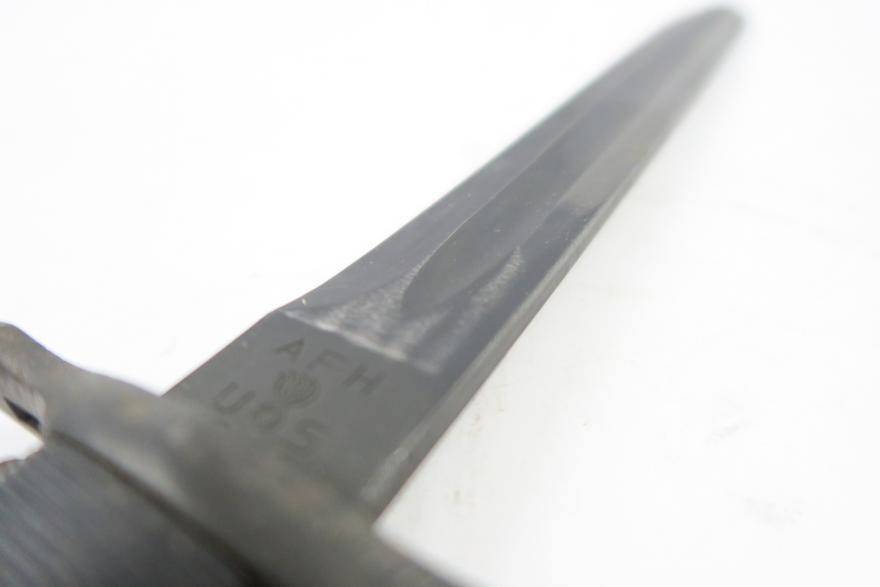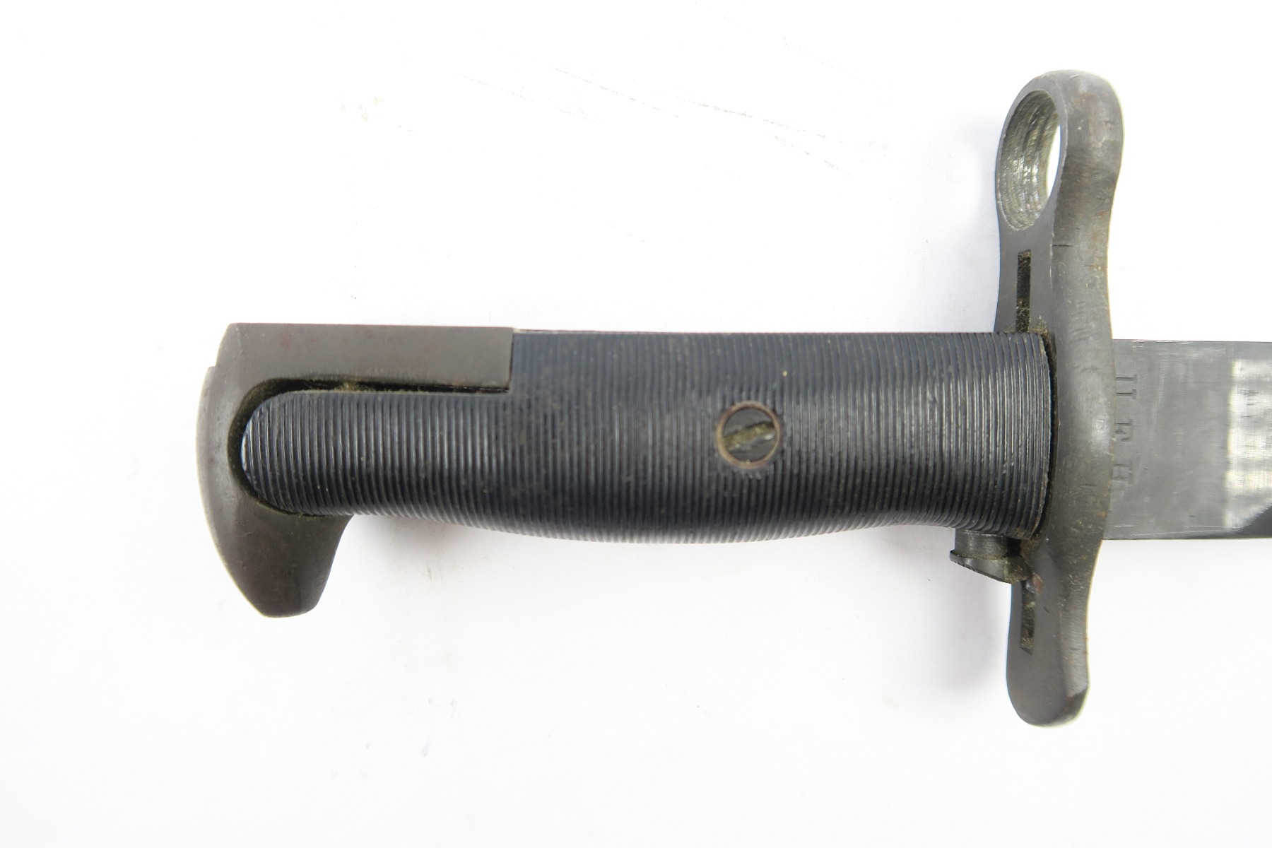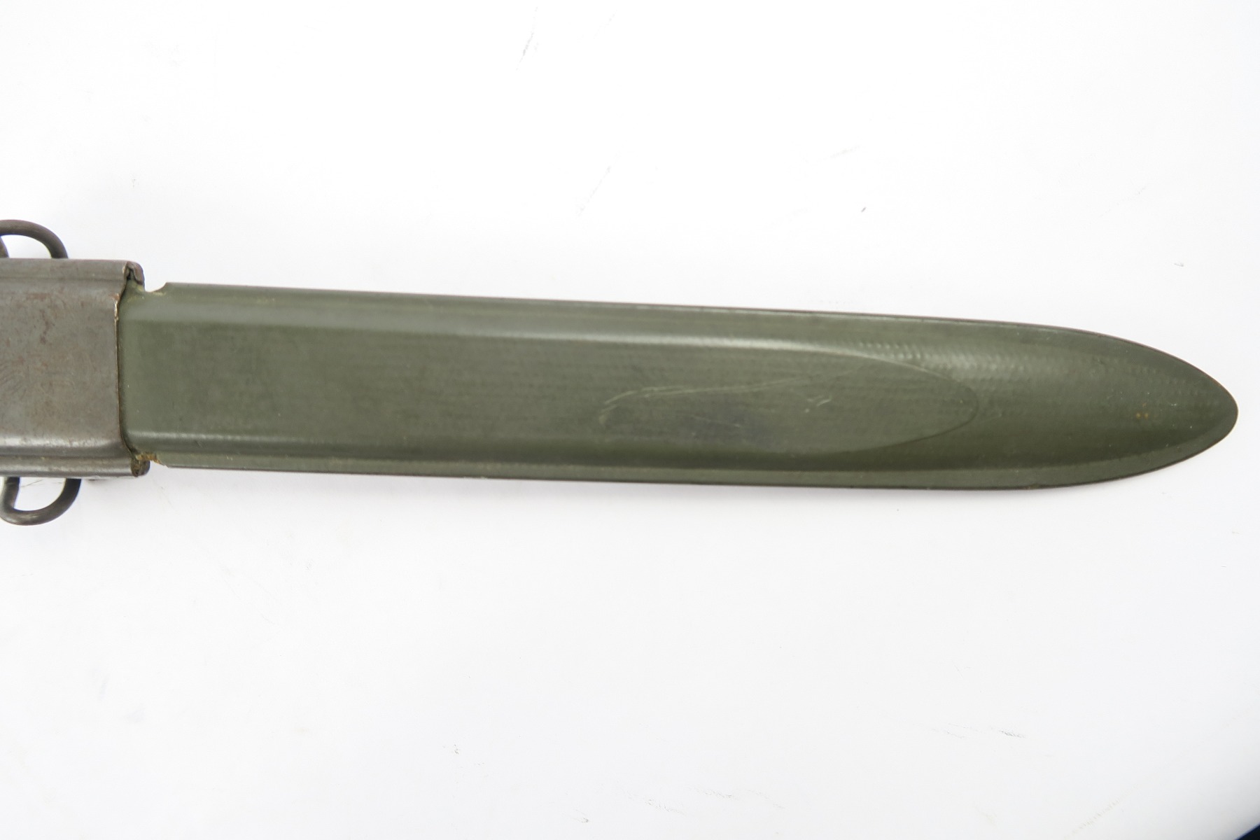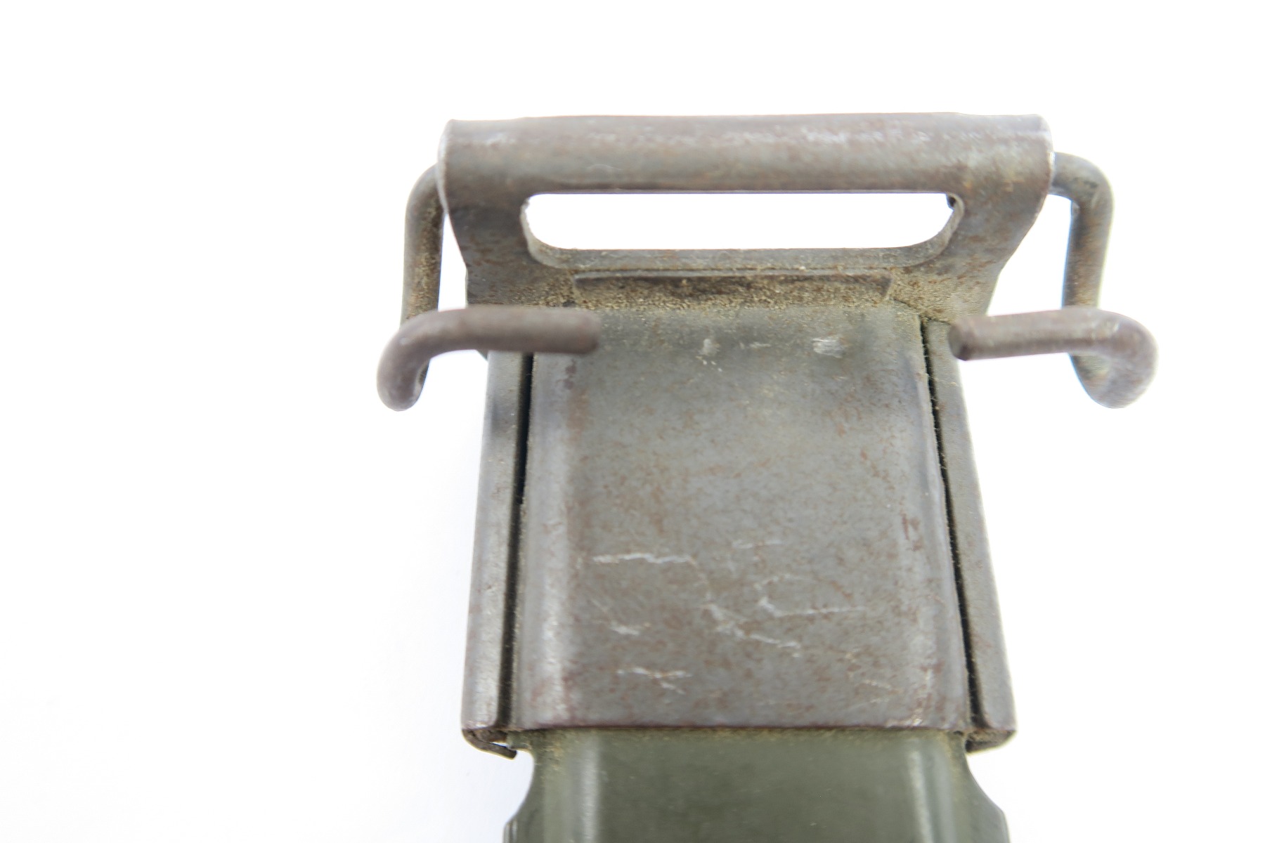 5/2/18 – This is an original 1943 dated M1 garand bayonet. The bayonet has been cut, as was done by the arsenals during WW2. The blade is excellent and unsharpened, maker stamped AFH with a US flaming bomb and 1943 date. The reverse side is UFH stamped. The handle is also excellent with no cracks or chips. The scabbard is original as well and it looks like someone painted their name on the back with a stencil “STUMPH” (?). Guaranteed all original and authentic.