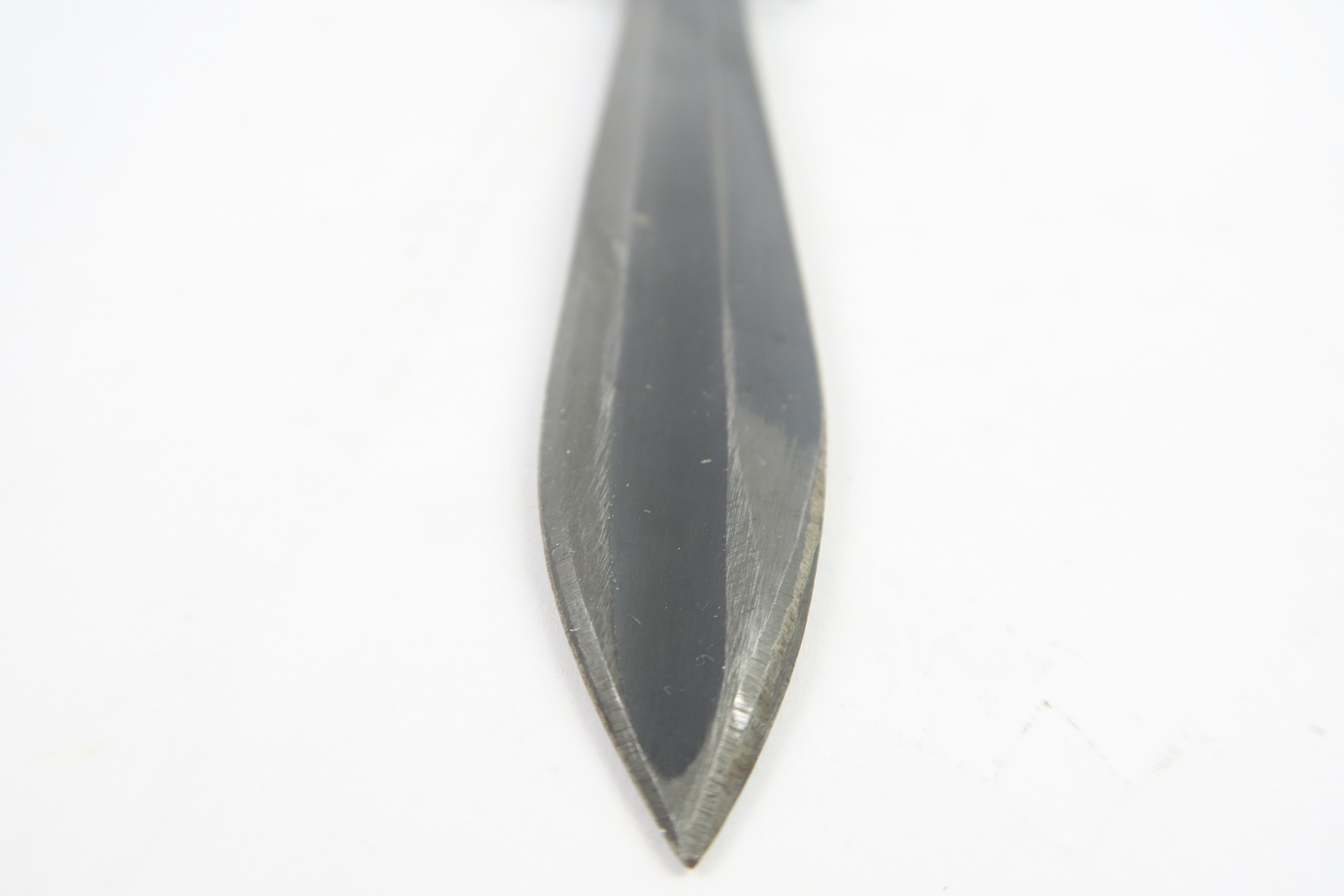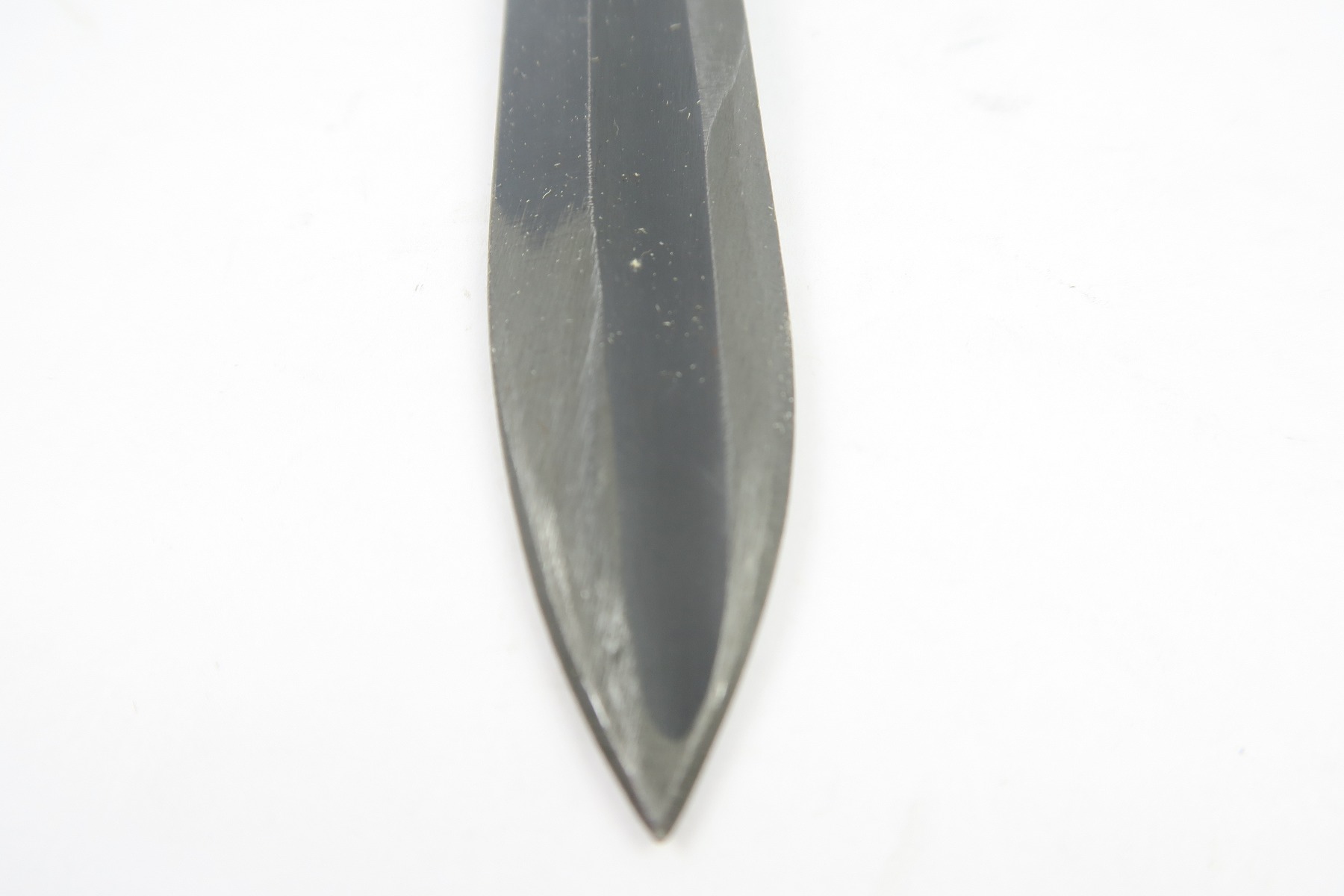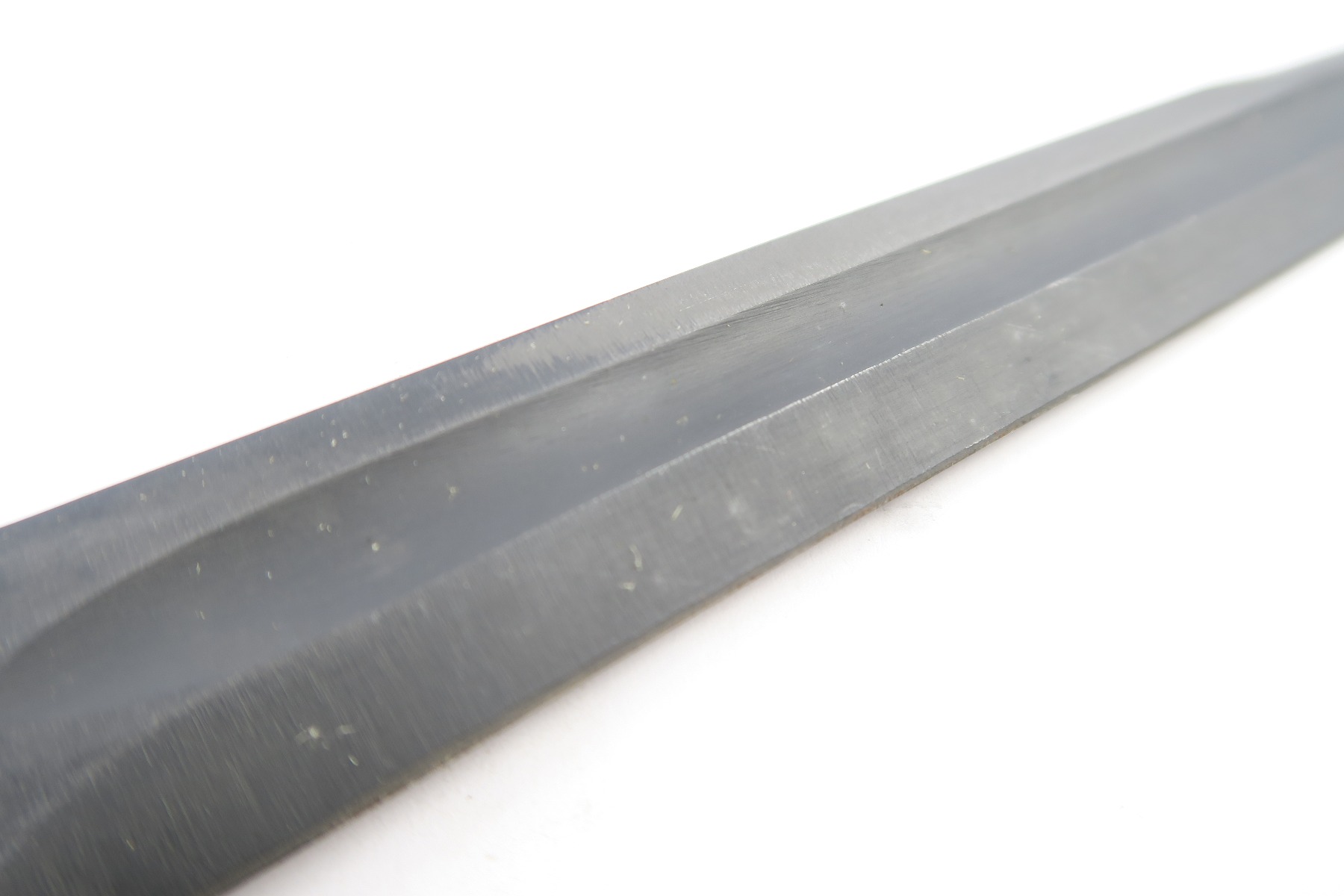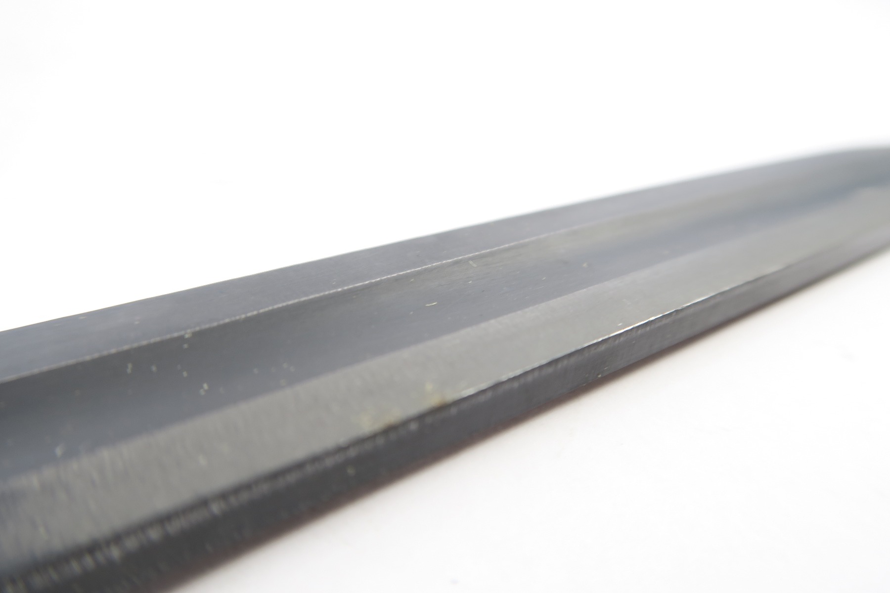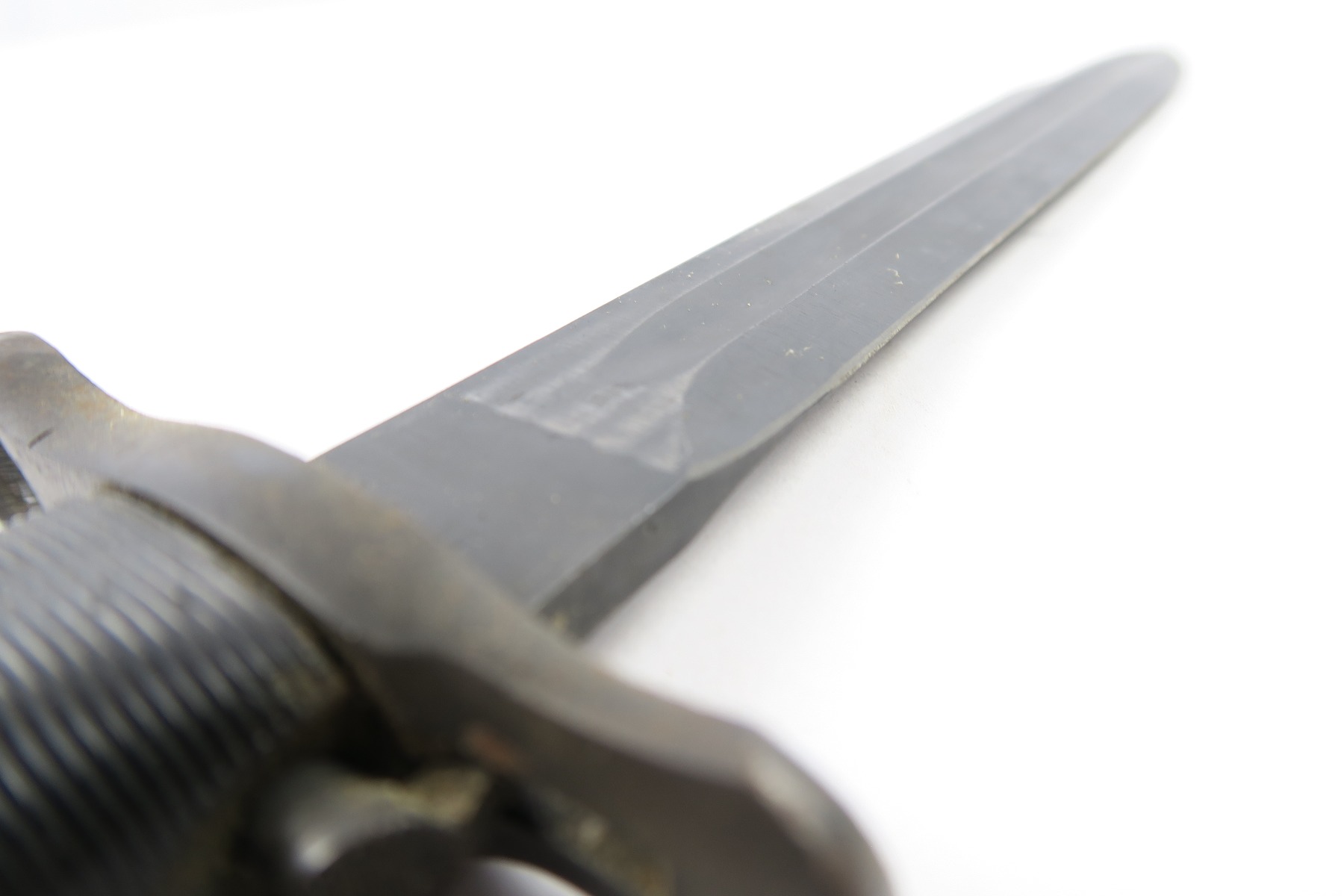 5/2/18 – This is an original 1943 dated M1 garand bayonet. The bayonet has been cut, as was done by the arsenals during WW2. The blade is excellent and unsharpened, maker stamped AFH with a US flaming bomb and 1943 date. The reverse side is UFH stamped. The handle is also excellent with no cracks or chips. The scabbard is original as well and it looks like someone painted their name on the back with a stencil “STUMPH” (?). Guaranteed all original and authentic.