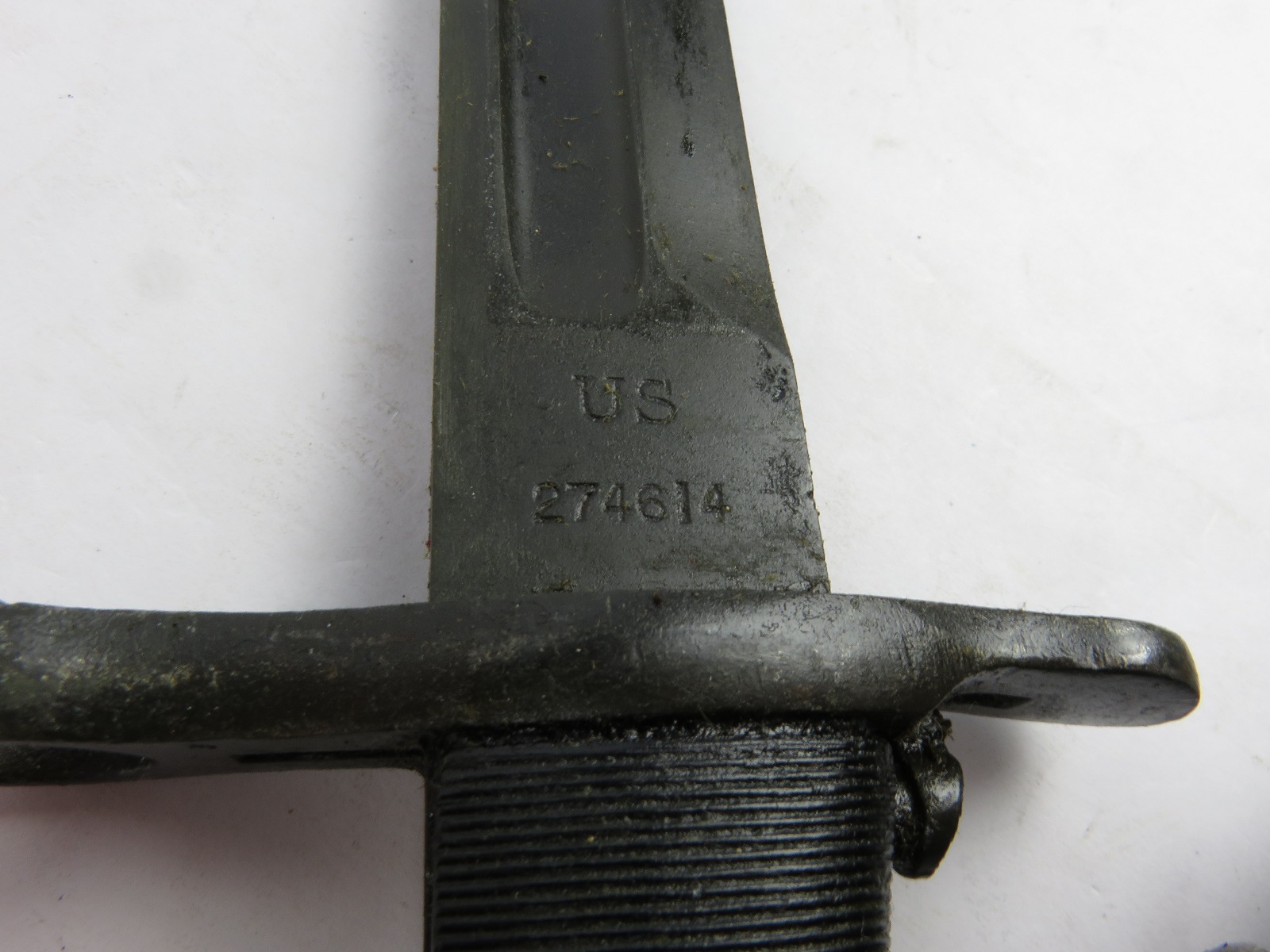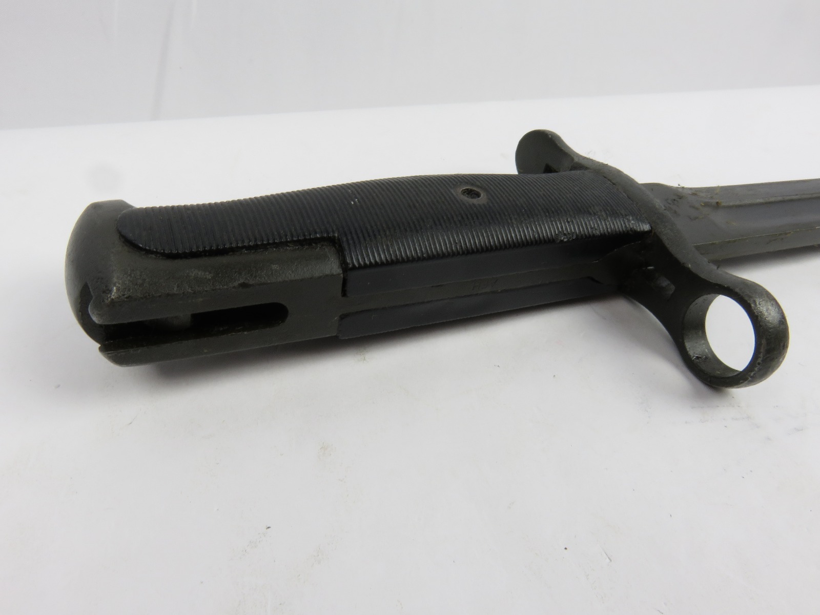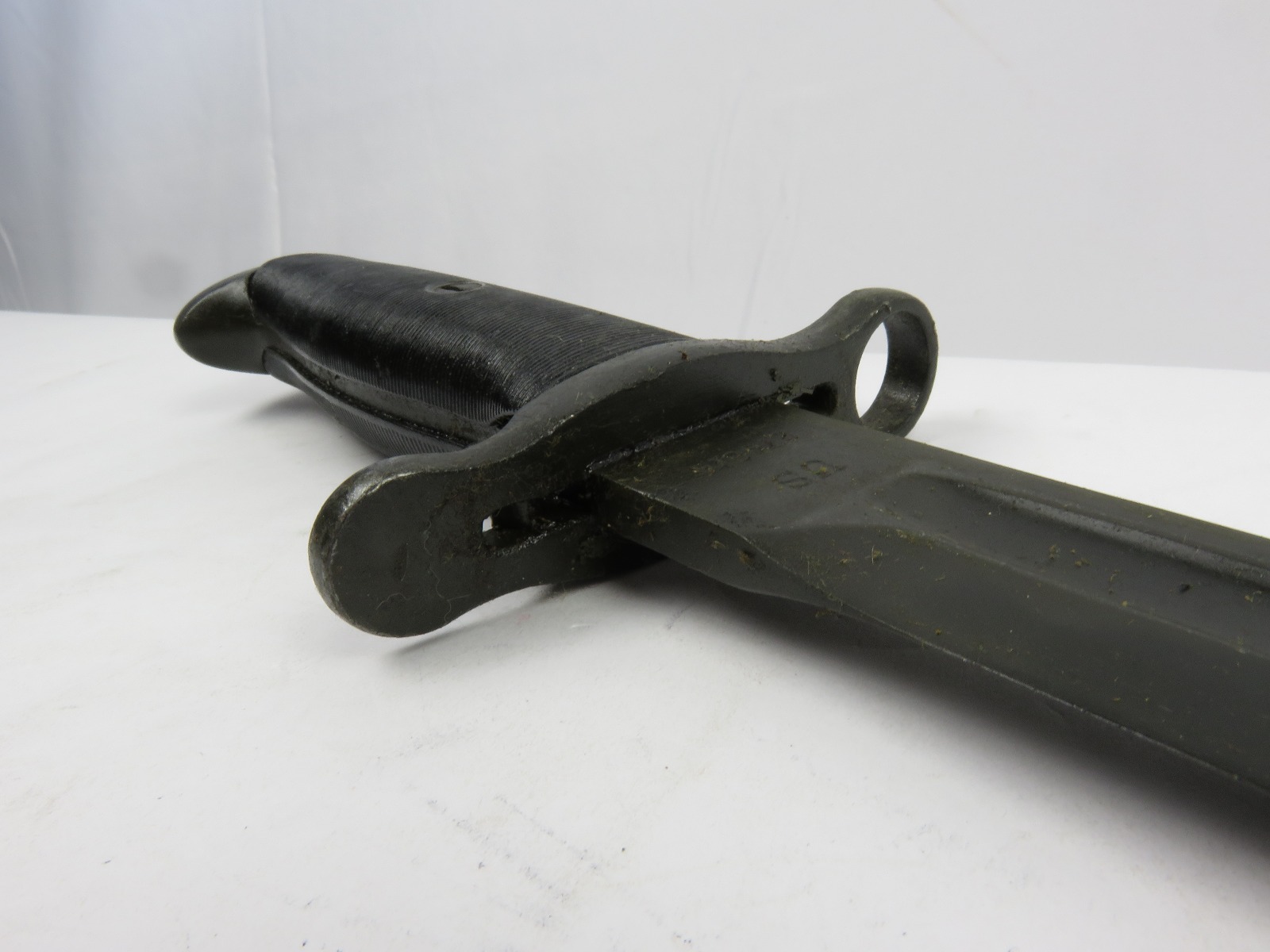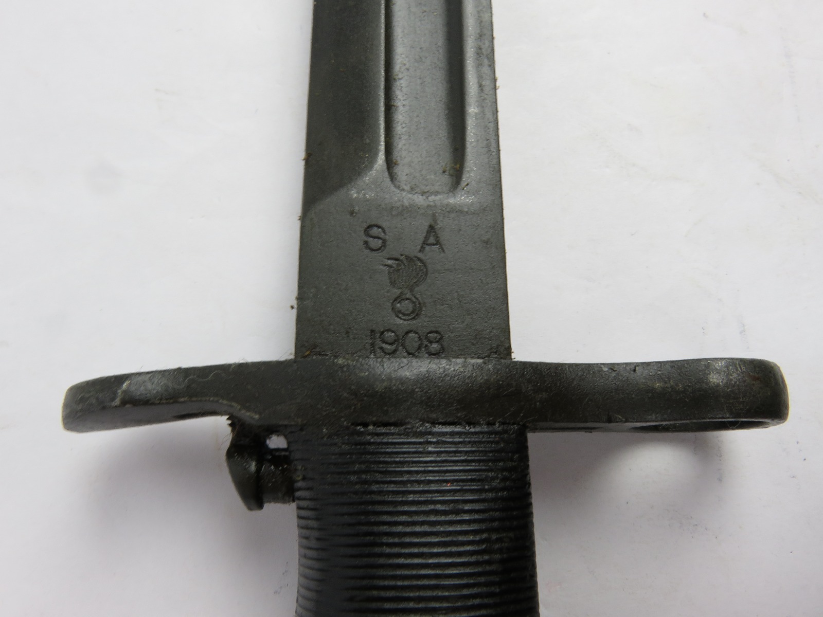 12/13/17 – This is an original WW1 Springfield Armory bayonet made for the 1903 Springfield rifle, but then was later cut down and re-issued for use with the M1 Garand during WW2. The bayonet is stamped “S A” with a flaming bomb and 1908 date stamp. The reverse side is “US” proof stamped with a serial number underneath. The blade looks unsharpened and overall in great shape, except there’s some light residue on the blade (this can be easily wiped clean). The handle has no cracks or chips. Guaranteed original.