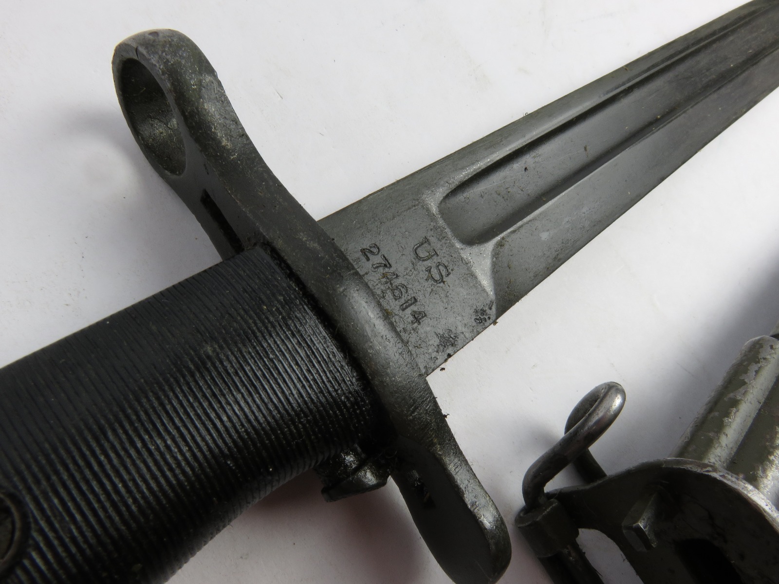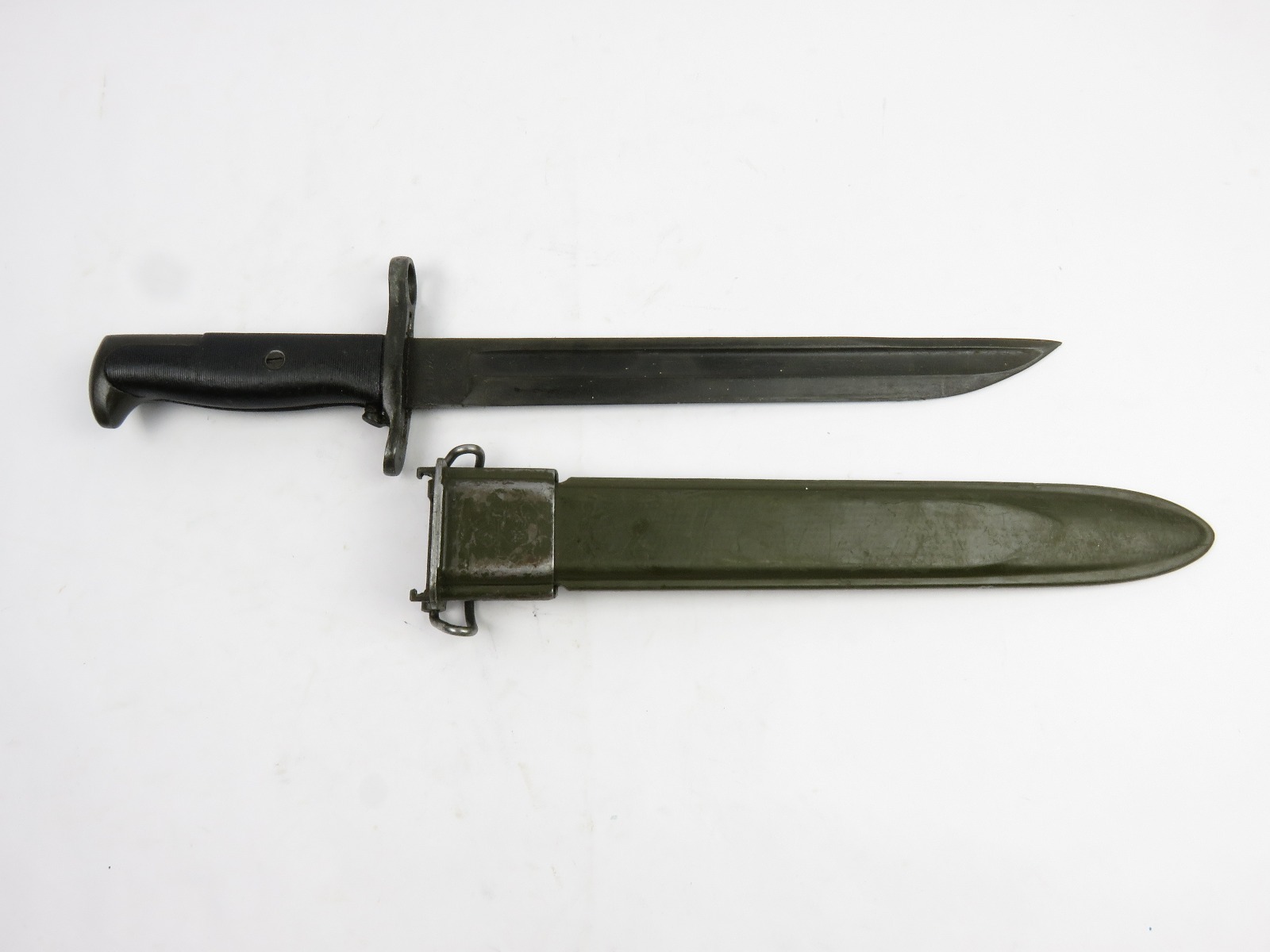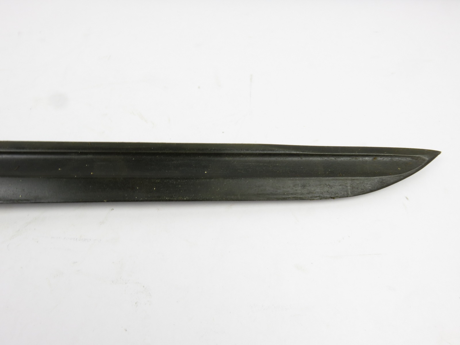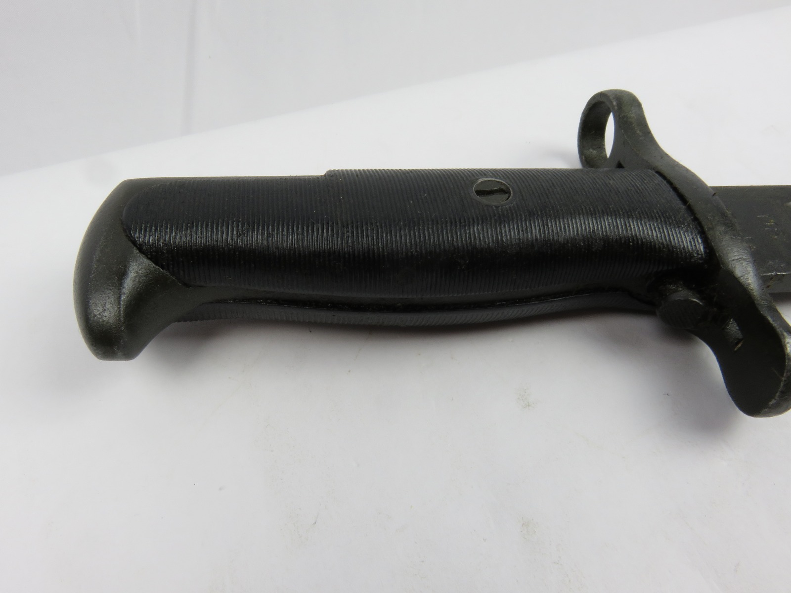 12/13/17 – This is an original WW1 Springfield Armory bayonet made for the 1903 Springfield rifle, but then was later cut down and re-issued for use with the M1 Garand during WW2. The bayonet is stamped “S A” with a flaming bomb and 1908 date stamp. The reverse side is “US” proof stamped with a serial number underneath. The blade looks unsharpened and overall in great shape, except there’s some light residue on the blade (this can be easily wiped clean). The handle has no cracks or chips. Guaranteed original.