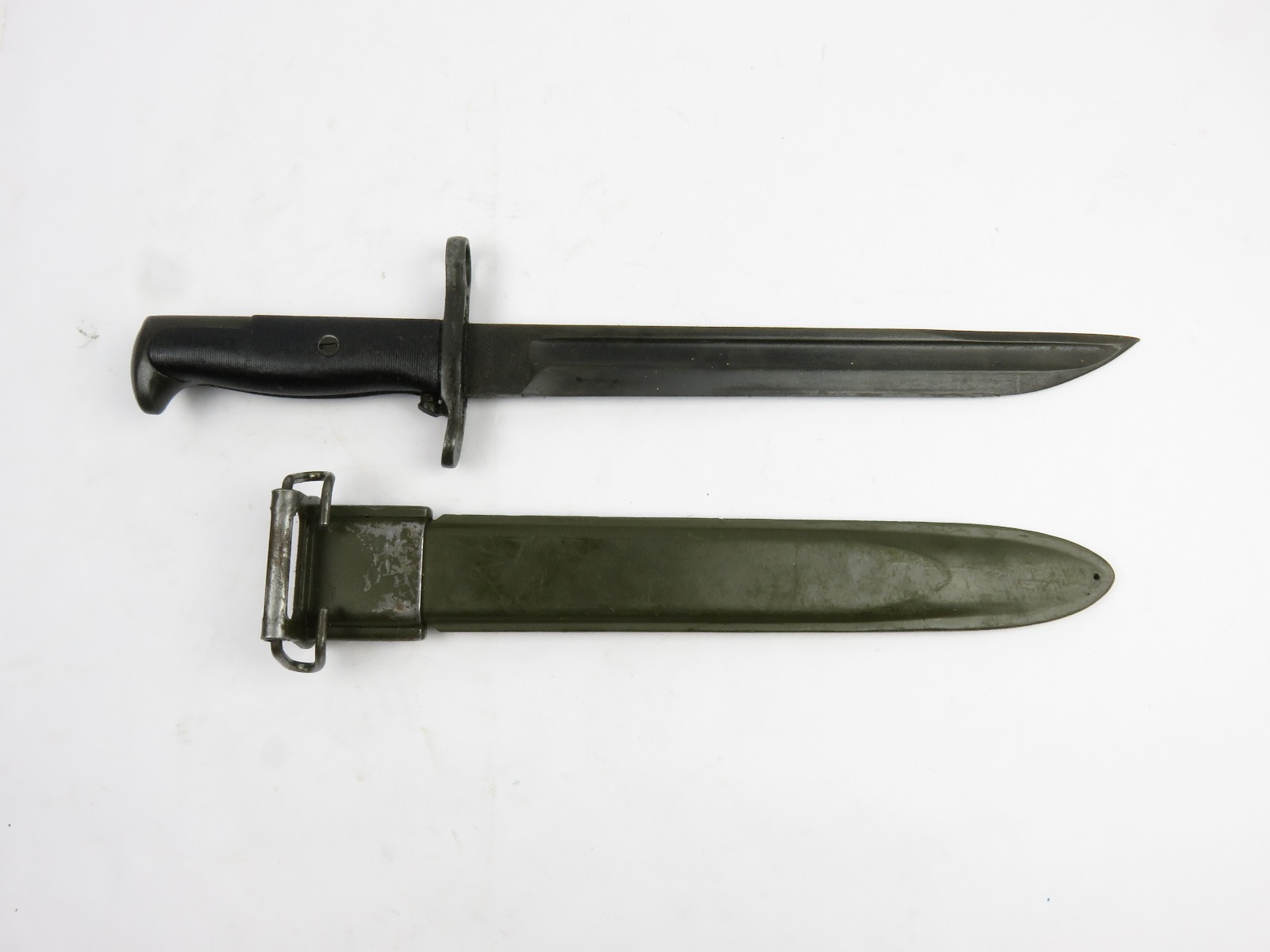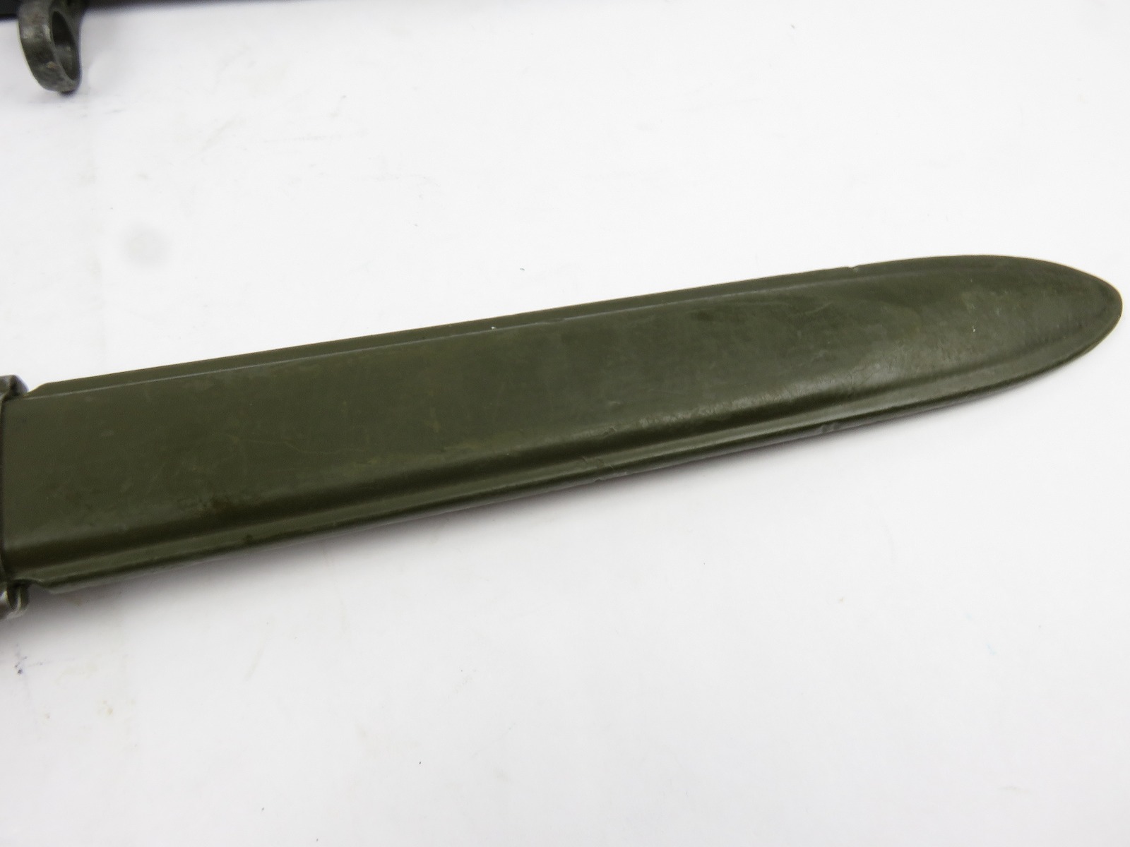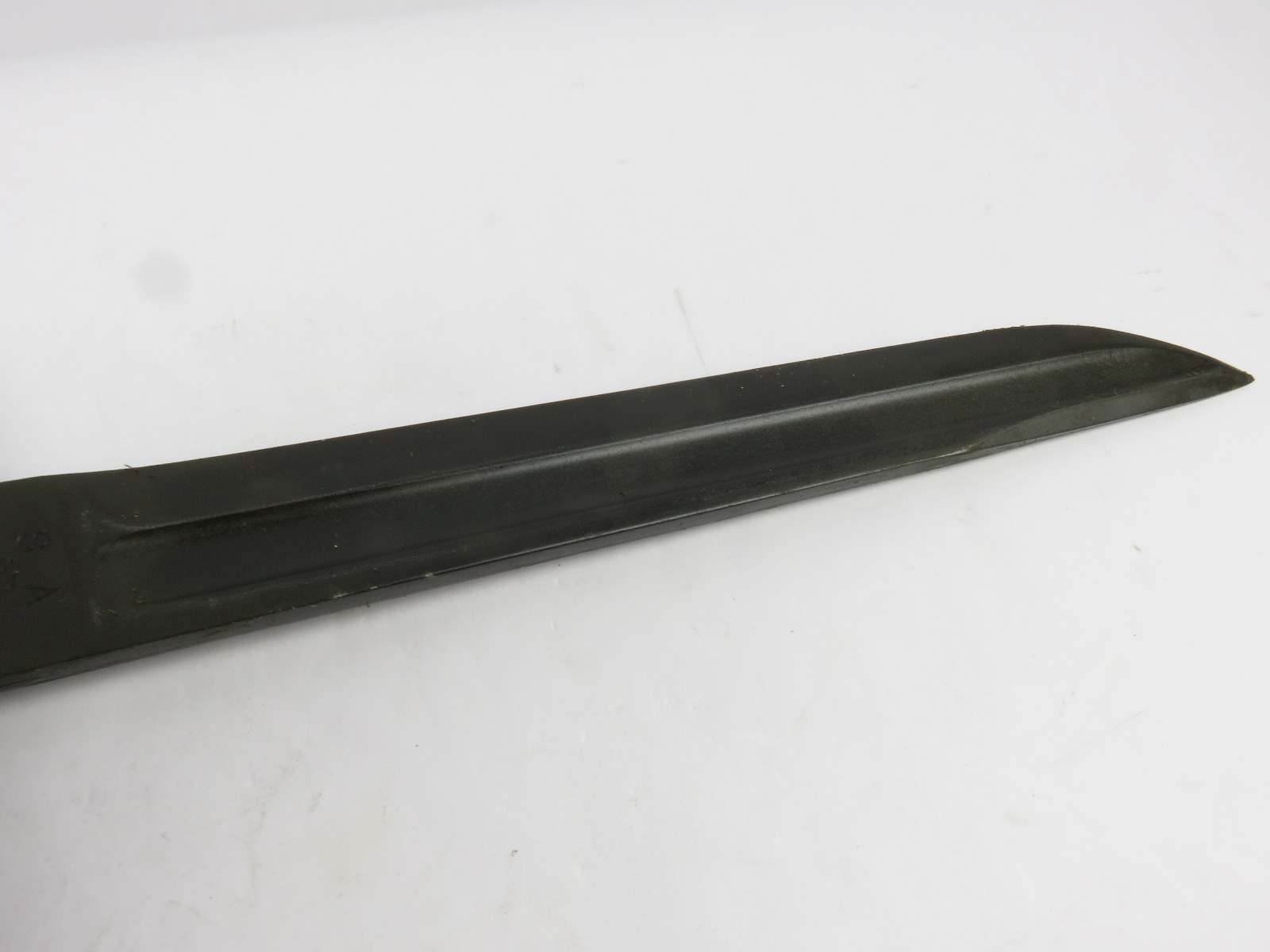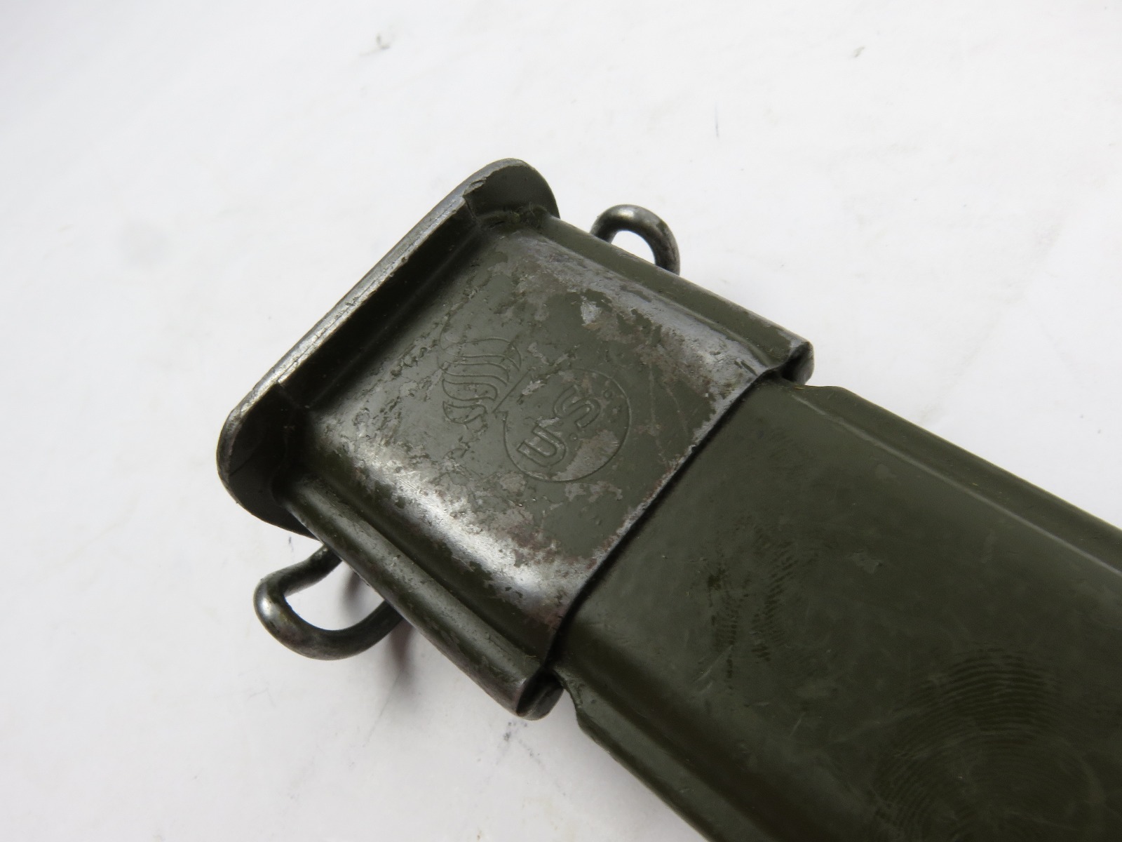 12/13/17 – This is an original WW1 Springfield Armory bayonet made for the 1903 Springfield rifle, but then was later cut down and re-issued for use with the M1 Garand during WW2. The bayonet is stamped “S A” with a flaming bomb and 1908 date stamp. The reverse side is “US” proof stamped with a serial number underneath. The blade looks unsharpened and overall in great shape, except there’s some light residue on the blade (this can be easily wiped clean). The handle has no cracks or chips. Guaranteed original.