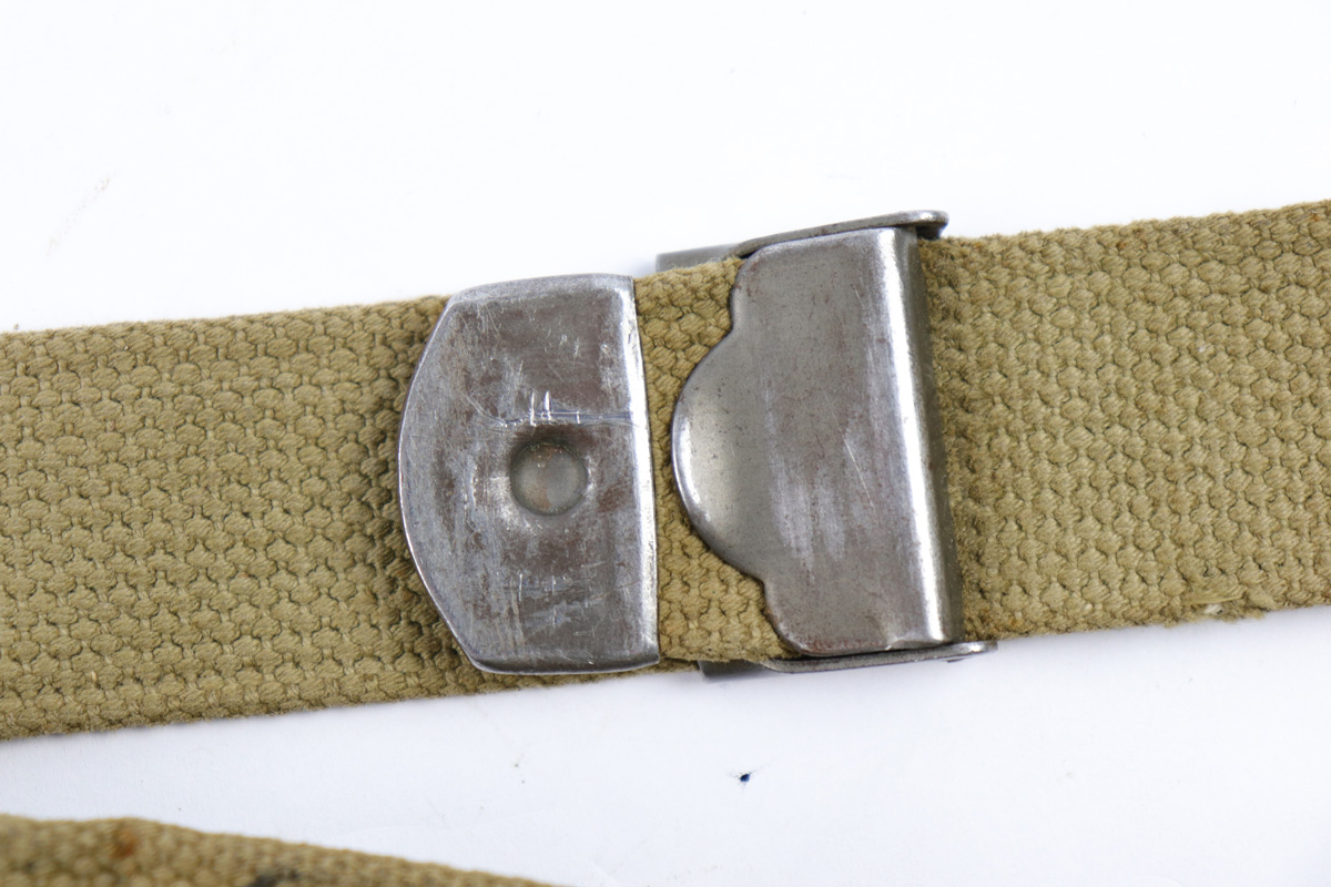 3/10/20 – This is an original WW2 M1 Garand canvas rifle sling. The strap is in excellent condition with no fraying or damage, but the ink stamps are worn and hard to read. We don’t know the maker because of this, but the date does look like 1944. The metal has some light oil stains but overall in excellent condition.