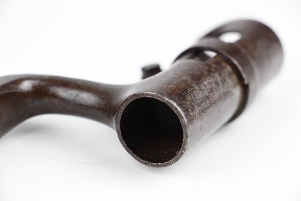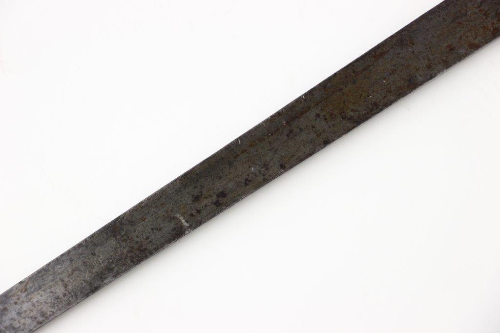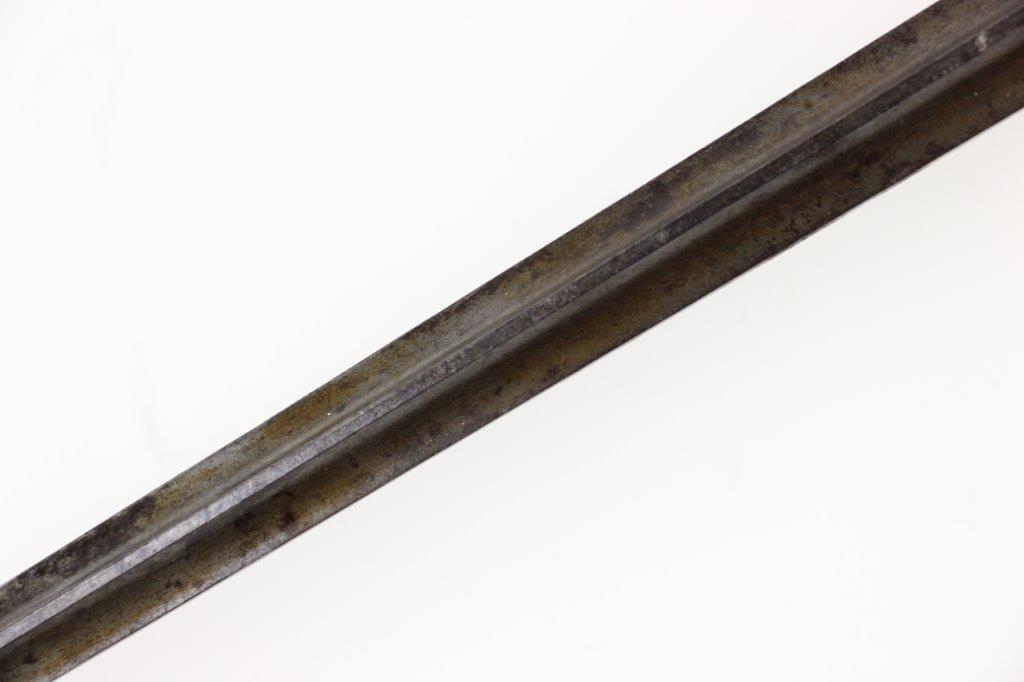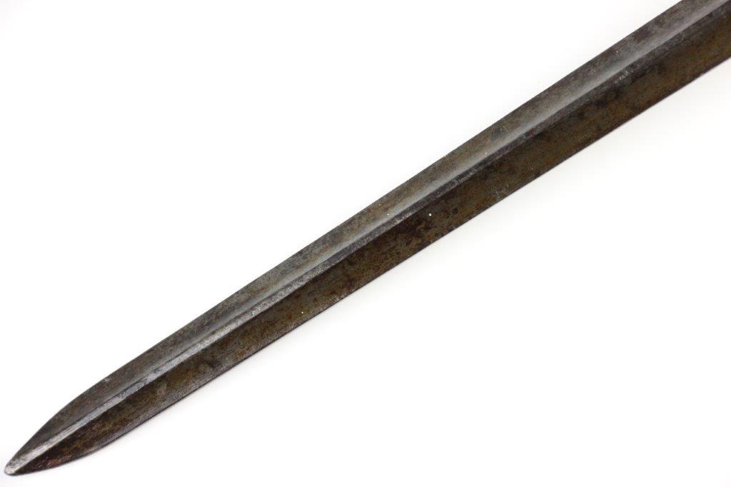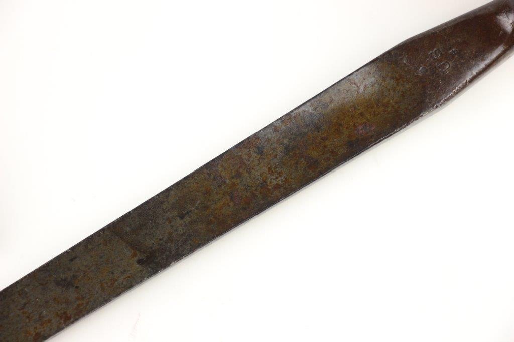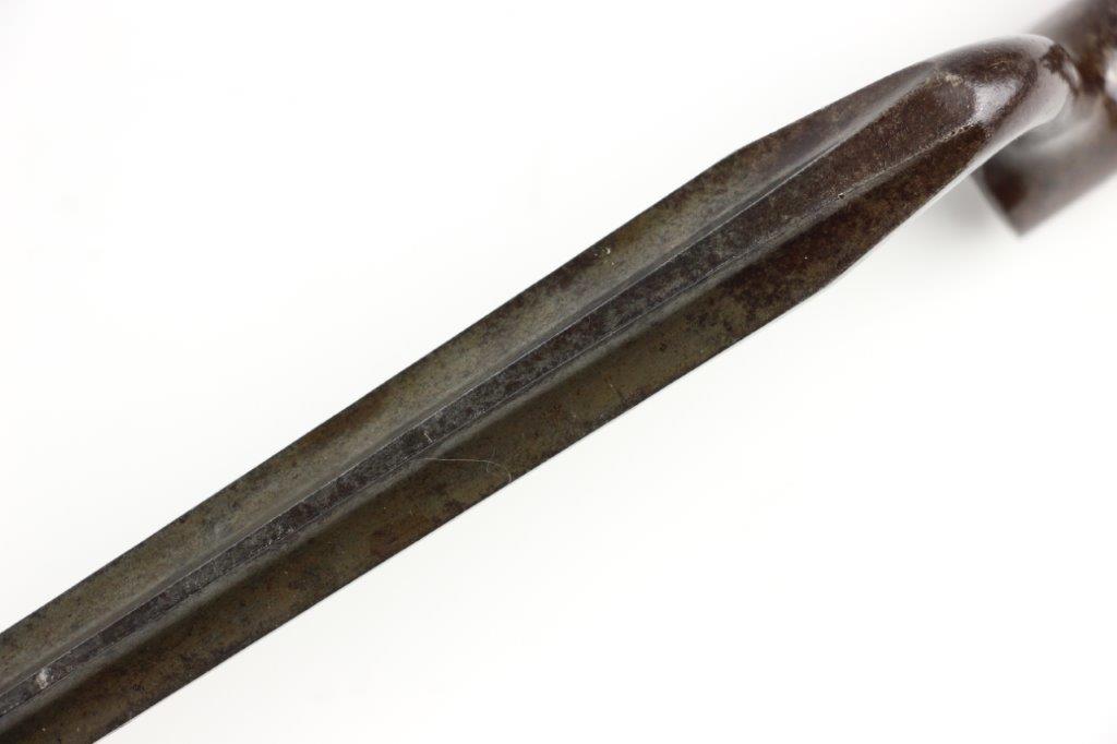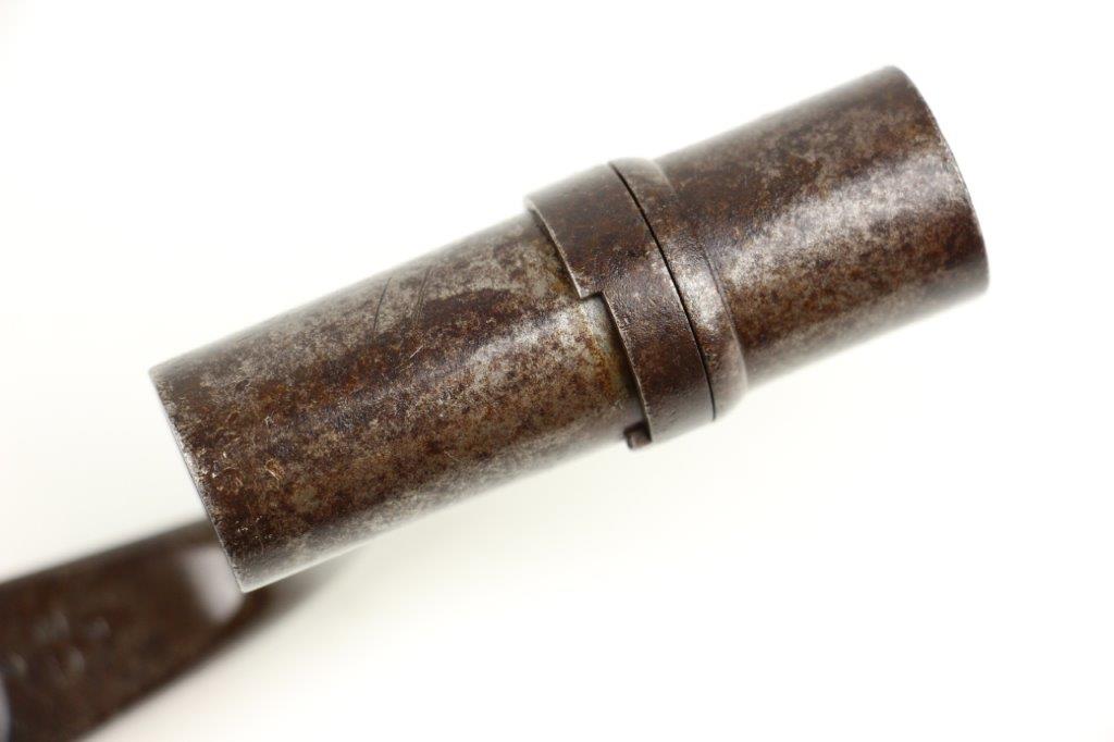 7/10/24 – This is a Civil War era Socket / Spike Bayonet by Springfield. The bayonet blade is 18 inches long with an overall length of 21 inches. The triangular blade has minimal surface scratches and no notable dings or dents along the edges. There’s natural, dark surface patina and aging throughout but great overall condition considering its age. The blade ricasso is clearly marked “US” with a smaller “S” underneath for Springfield manufacture. The original locking ring is fully functional and intact.