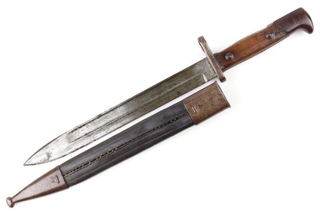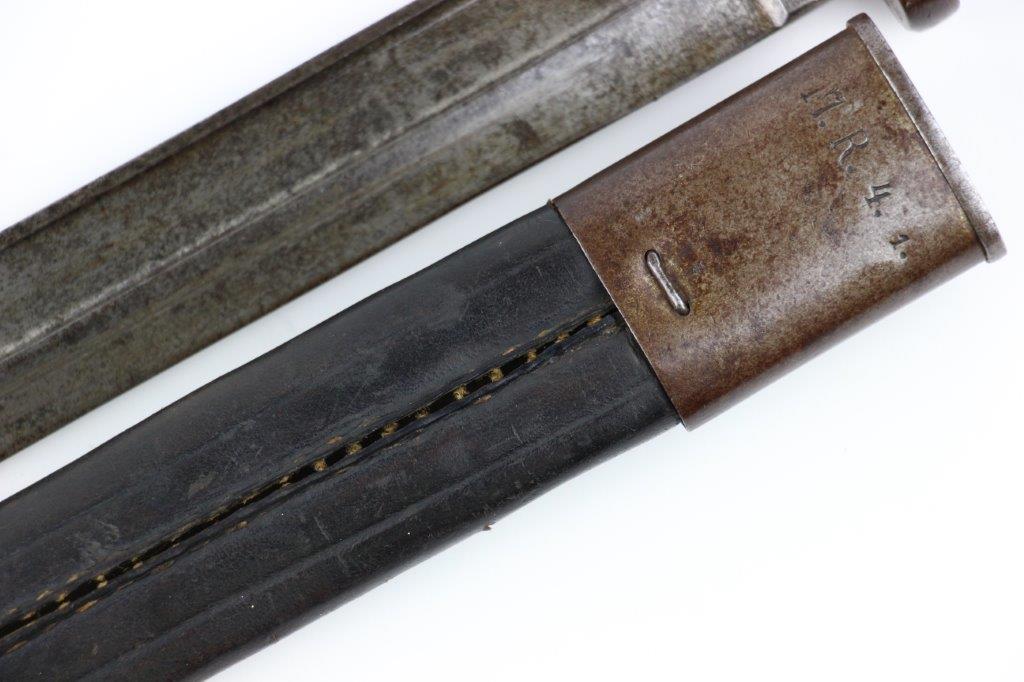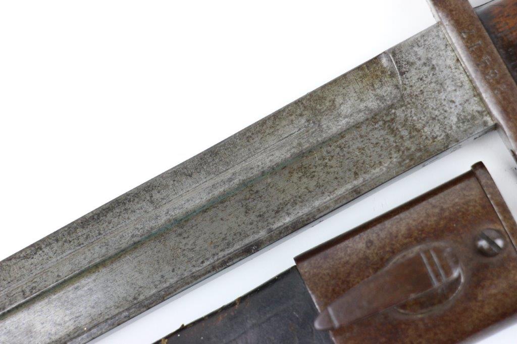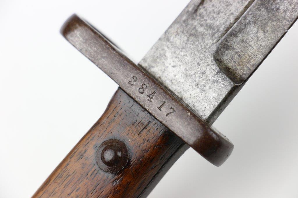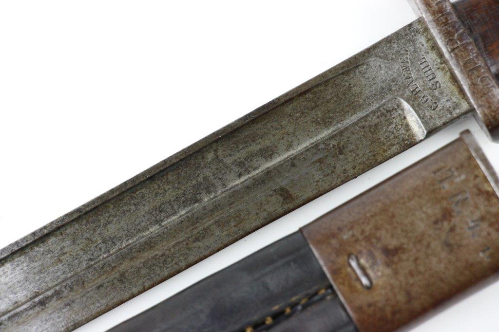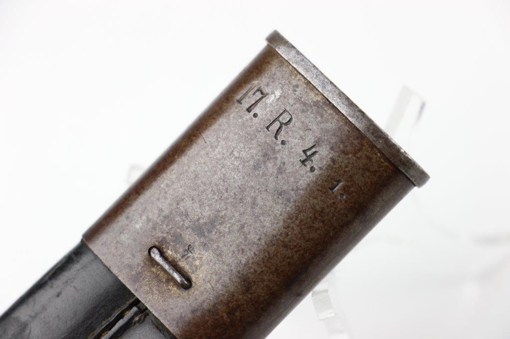 6/9/24 – This is a rare, pre WW1 German M1871 / M1884 Rifle Bayonet. The bayonet comes with an original scabbard. Both the scabbard and the hand guard are regimentally marked. The bayonet blade measures about 25cm long, with overall length of 37.5cm. The blade shows natural patina and surface oxidation throughout. The edge shows signs of sharpening and use wear with a few small nicks, mostly near the tip. The spine is Imperial proof stamped and 1888 dated. Nice natural patina throughout the hand guard and pommel. Original wood handles are in great condition with some minor bruises and dents but no cracks or chips. The scabbard shows natural patina and the stitching is separated on the back seam, but the leather and scabbard is still completely intact and firm / functional. Great overall condition for its age.