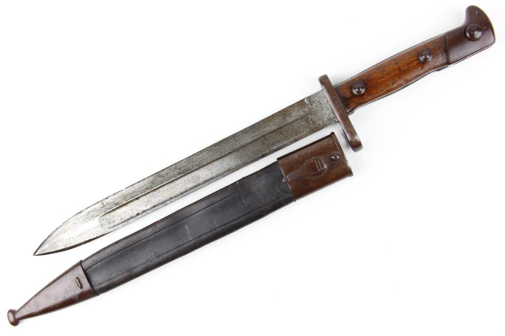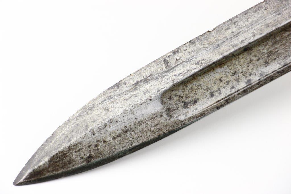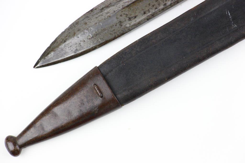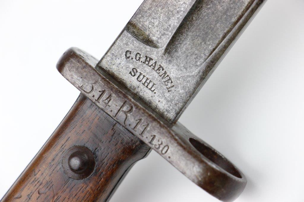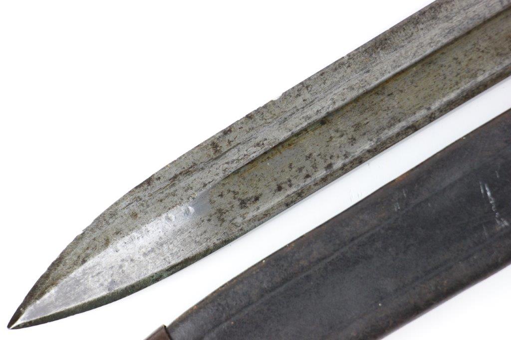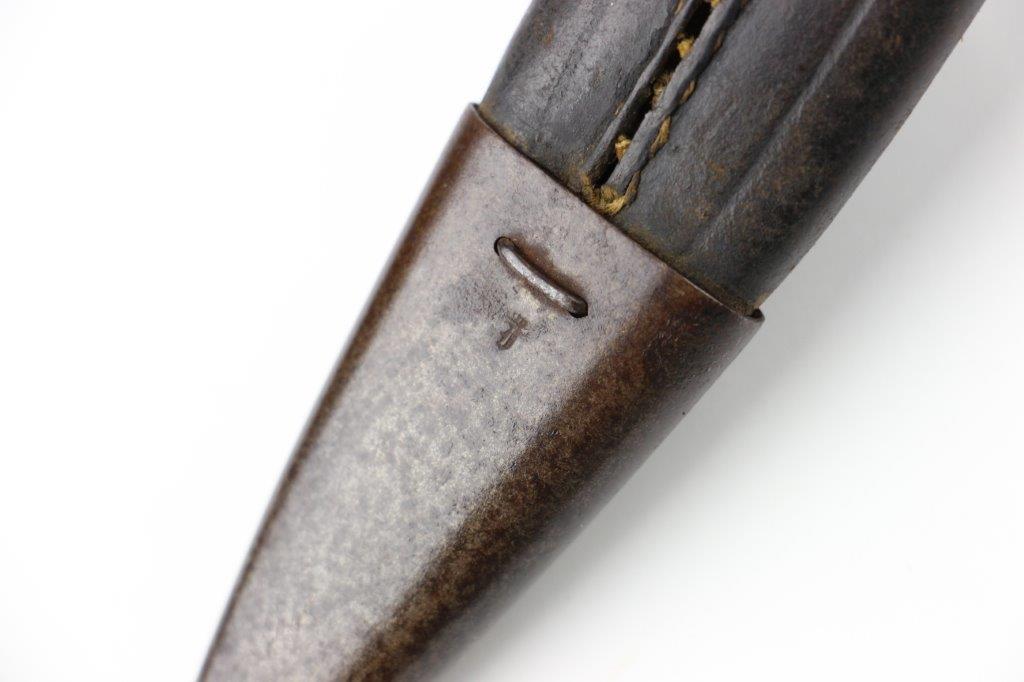 6/9/24 – This is a rare, pre WW1 German M1871 / M1884 Rifle Bayonet. The bayonet comes with an original scabbard. Both the scabbard and the hand guard are regimentally marked. The bayonet blade measures about 25cm long, with overall length of 37.5cm. The blade shows natural patina and surface oxidation throughout. The edge shows signs of sharpening and use wear with a few small nicks, mostly near the tip. The spine is Imperial proof stamped and 1888 dated. Nice natural patina throughout the hand guard and pommel. Original wood handles are in great condition with some minor bruises and dents but no cracks or chips. The scabbard shows natural patina and the stitching is separated on the back seam, but the leather and scabbard is still completely intact and firm / functional. Great overall condition for its age.
