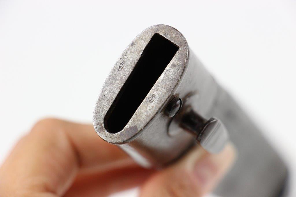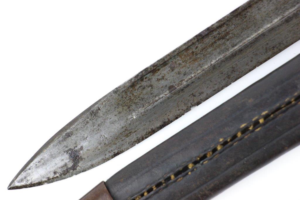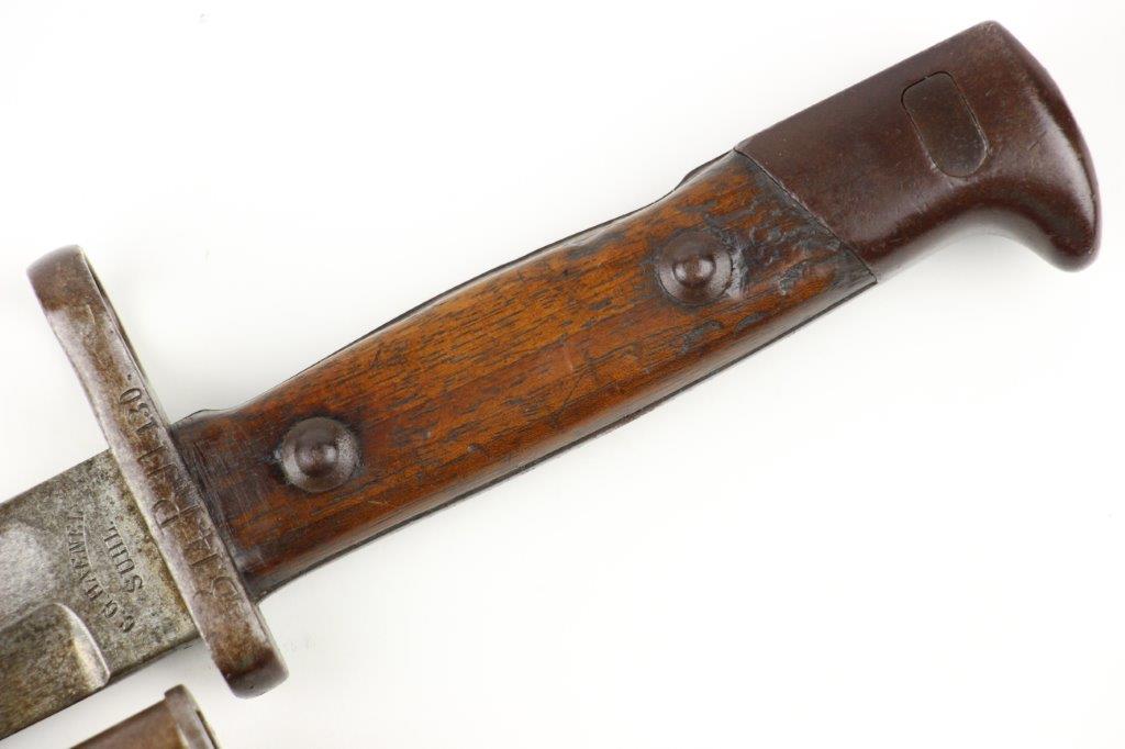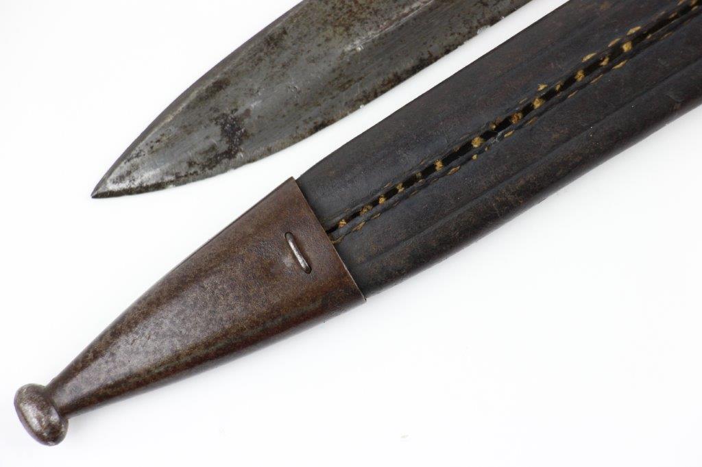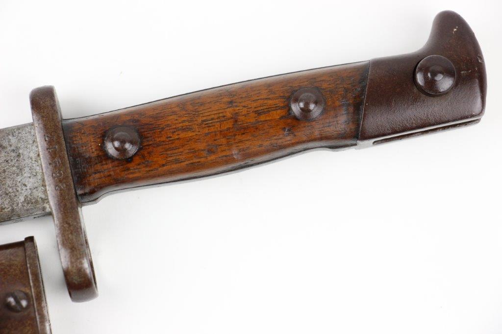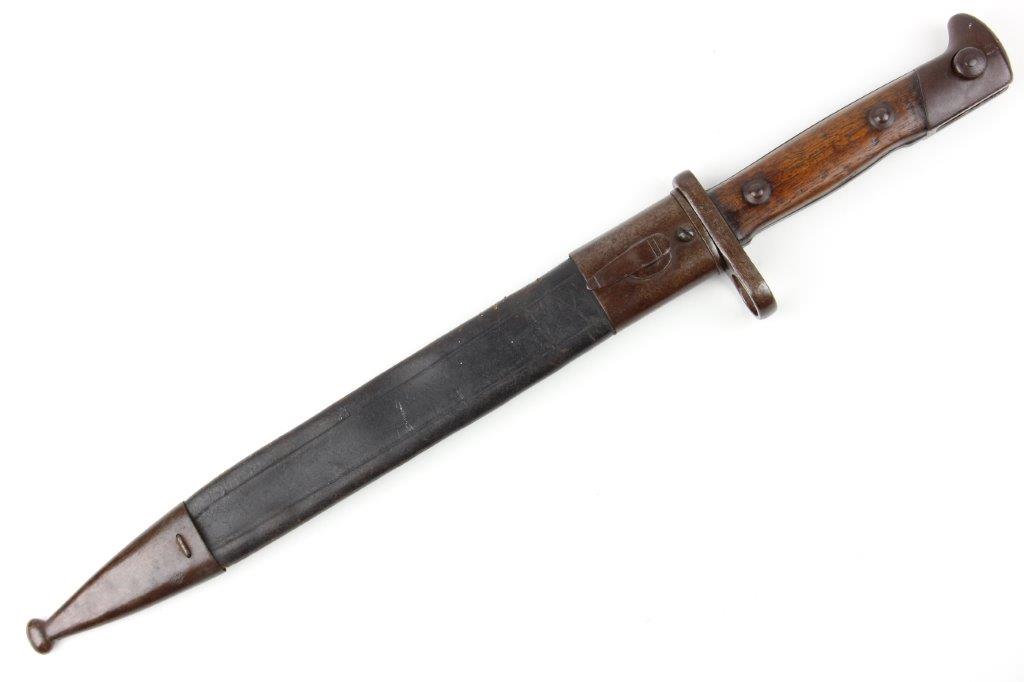6/9/24 – This is a rare, pre WW1 German M1871 / M1884 Rifle Bayonet. The bayonet comes with an original scabbard. Both the scabbard and the hand guard are regimentally marked. The bayonet blade measures about 25cm long, with overall length of 37.5cm. The blade shows natural patina and surface oxidation throughout. The edge shows signs of sharpening and use wear with a few small nicks, mostly near the tip. The spine is Imperial proof stamped and 1888 dated. Nice natural patina throughout the hand guard and pommel. Original wood handles are in great condition with some minor bruises and dents but no cracks or chips. The scabbard shows natural patina and the stitching is separated on the back seam, but the leather and scabbard is still completely intact and firm / functional. Great overall condition for its age.