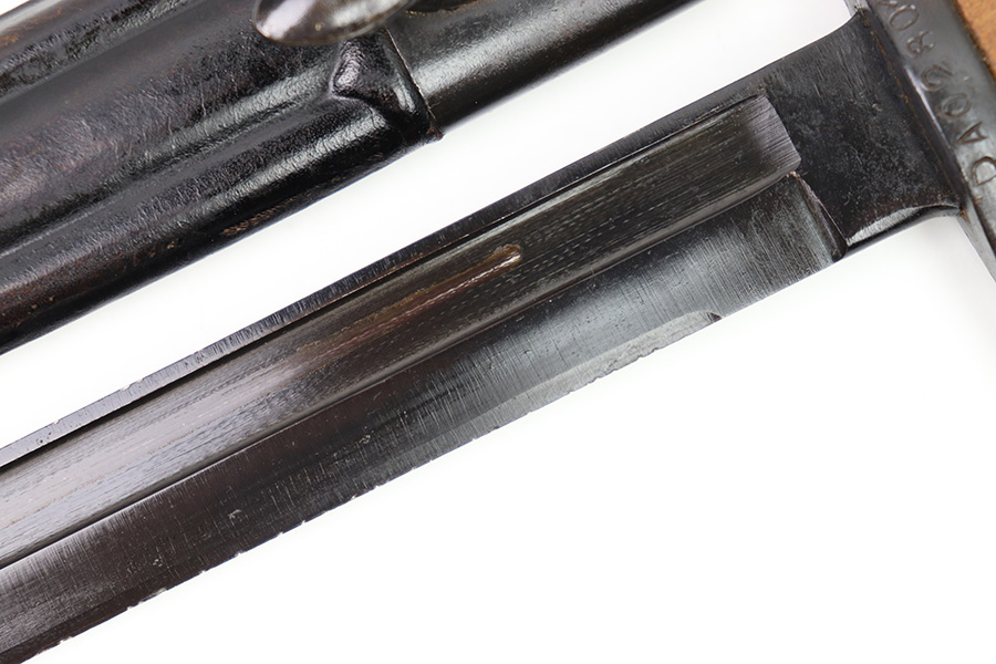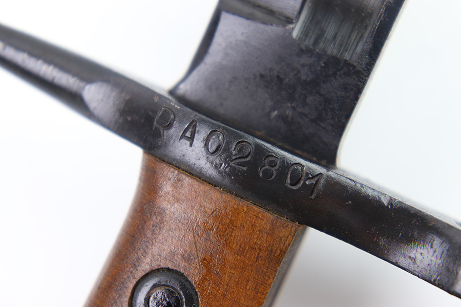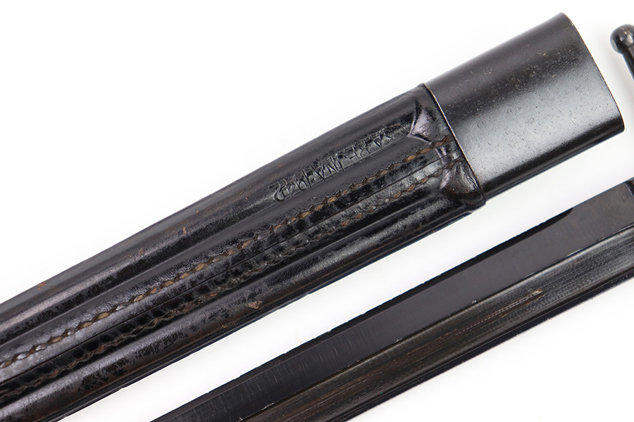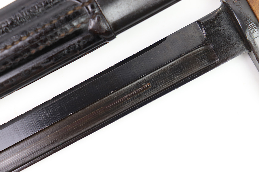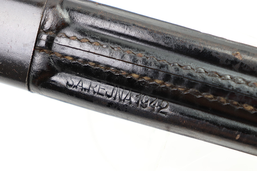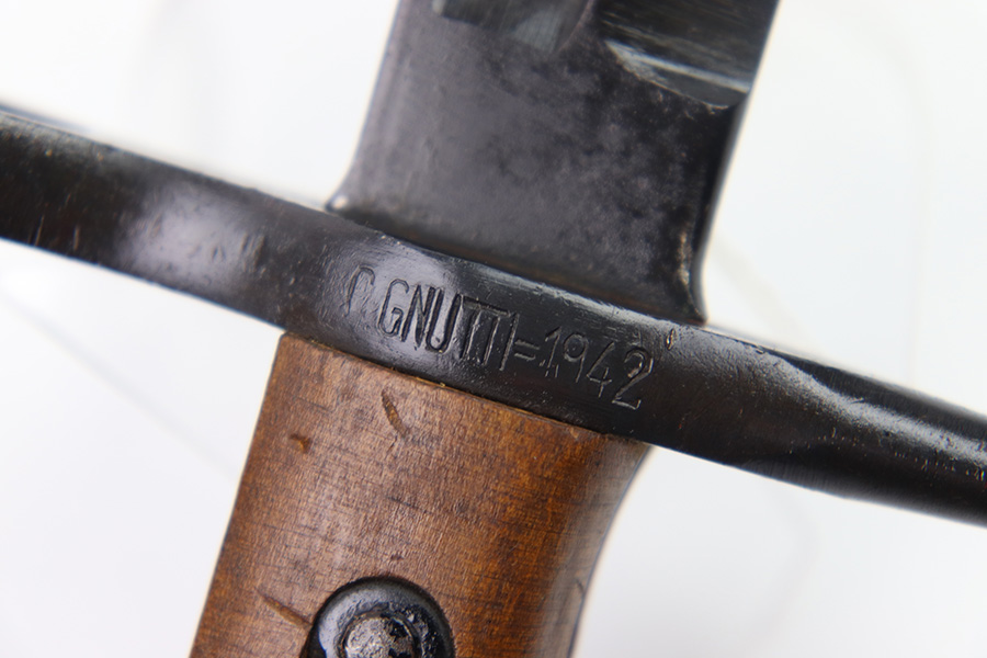 11/7/22 – This is an original 1942 dated Italian Carcano M1891 bayonet. The bayonet is in excellent condition with a beautiful blade that retains almost all of the original finish. There are a few mild dings along the edge, but no signs of sharpening and the only wear is some mild scabbard rub wear. The hand guard is maker stamped and dated “C. Gnutti 1942”. The other side of the hand guard is stamped “RA02801”. The wood handles are excellent as well with on cracks or chips. The scabbard is also in excellent overall condition with no major issues and very nice metal and leather body. The leather is maker stamped and dated “S.A. Rejna 1942”.