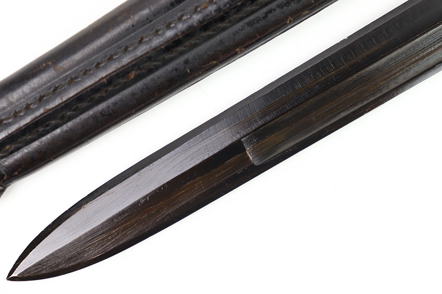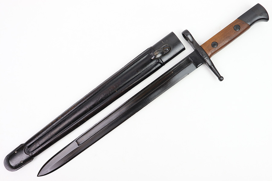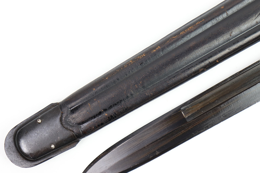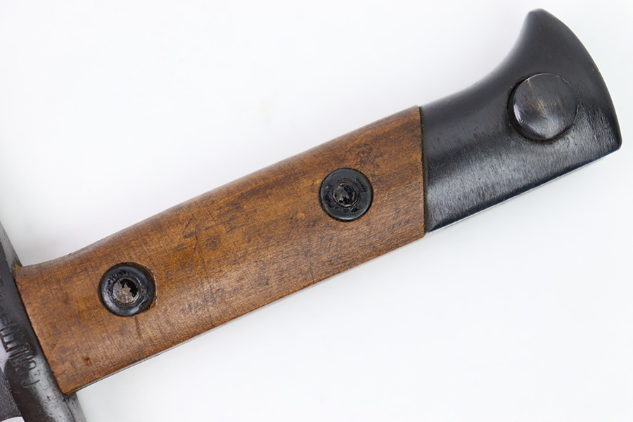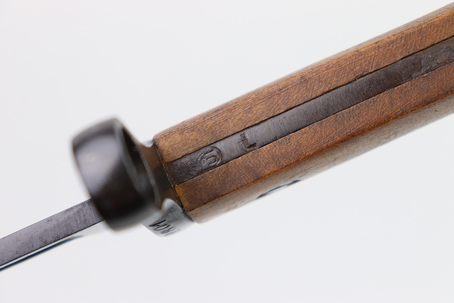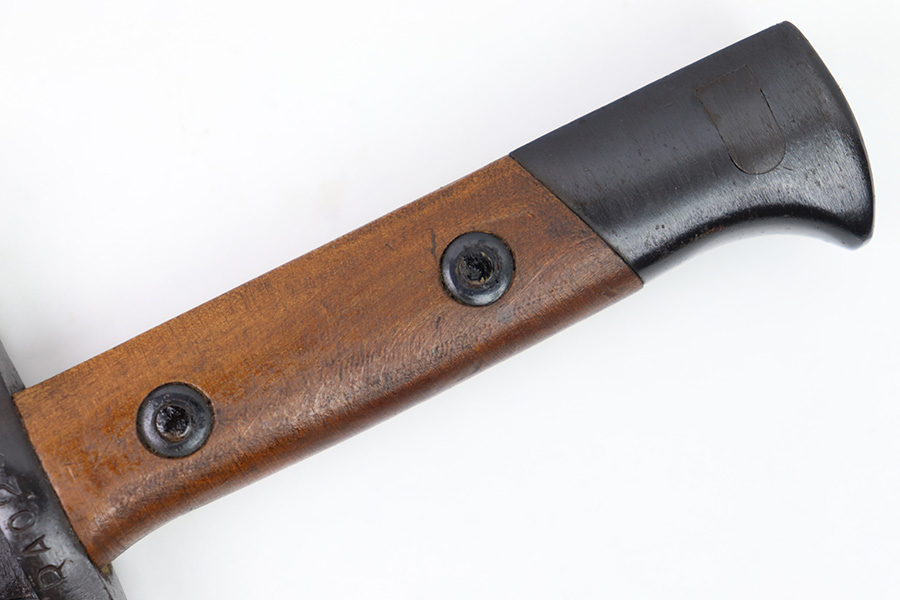 11/7/22 – This is an original 1942 dated Italian Carcano M1891 bayonet. The bayonet is in excellent condition with a beautiful blade that retains almost all of the original finish. There are a few mild dings along the edge, but no signs of sharpening and the only wear is some mild scabbard rub wear. The hand guard is maker stamped and dated “C. Gnutti 1942”. The other side of the hand guard is stamped “RA02801”. The wood handles are excellent as well with on cracks or chips. The scabbard is also in excellent overall condition with no major issues and very nice metal and leather body. The leather is maker stamped and dated “S.A. Rejna 1942”.