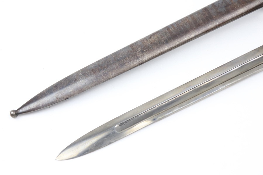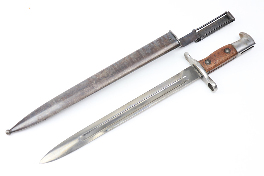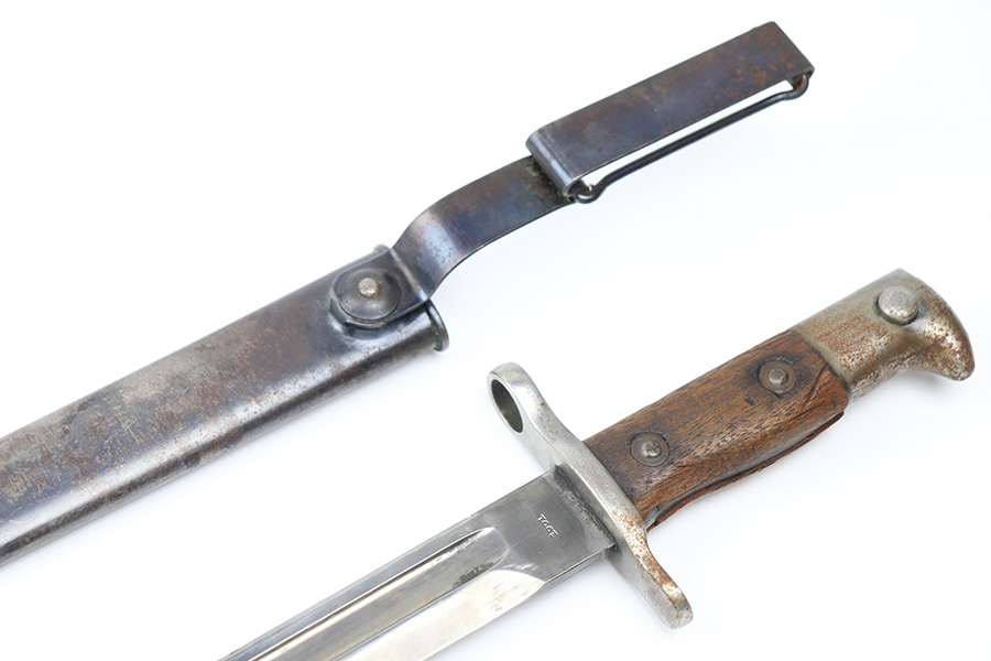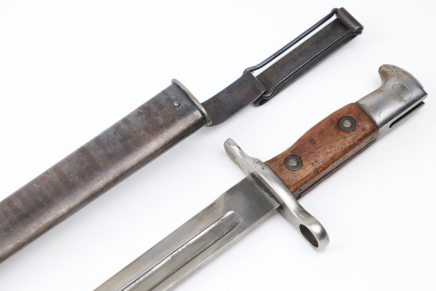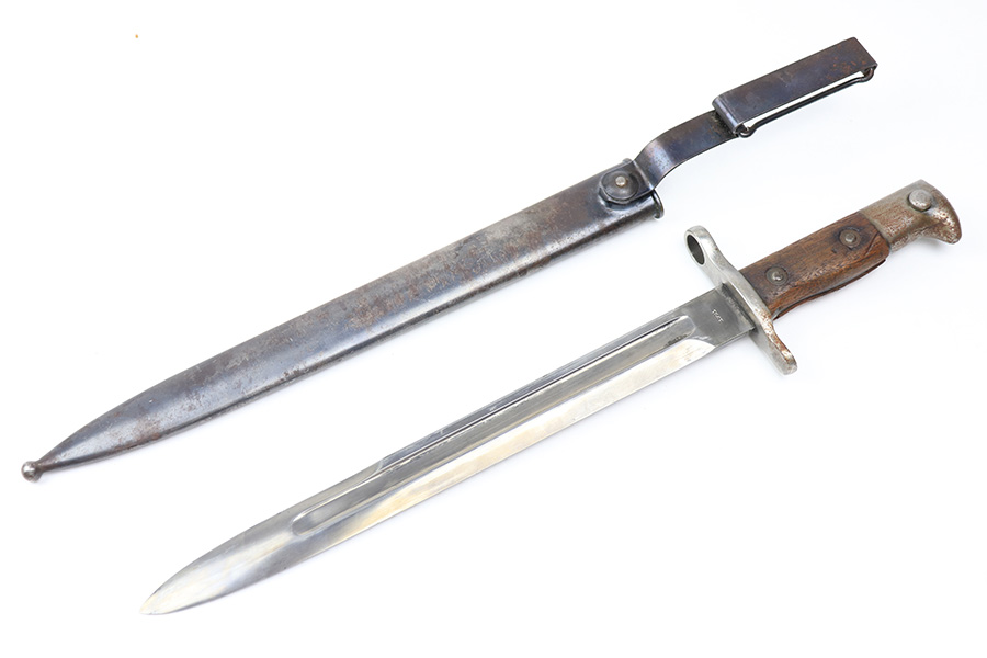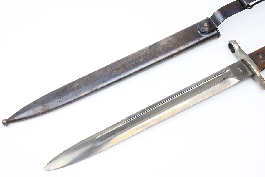 1/5/22 – This is an original pre WW1 M1892 Krag bayonet. The bayonet is US stamped and 1901 dated. The blade has not been sharpened and has minimal surface discoloration. Comes with an original metal scabbard with a swivel belt loop still in tact. The scabbard has surface patina and discoloration throughout, but there are no dents, nor any rust or pitting. The wood handles are in great shape. The metal hand guard and pommel have surface patina and discoloration but no major issues.