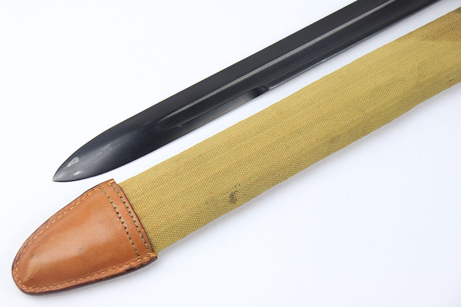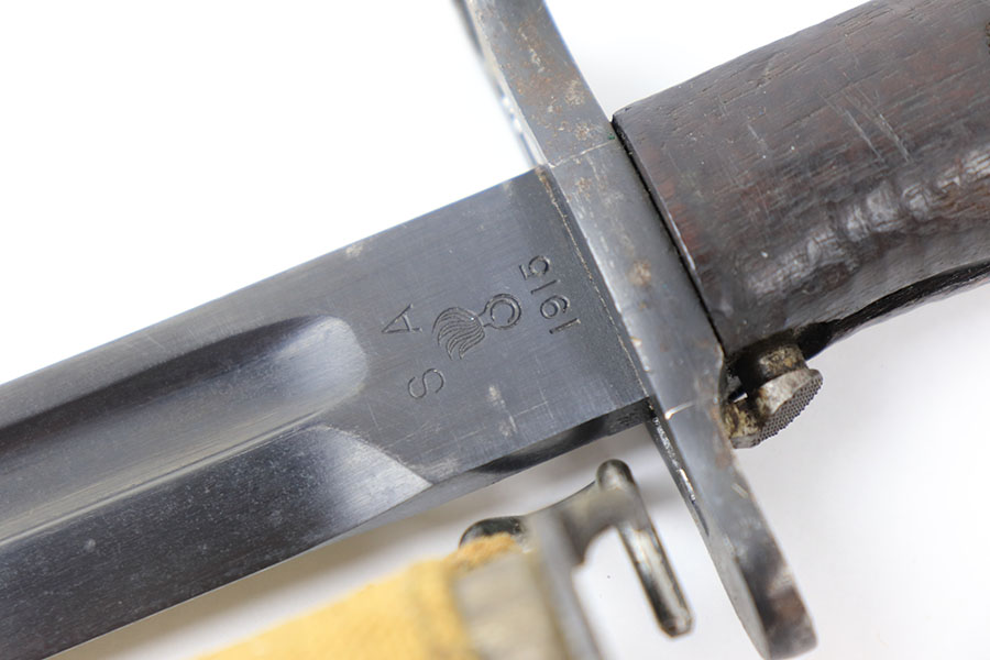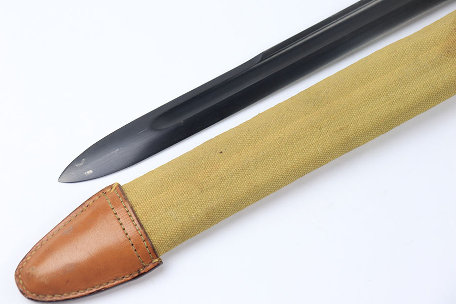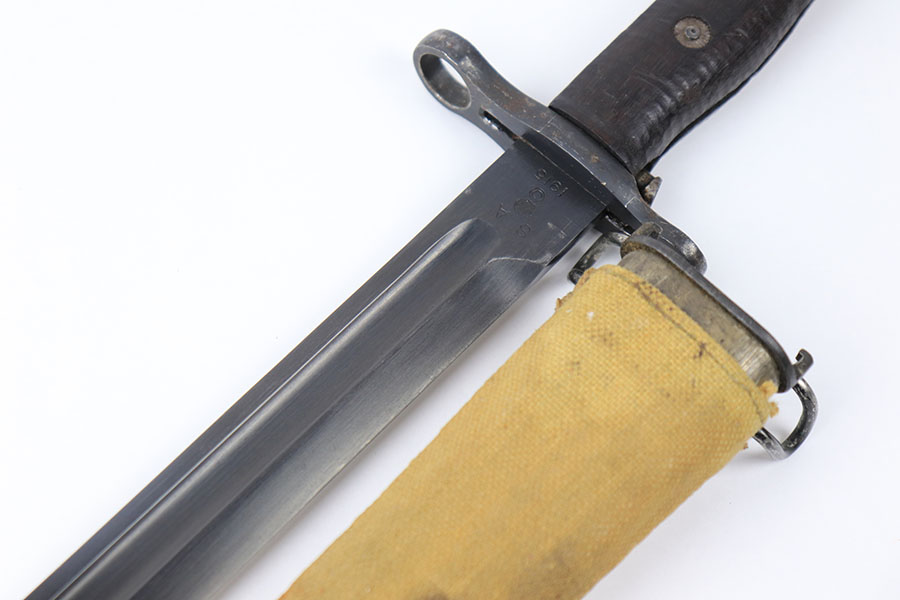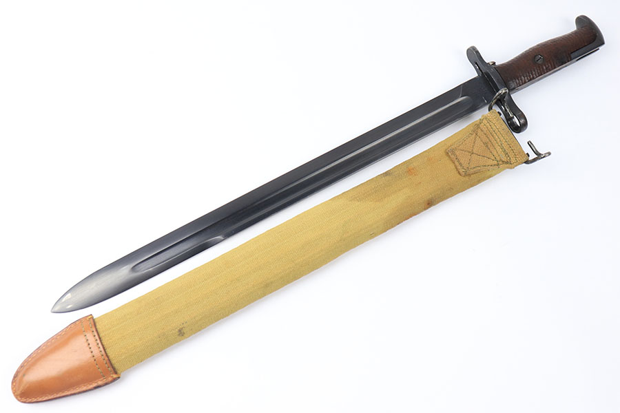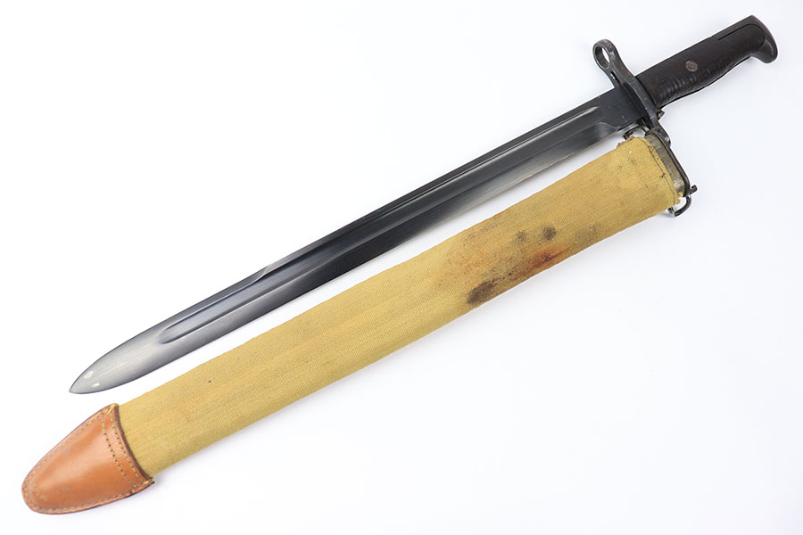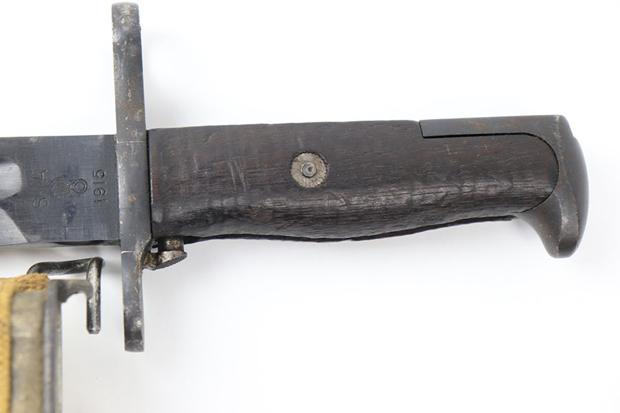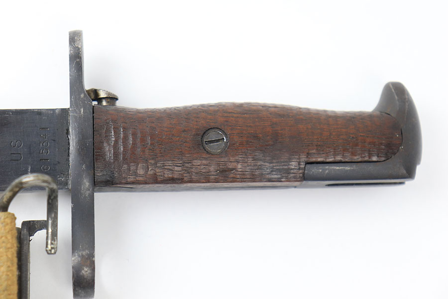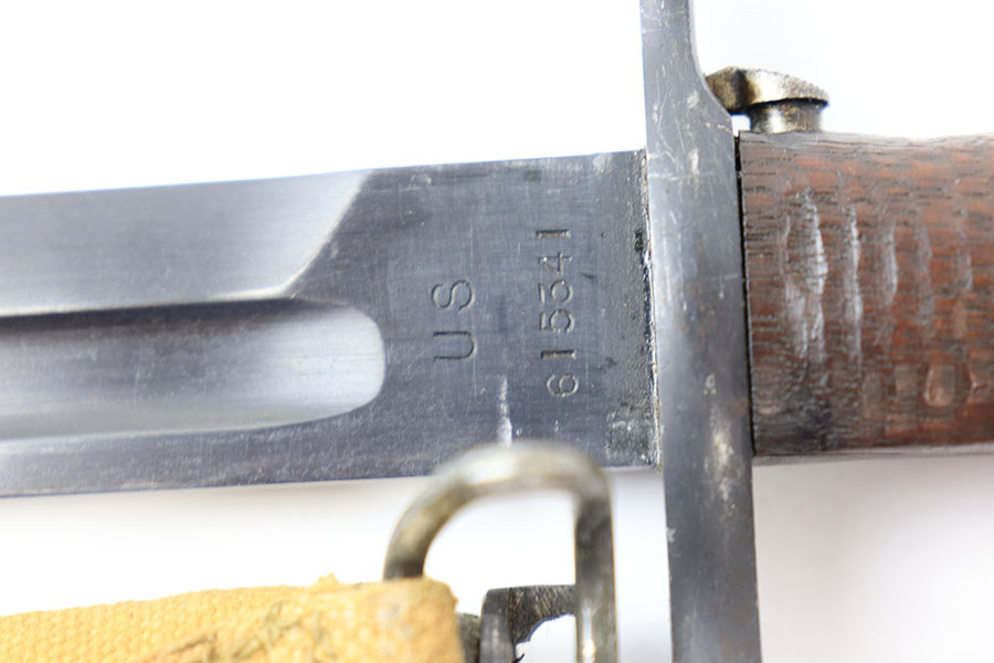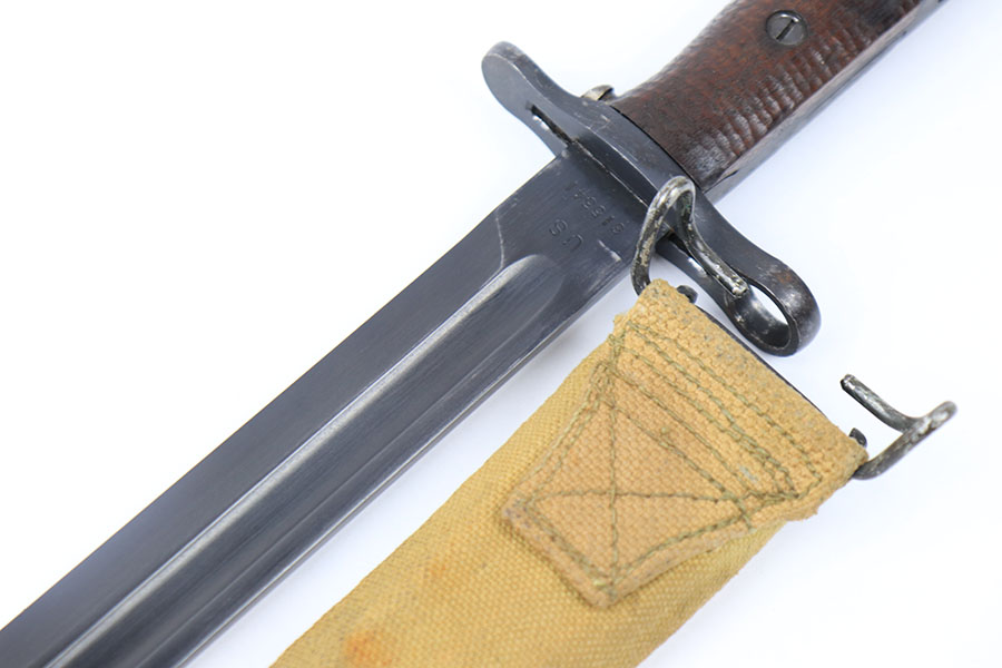7/2/21 – This is an original WW1 model 1905 bayonet for the 1903 Springfield rifle. Excellent condition with an original canvas covered scabbard. The canvas can slide off of the shell of the scabbard, but is still in great overall condition. The blade is excellent and unsharpened. Original wood handles have no cracks or chips.