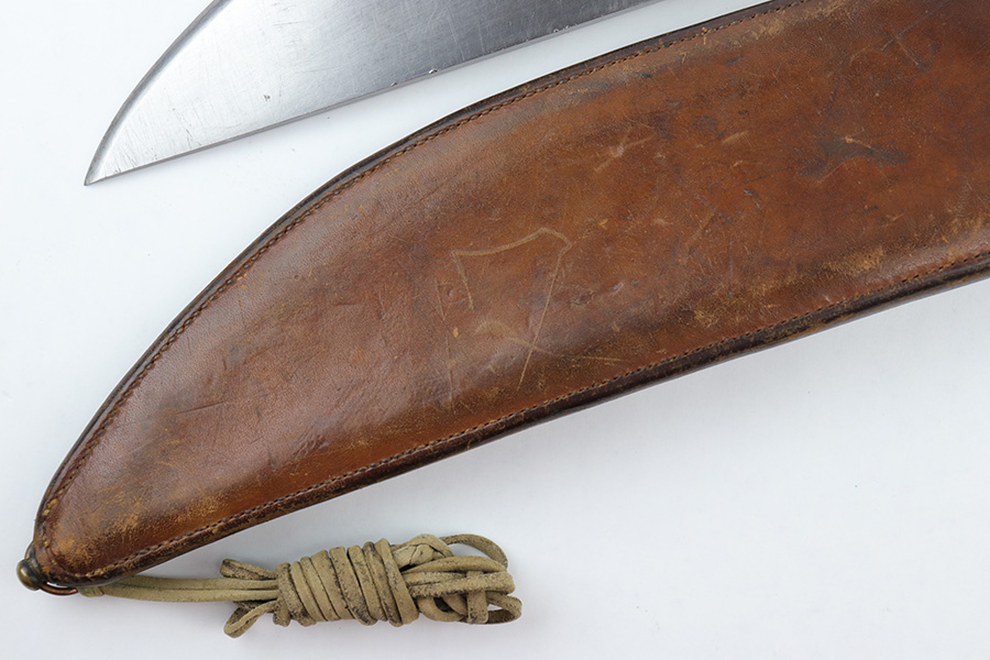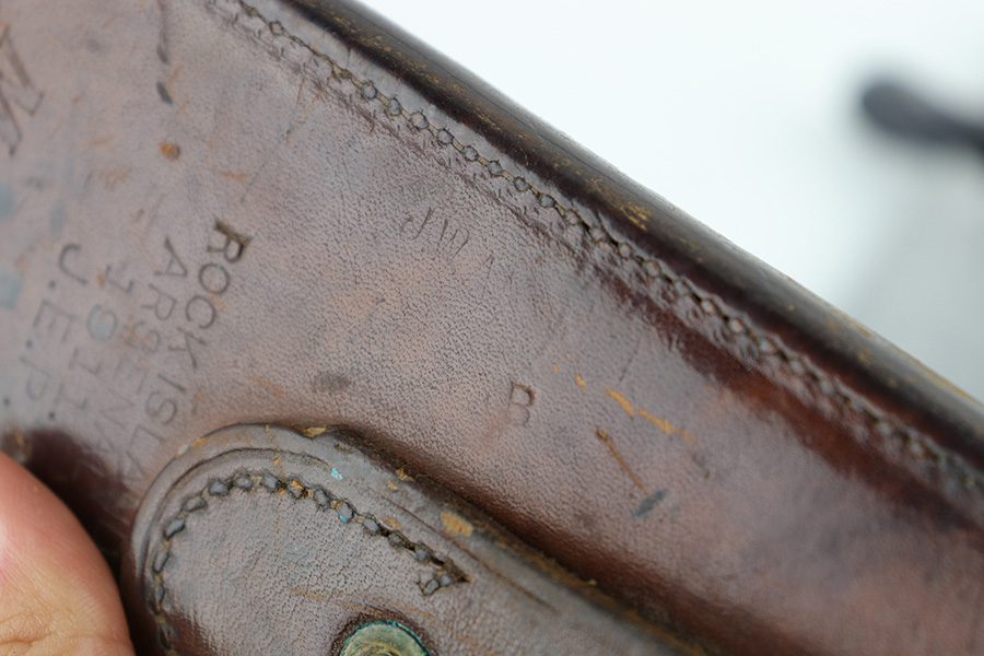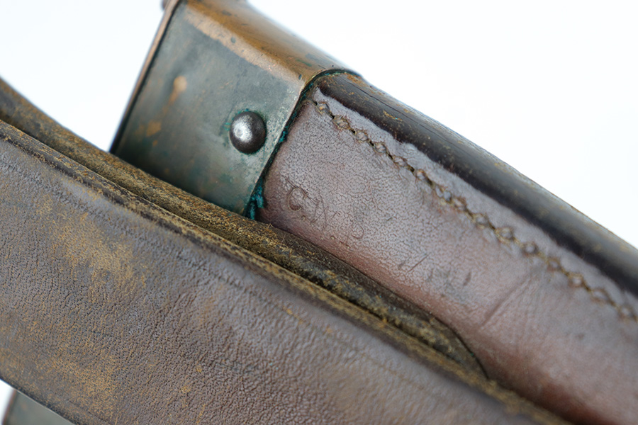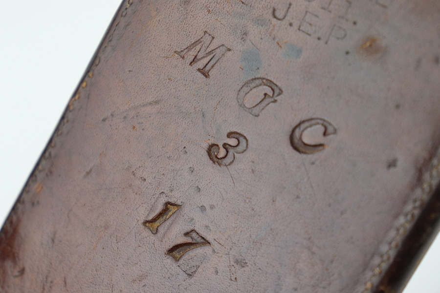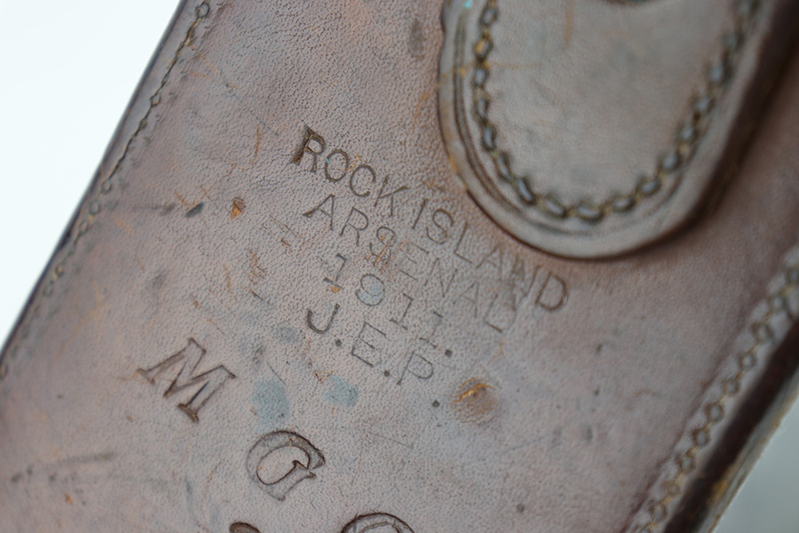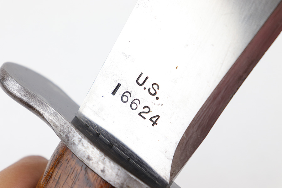 7/21/23 – This is an original WW1 production Springfield Armory Bolo Knife with an original leather scabbard made by Rock Island Arsenal. The blade is in near-excellent condition with some mild surface scratching and light discoloration in a few areas, but no major issues and a clean unsharpened edge. The blade is well marked with a maker stamp, ordnance stamp, and 1913 manufacture date. The hand guard has mild surface patina throughout. Original wood grips are in great condition with no cracks or chips. The scabbard has an original lanyard attached and intact lanyard ring. The leather is maker stamped and 1911 date stamped as well. Some light surface wear throughout but no issues in the leather or stitching.