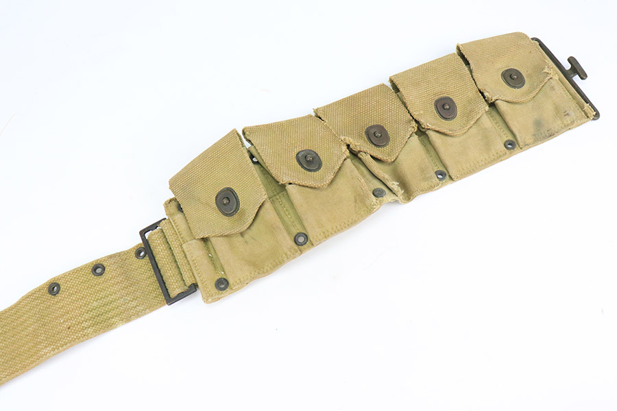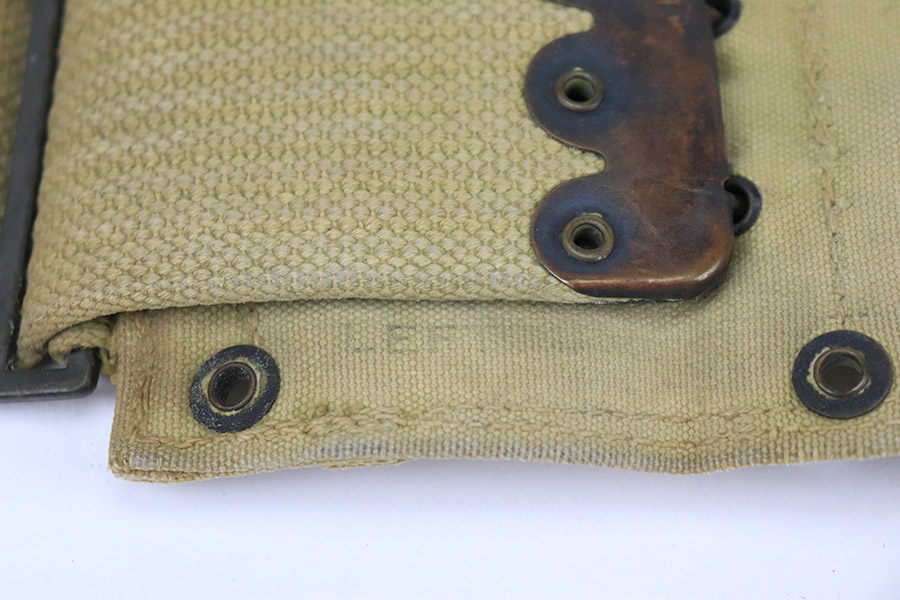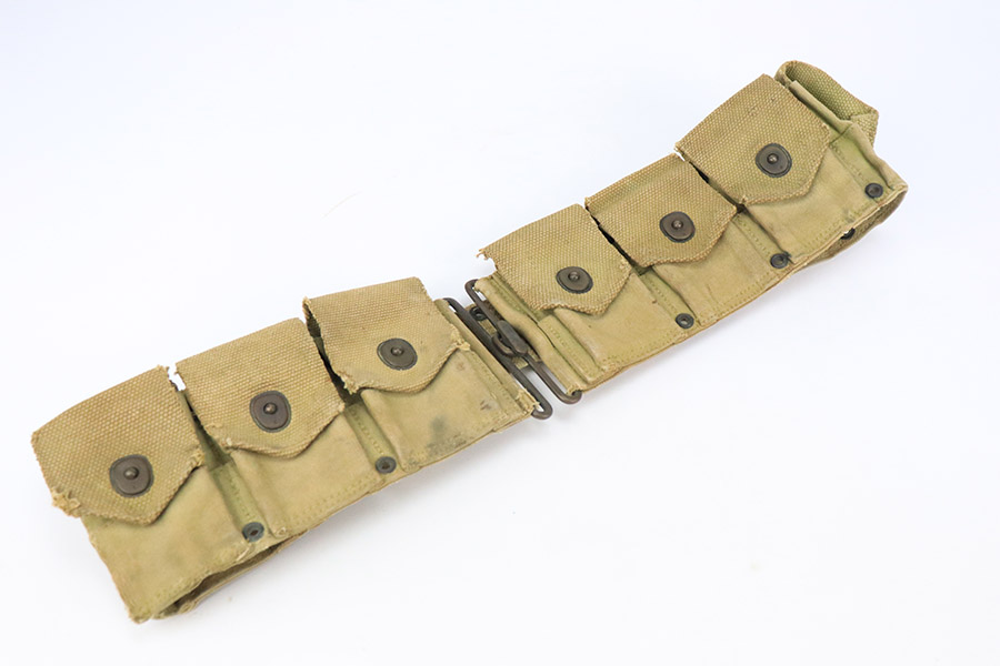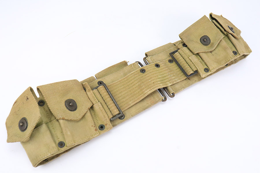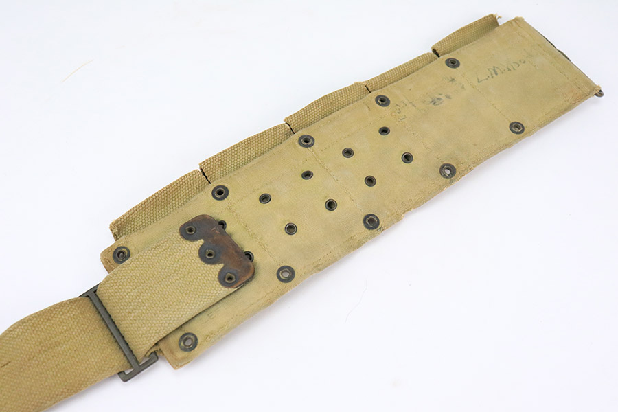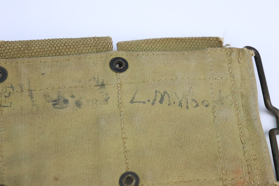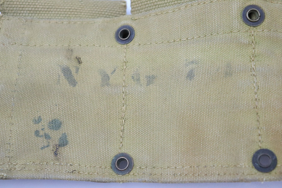 11/3/22 – This is an original WW1 M1910 Canvas Ammo belt. The belt features 5 small pouches on each side with nice tan / light green canvas and all snaps and metal fittings intact. There is some ripping and semi-loose closure knobs on some of the pouches – as shown in photos. The canvas is also mildly frayed along the edges in a few areas, and there’s surface patina throughout the metal fittings, but no rust or major issues. The interior appears to be named and ink stamped “N Y G 7 4” which is likely a unit stamp of some kind.