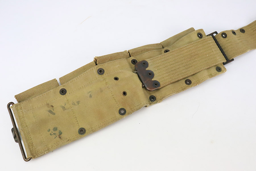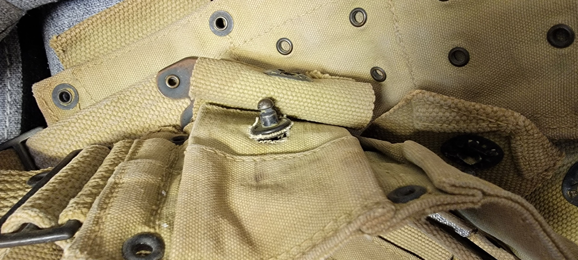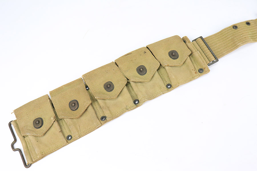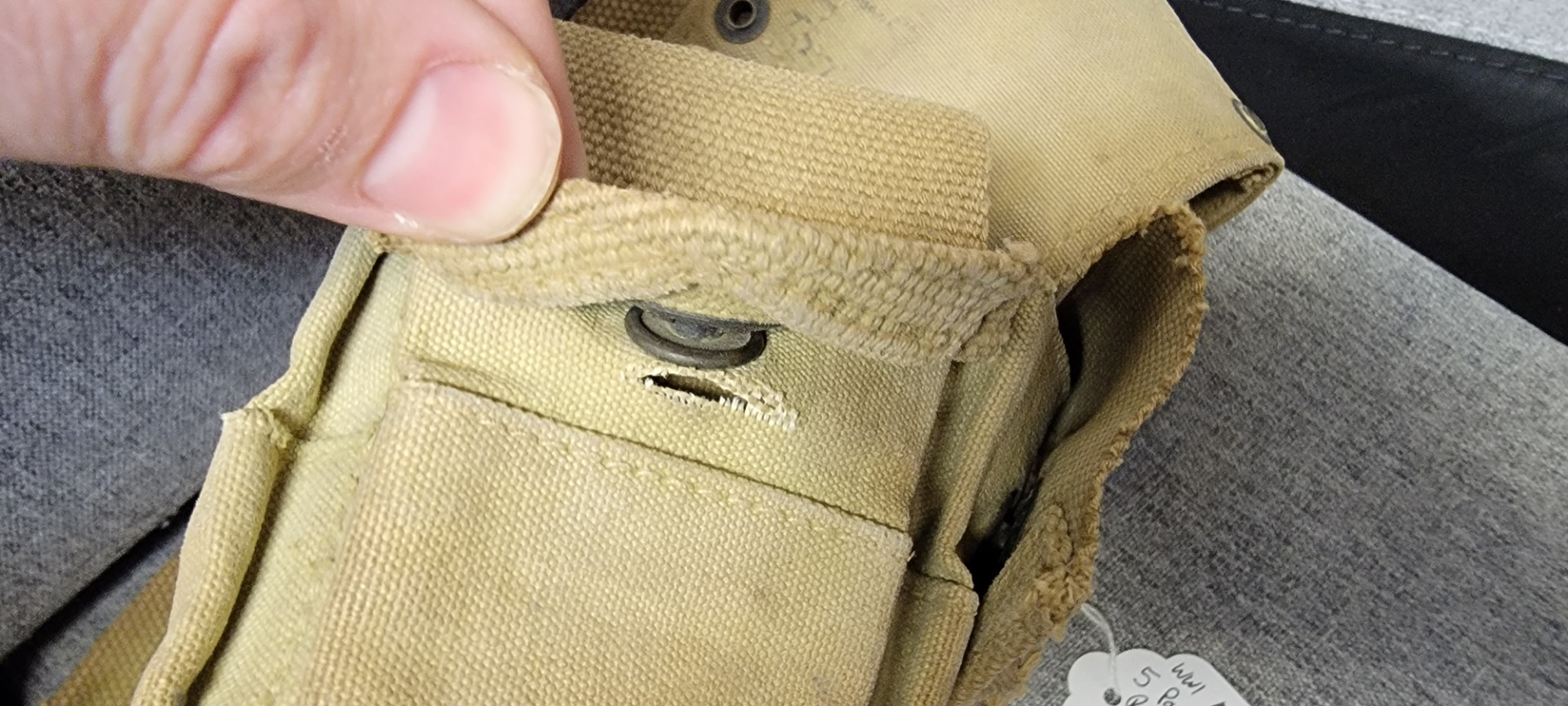 11/3/22 – This is an original WW1 M1910 Canvas Ammo belt. The belt features 5 small pouches on each side with nice tan / light green canvas and all snaps and metal fittings intact. There is some ripping and semi-loose closure knobs on some of the pouches – as shown in photos. The canvas is also mildly frayed along the edges in a few areas, and there’s surface patina throughout the metal fittings, but no rust or major issues. The interior appears to be named and ink stamped “N Y G 7 4” which is likely a unit stamp of some kind.