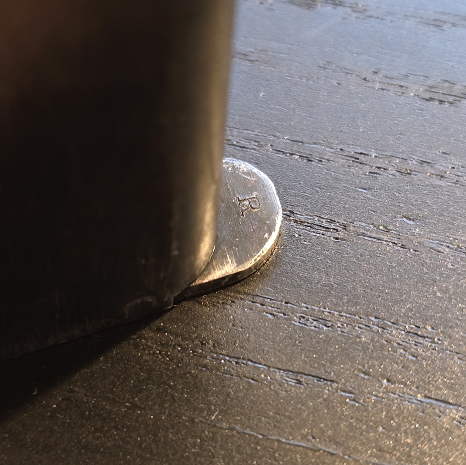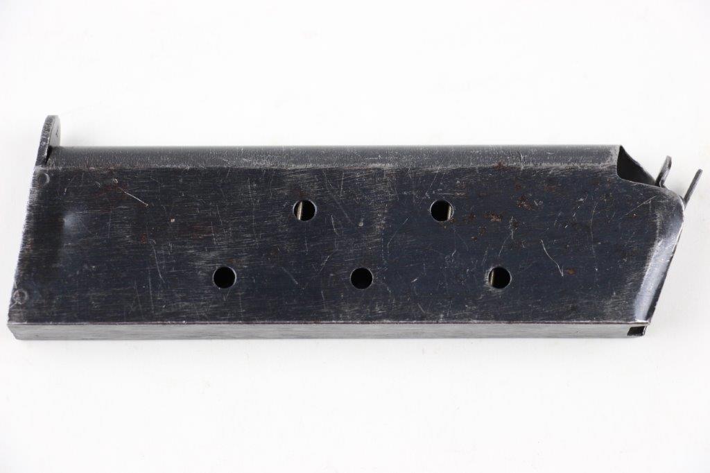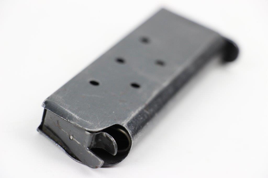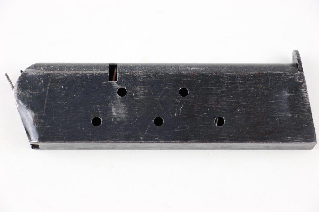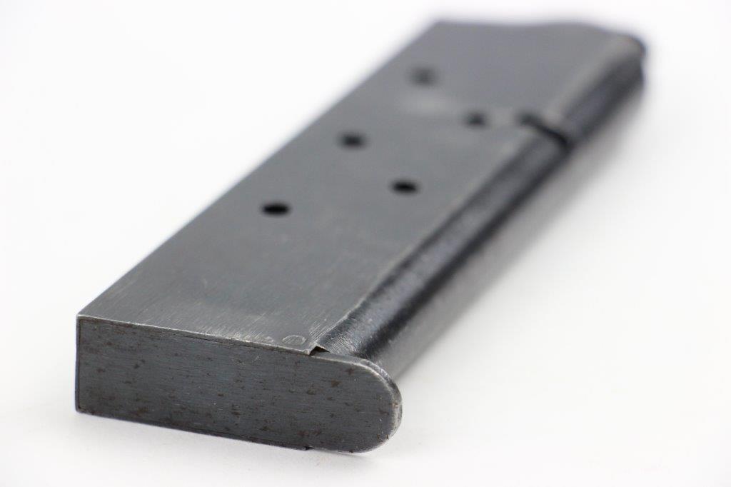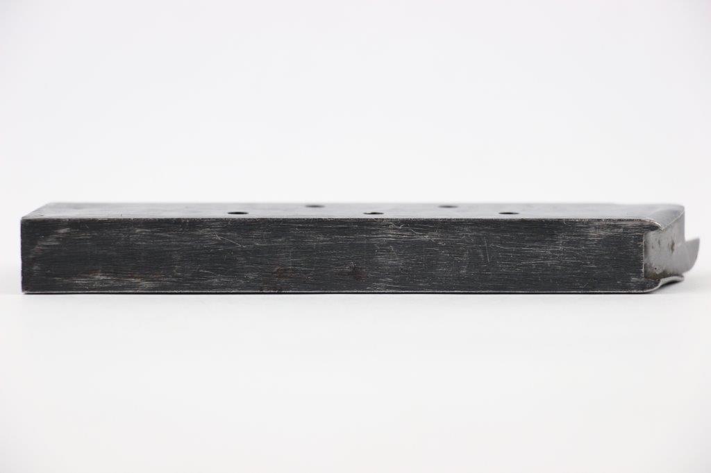 9/6/24 – This is an original WW2 US M1911A1 magazine. The magazine is in great overall condition with light age patina and mild finish loss, but most of the original finish is intact. The base plate is pinned in place by two pins, and the lip is stamped “R” by Risdon. Just above the two pins on either side of the tube is a small indent, which looks like this magazine was held tightly by a vice grip at some point. This doesn’t affect fit or function. The spring is strong and excellent.