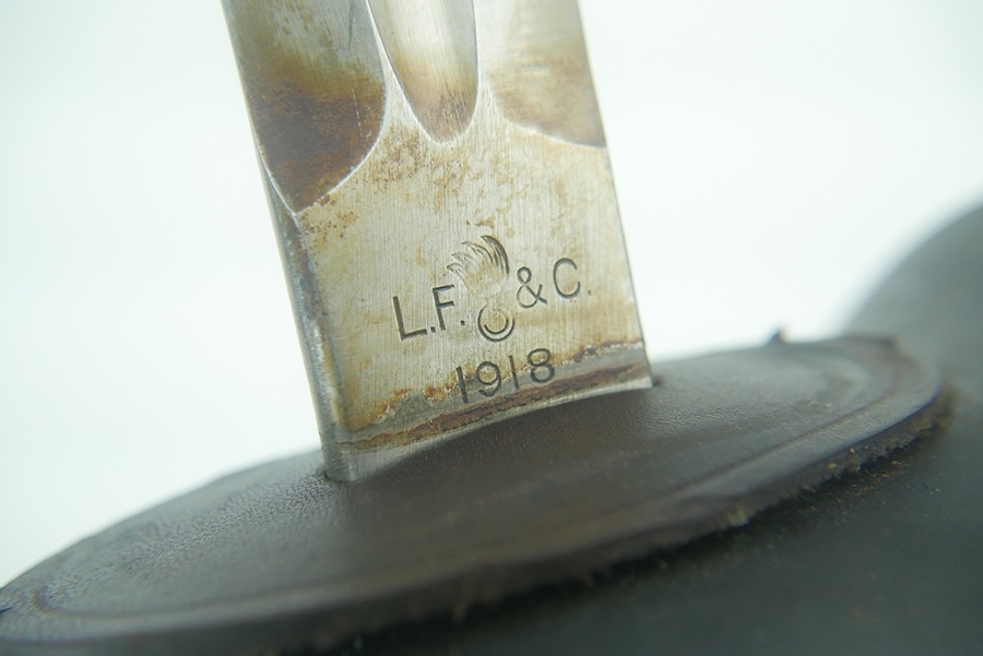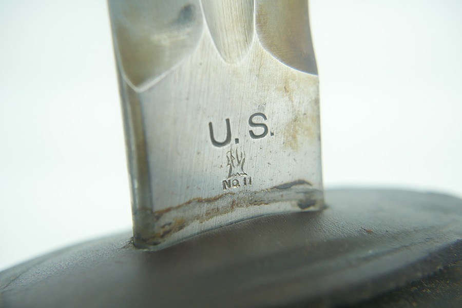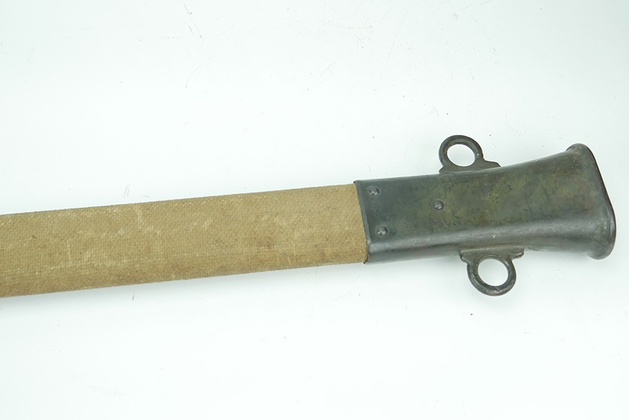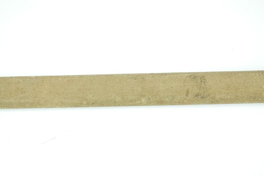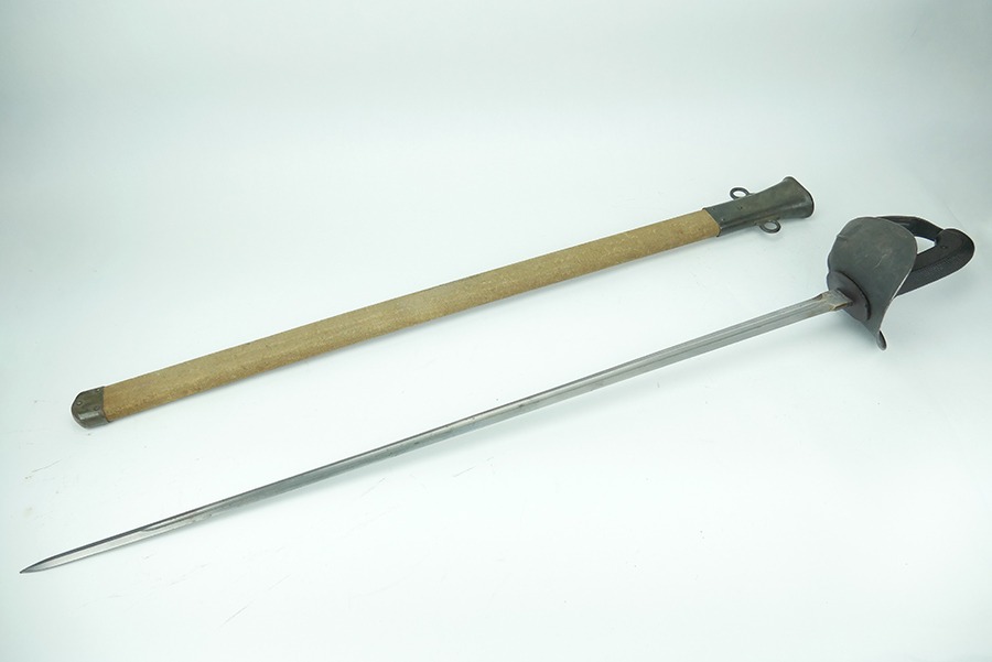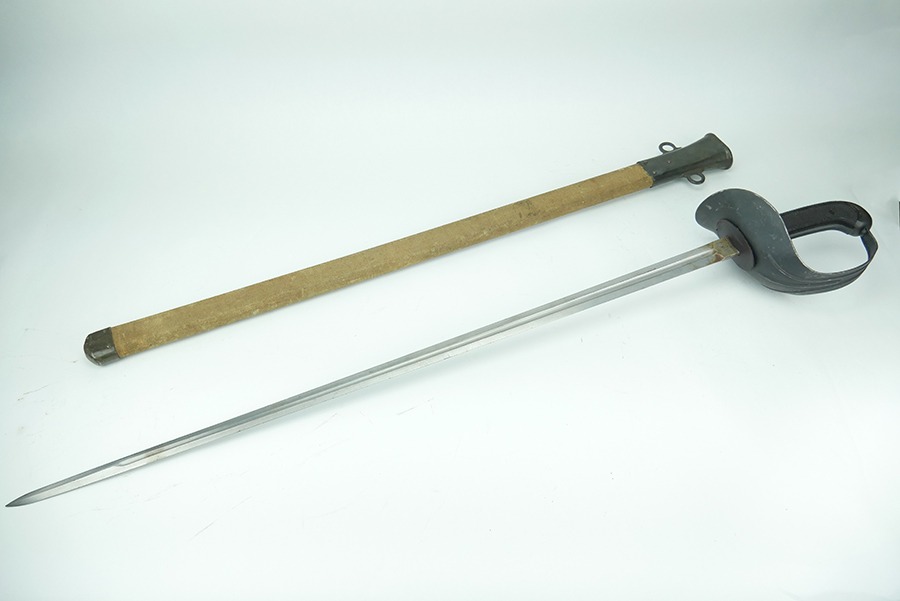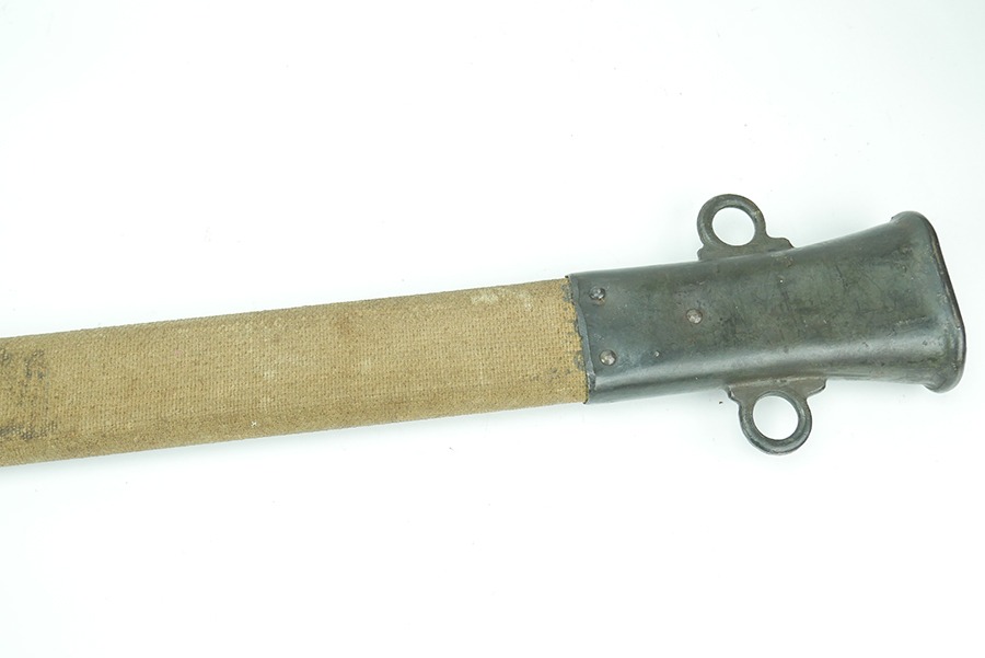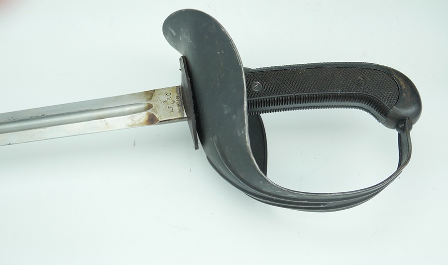 11/21/24 – This is a great example of a WW1 production US M1913 Cavalry sword. These swords were designed by U.S. General Patton before he became a famous US General. After competing as a fencer in the 1912 Olympic Games, Patton’s skill led him to design a combat sword favoring thrusting attacks over standard slashing maneuvers. This sword is in great overall condition . The sword blade is US stamped with an eagle head proof underneath, and the reverse is maker stamped and 1918 dated. The blade shows some areas of dark patina. The edges show no signs of sharpening nor any misuse blemishes. The hand guard and handle are in great condition with some spotty, mild discoloration. The scabbard of this sword is also in great condition.