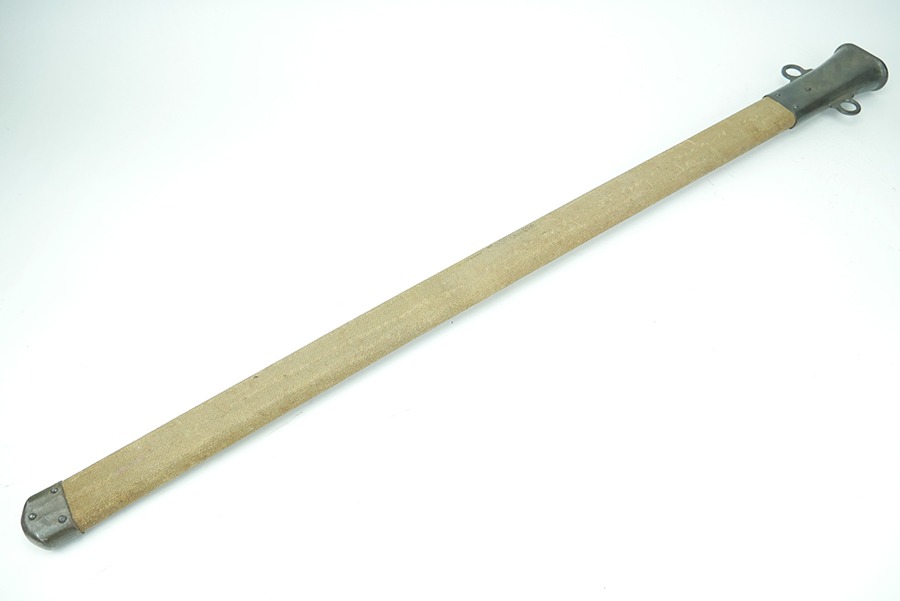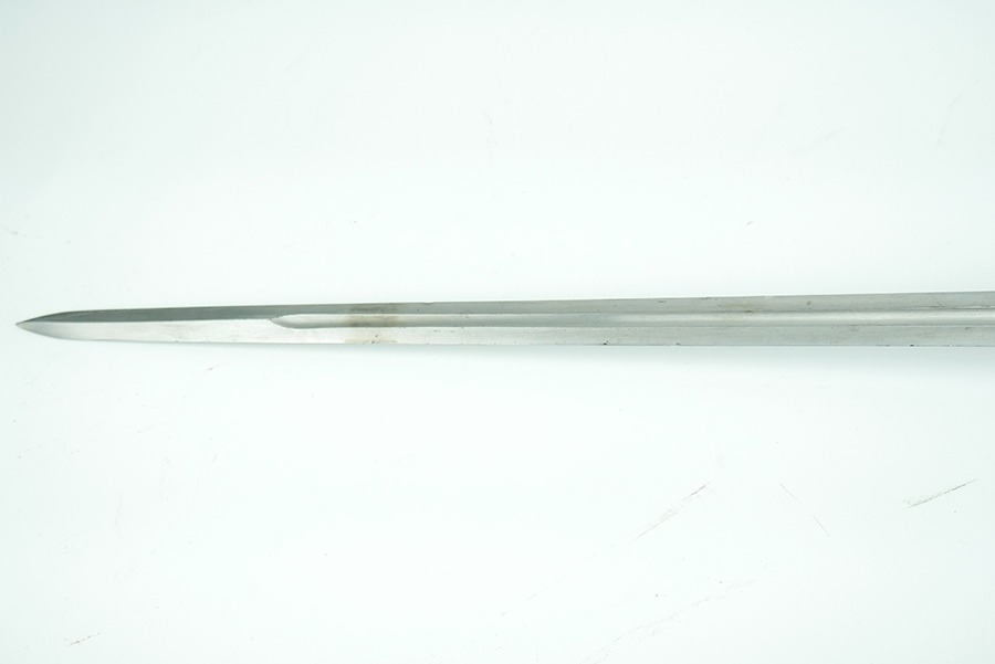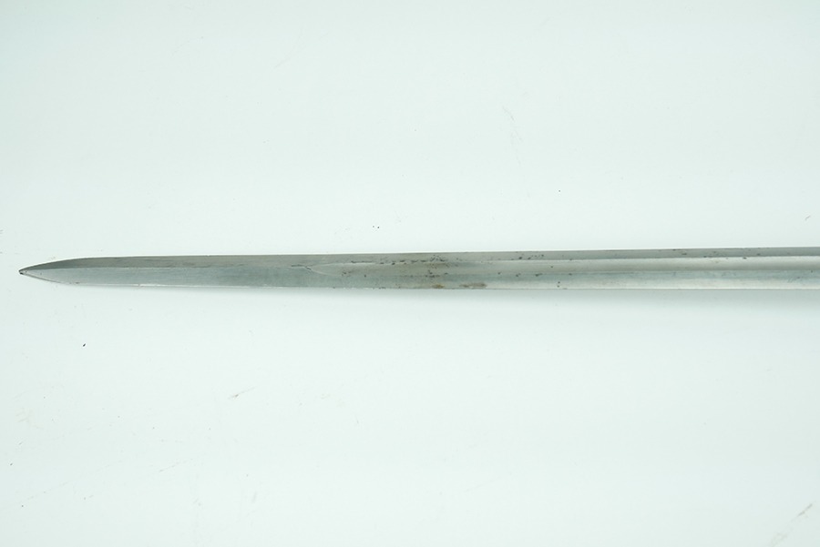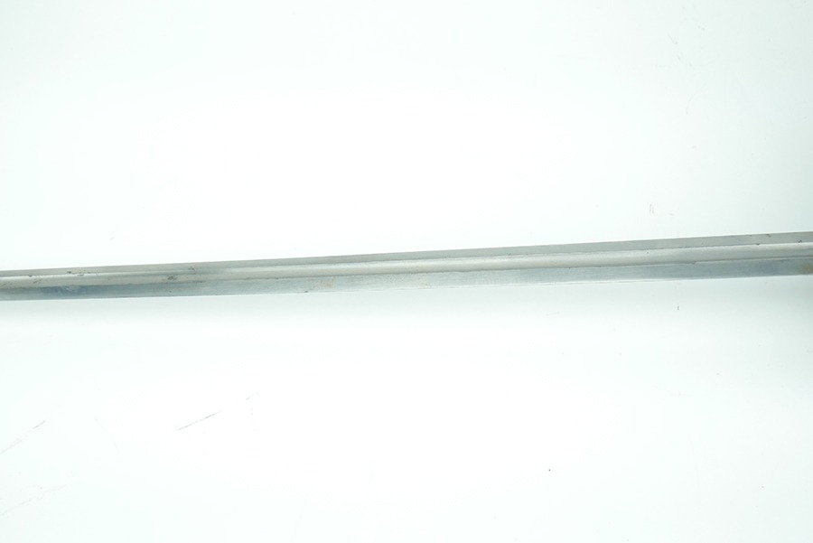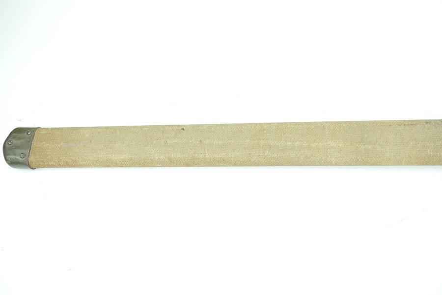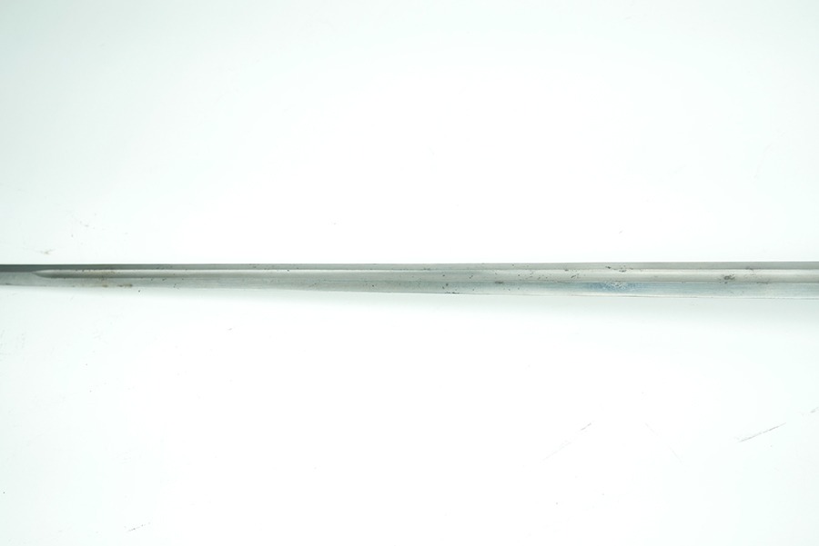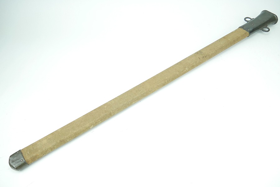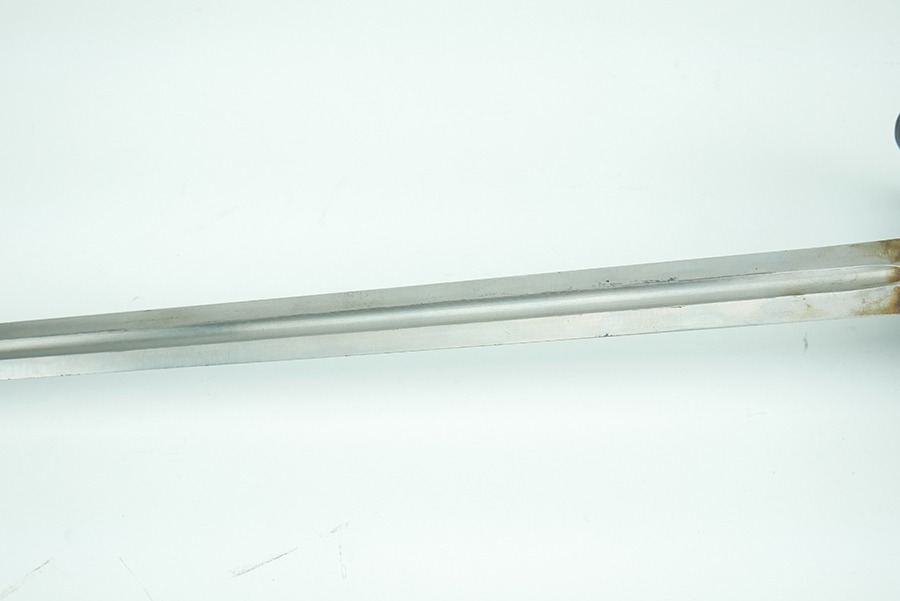 11/21/24 – This is a great example of a WW1 production US M1913 Cavalry sword. These swords were designed by U.S. General Patton before he became a famous US General. After competing as a fencer in the 1912 Olympic Games, Patton’s skill led him to design a combat sword favoring thrusting attacks over standard slashing maneuvers. This sword is in great overall condition . The sword blade is US stamped with an eagle head proof underneath, and the reverse is maker stamped and 1918 dated. The blade shows some areas of dark patina. The edges show no signs of sharpening nor any misuse blemishes. The hand guard and handle are in great condition with some spotty, mild discoloration. The scabbard of this sword is also in great condition.