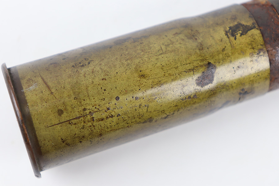 11/2/23 – This is an original Model 1916 37mm round designed to target and take out German machine gun nests. The round is head stamped with an ordnance proof, and 37-5 date for May of 1937. Very good overall condition with some natural aging and surface wear throughout. Measures 17.5cm long (about 7 inches).