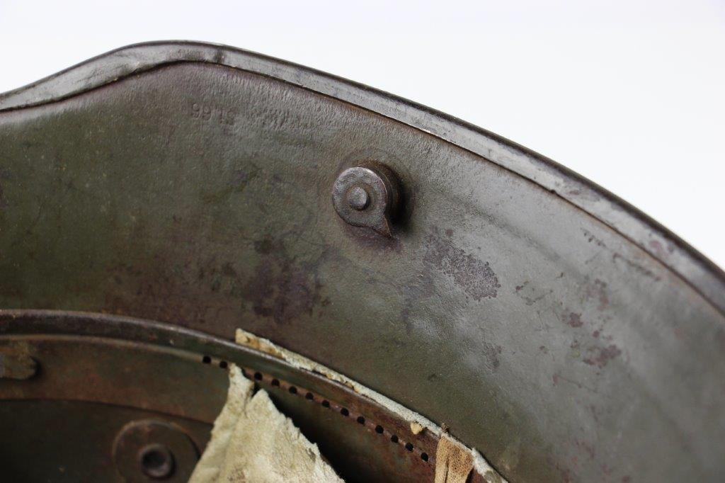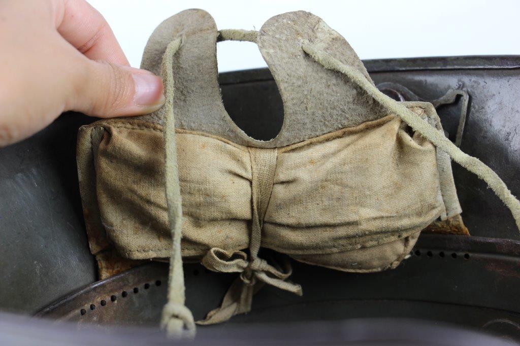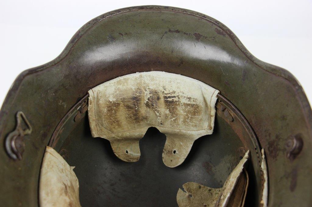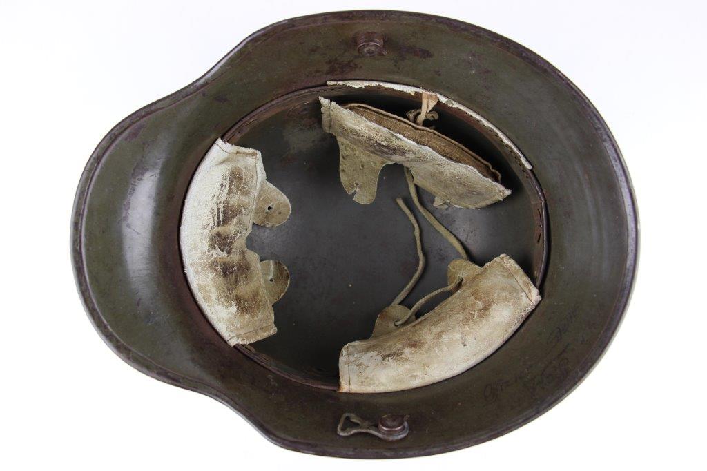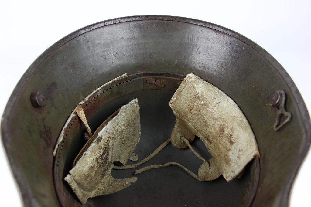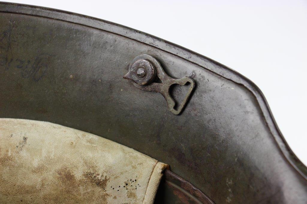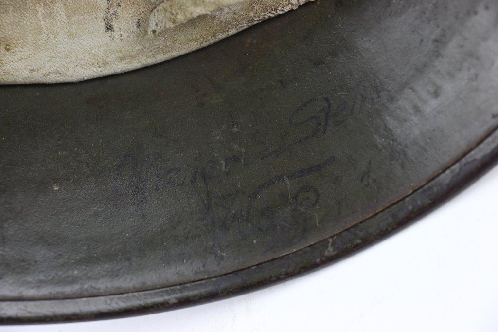 8/22/24 – This is an original WW1 German M1916 Stahlhelm. Great condition with original liner band and liner intact, although one of the liner pads is broken off at the top leather seam (yet still original to the helmet, and attached by the cloth tie string). The interior of the detached liner pad shows an original manufacturer ink stamp and date. The shell is excellent, with original olive field-green painted finish around 75-80% intact. Natural patina and surface discoloration throughout the crown and shell exterior. The interior shell is marker and size marked “Si 66” for Eisenheutte Silesia, and a larger desirable size. Interior crown is lot numbered “B1 818”. A name “Offizier Stellif” (or ‘Steller’) is handwritten near the back visor with a handwritten date ending in “16” for 1916. The original rivets are flush and retain some of the original paint as well. Nice interior chin strap lugs, with one attached chinstrap “key” or metal retaining piece. Light, natural patina on the headband, but great overall condition with beige colored leather liner pads. Some natural surface wear but great to excellent overall condition given its’ age. A very nice, large and early WW1 example with over 100 years of history.