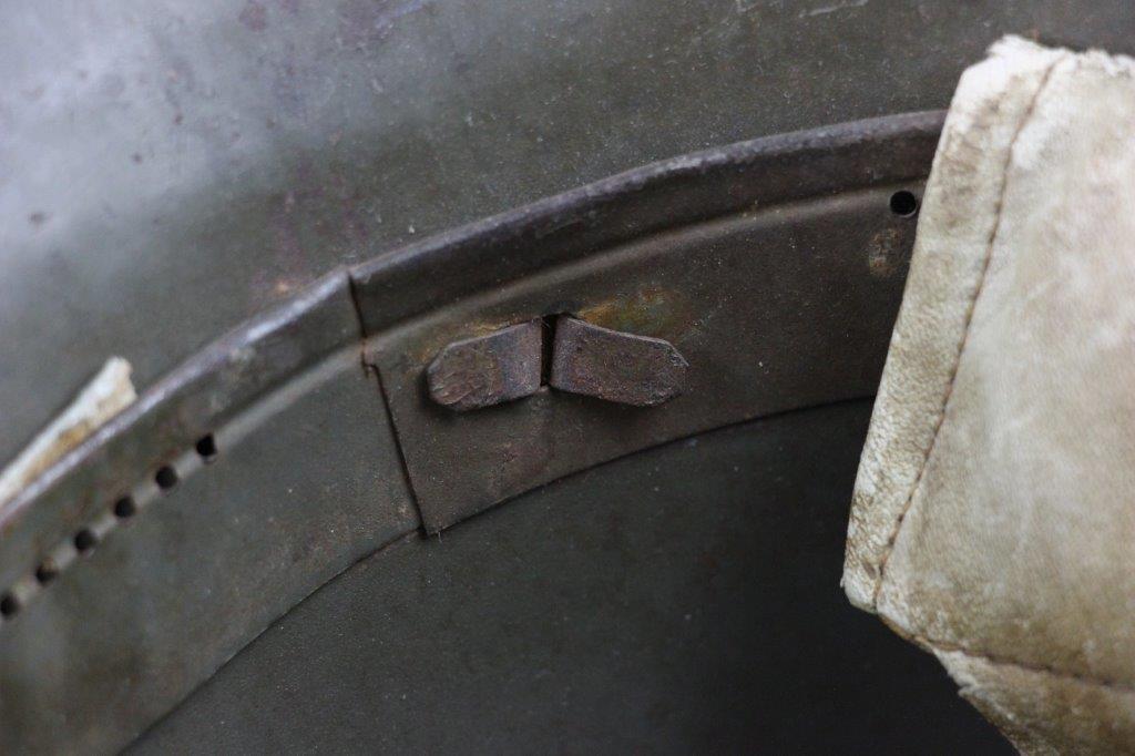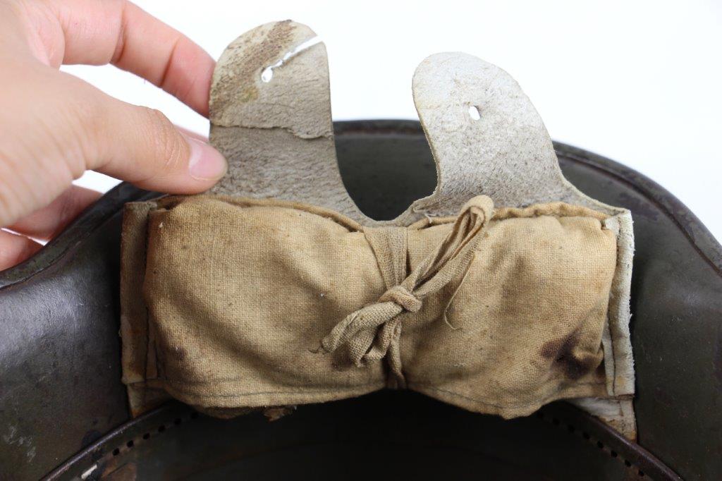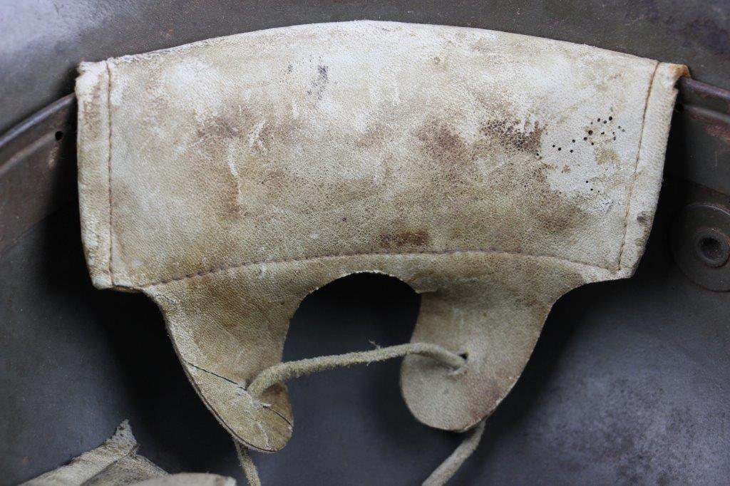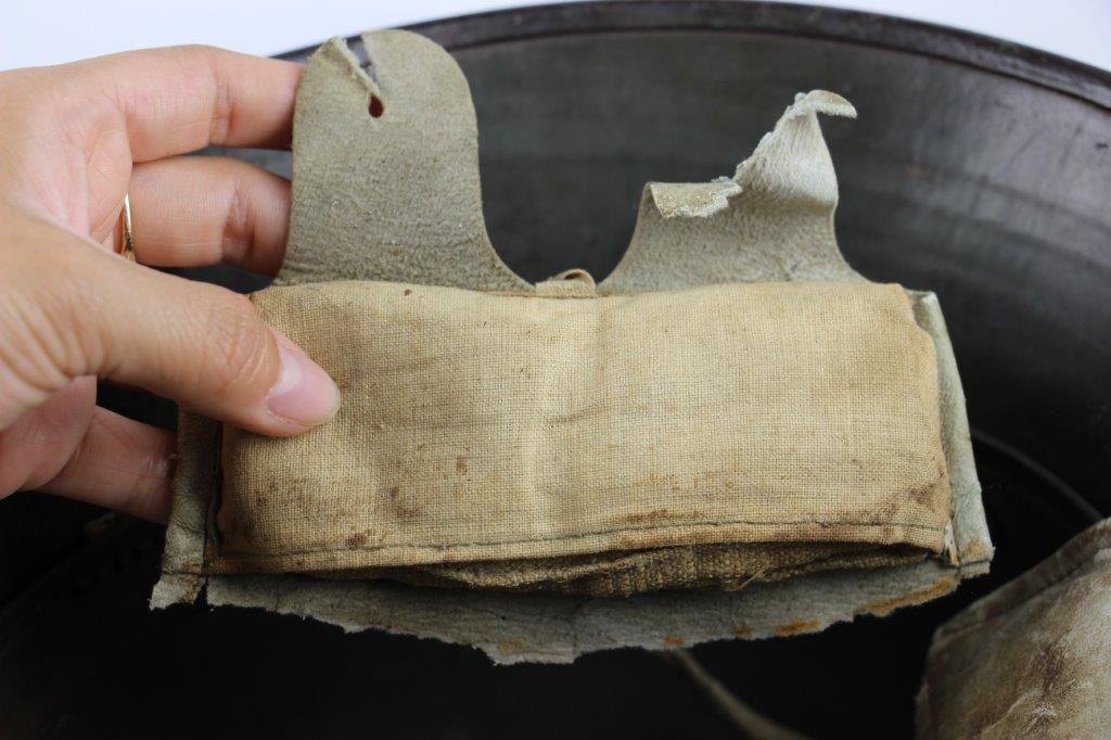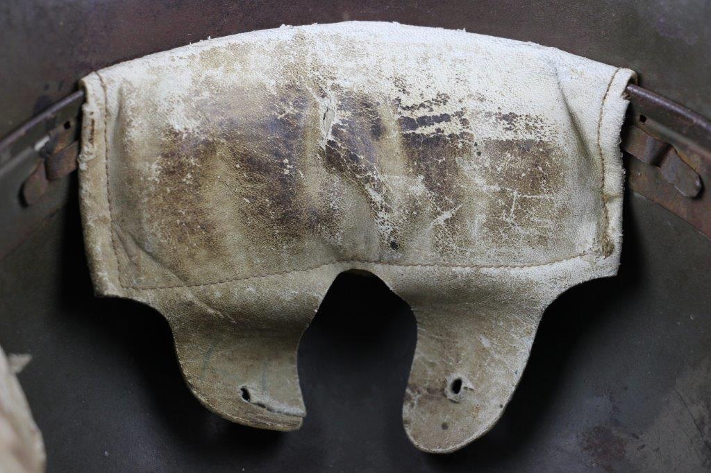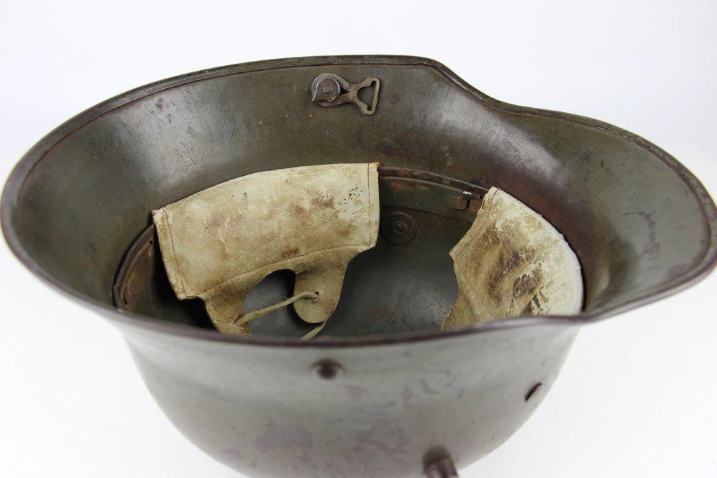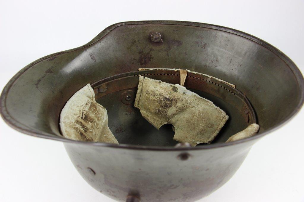 8/22/24 – This is an original WW1 German M1916 Stahlhelm. Great condition with original liner band and liner intact, although one of the liner pads is broken off at the top leather seam (yet still original to the helmet, and attached by the cloth tie string). The interior of the detached liner pad shows an original manufacturer ink stamp and date. The shell is excellent, with original olive field-green painted finish around 75-80% intact. Natural patina and surface discoloration throughout the crown and shell exterior. The interior shell is marker and size marked “Si 66” for Eisenheutte Silesia, and a larger desirable size. Interior crown is lot numbered “B1 818”. A name “Offizier Stellif” (or ‘Steller’) is handwritten near the back visor with a handwritten date ending in “16” for 1916. The original rivets are flush and retain some of the original paint as well. Nice interior chin strap lugs, with one attached chinstrap “key” or metal retaining piece. Light, natural patina on the headband, but great overall condition with beige colored leather liner pads. Some natural surface wear but great to excellent overall condition given its’ age. A very nice, large and early WW1 example with over 100 years of history.