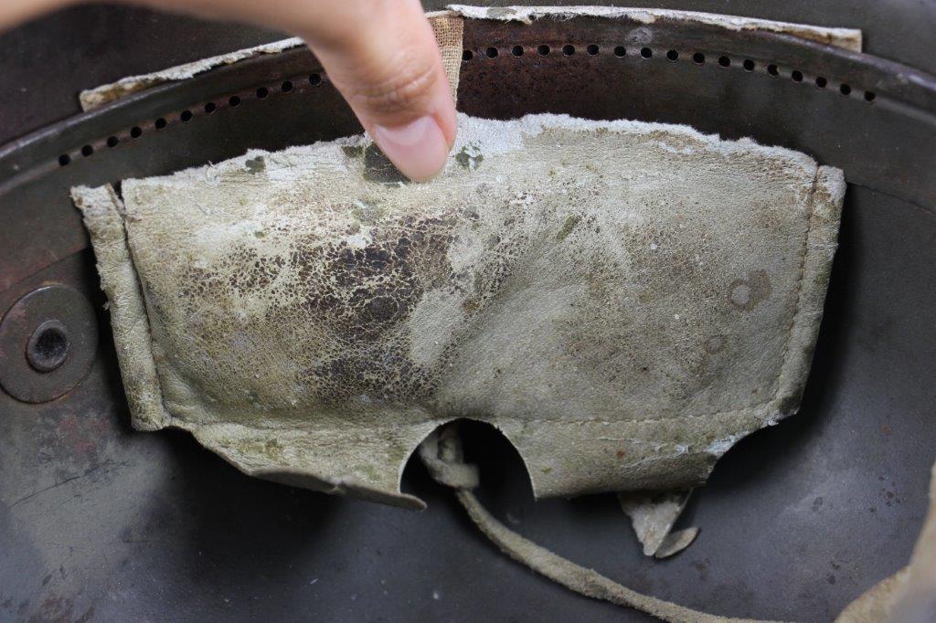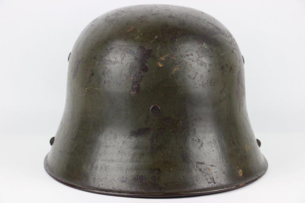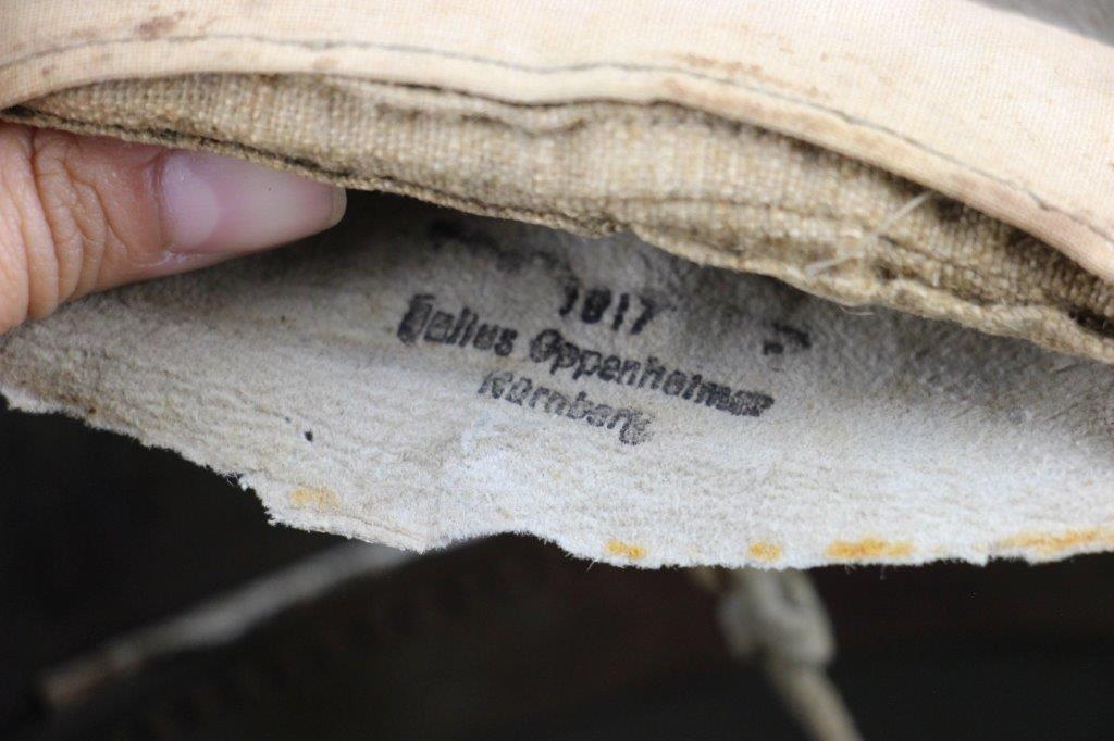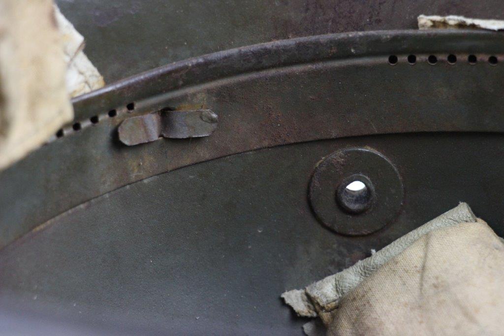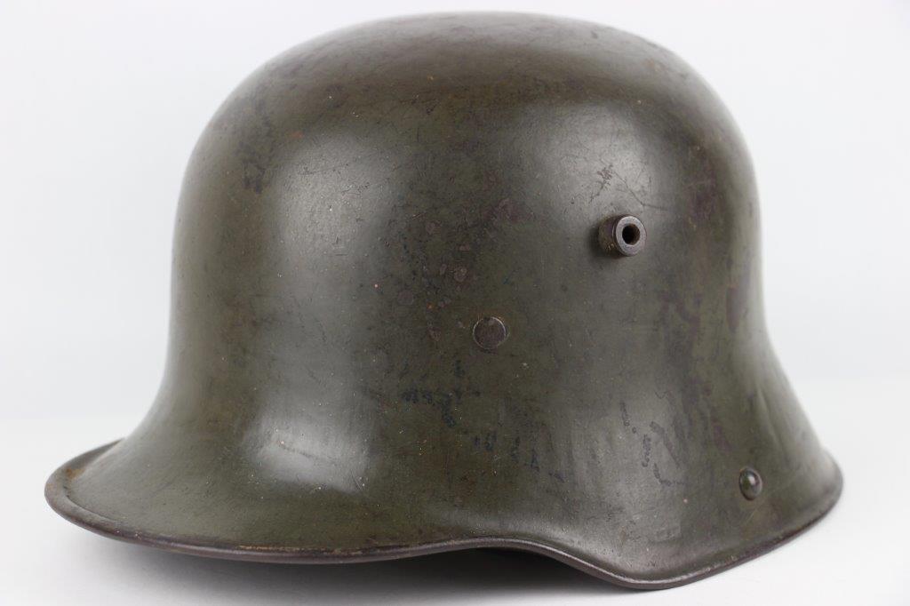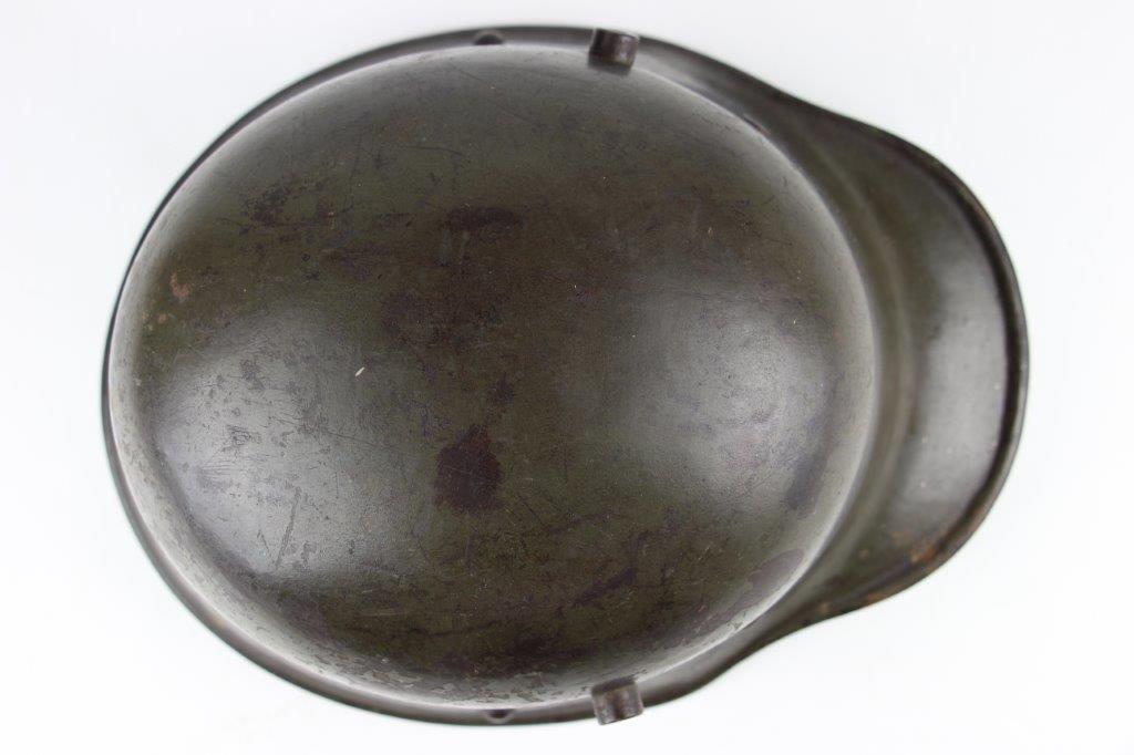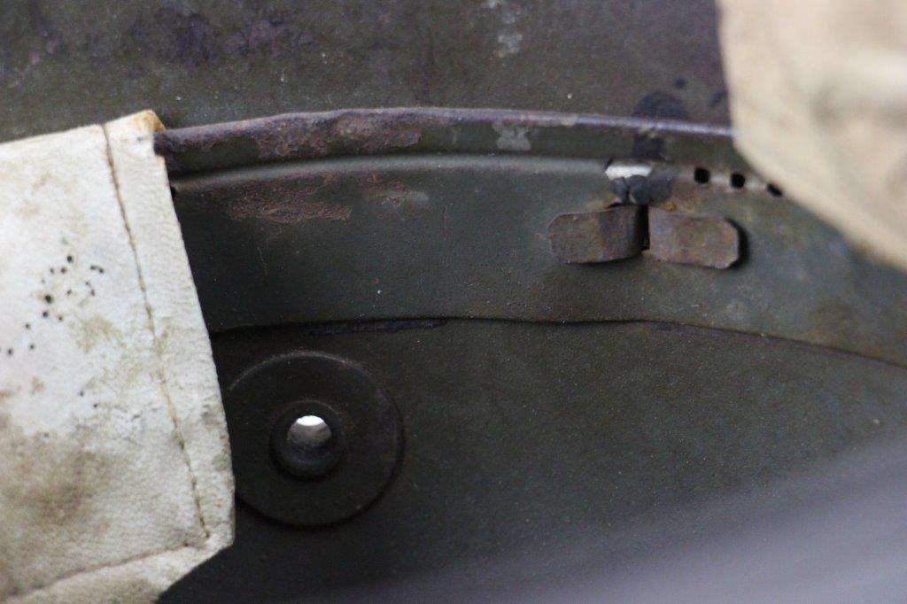 8/22/24 – This is an original WW1 German M1916 Stahlhelm. Great condition with original liner band and liner intact, although one of the liner pads is broken off at the top leather seam (yet still original to the helmet, and attached by the cloth tie string). The interior of the detached liner pad shows an original manufacturer ink stamp and date. The shell is excellent, with original olive field-green painted finish around 75-80% intact. Natural patina and surface discoloration throughout the crown and shell exterior. The interior shell is marker and size marked “Si 66” for Eisenheutte Silesia, and a larger desirable size. Interior crown is lot numbered “B1 818”. A name “Offizier Stellif” (or ‘Steller’) is handwritten near the back visor with a handwritten date ending in “16” for 1916. The original rivets are flush and retain some of the original paint as well. Nice interior chin strap lugs, with one attached chinstrap “key” or metal retaining piece. Light, natural patina on the headband, but great overall condition with beige colored leather liner pads. Some natural surface wear but great to excellent overall condition given its’ age. A very nice, large and early WW1 example with over 100 years of history.