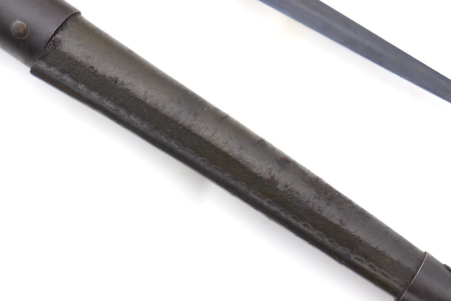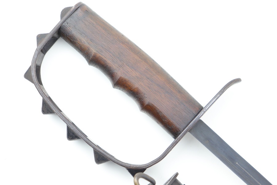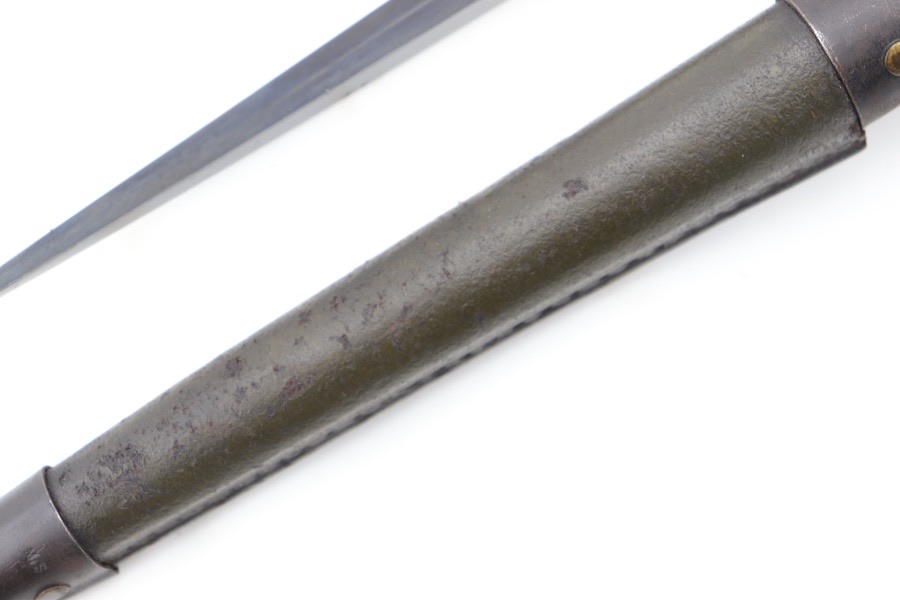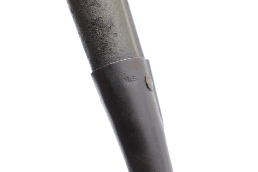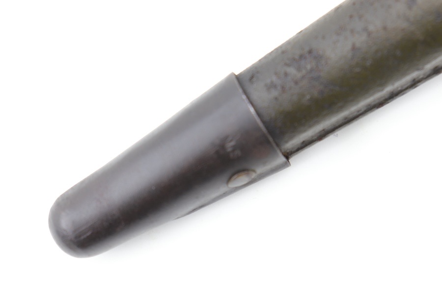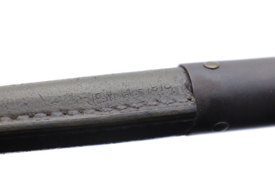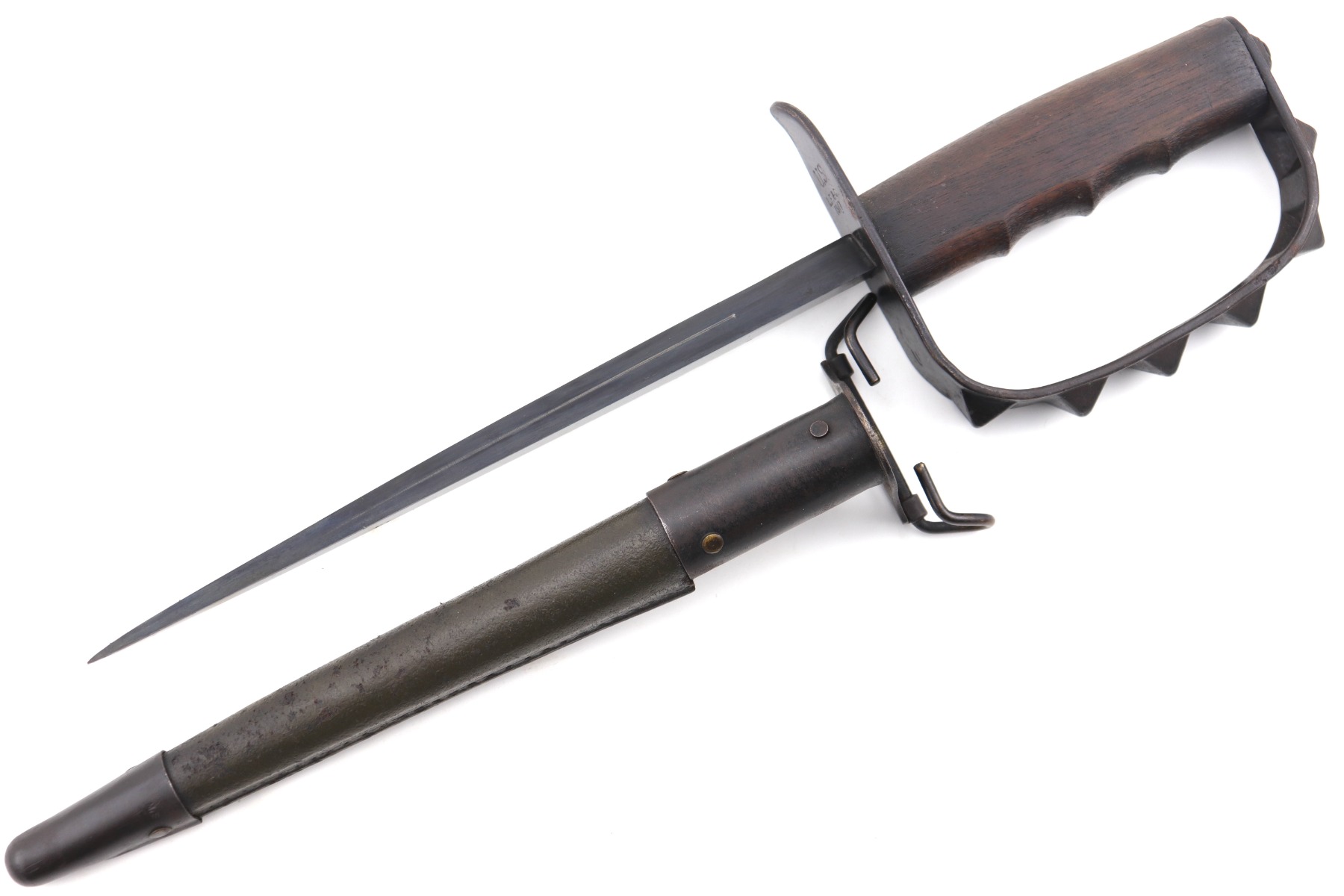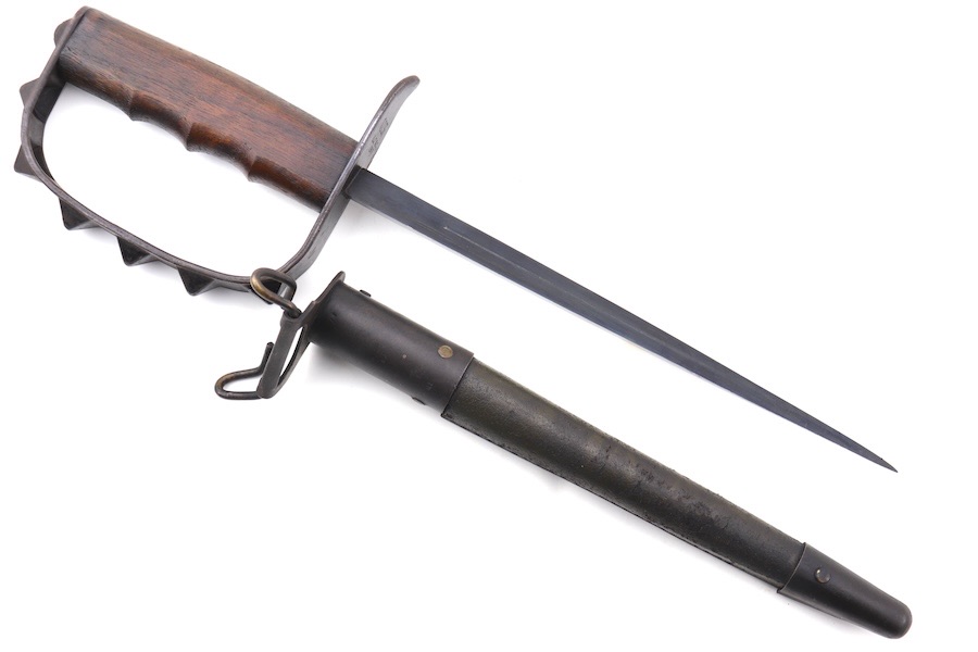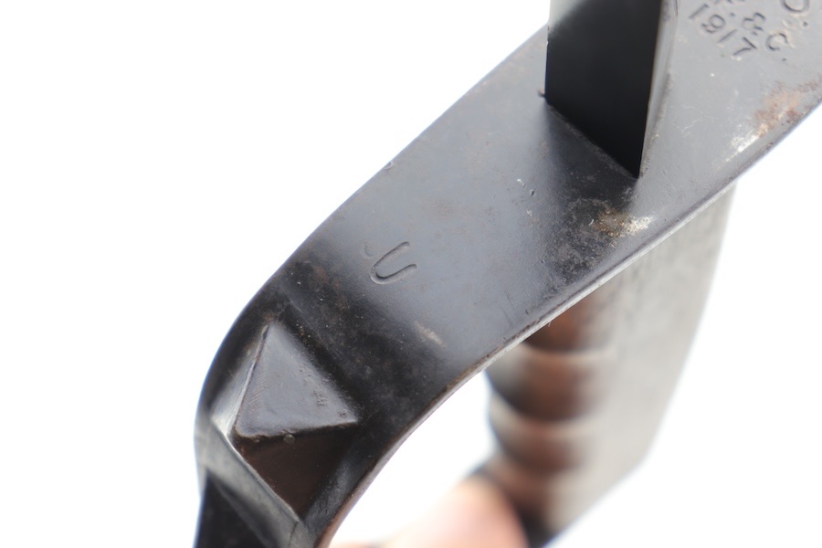 5/29/24 – This is an original, iconic WW1 US M1917 Trench Knife. The knife comes complete with an original scabbard. The knife blade is 3-sided. There’s mild finish loss on each side of the blade, but overall the original finish is near-excellent for a WW1 example. The hand guard has a few small dings and imperfections, but the original finish is mostly intact. Very nice wood handle with no cracks or chips. The scabbard is excellent, with a fairly clean leather body and minimal patina on the metal tips. Maker marked “JEWELL 1918” on the scabbard leather. This is a very nice original example.