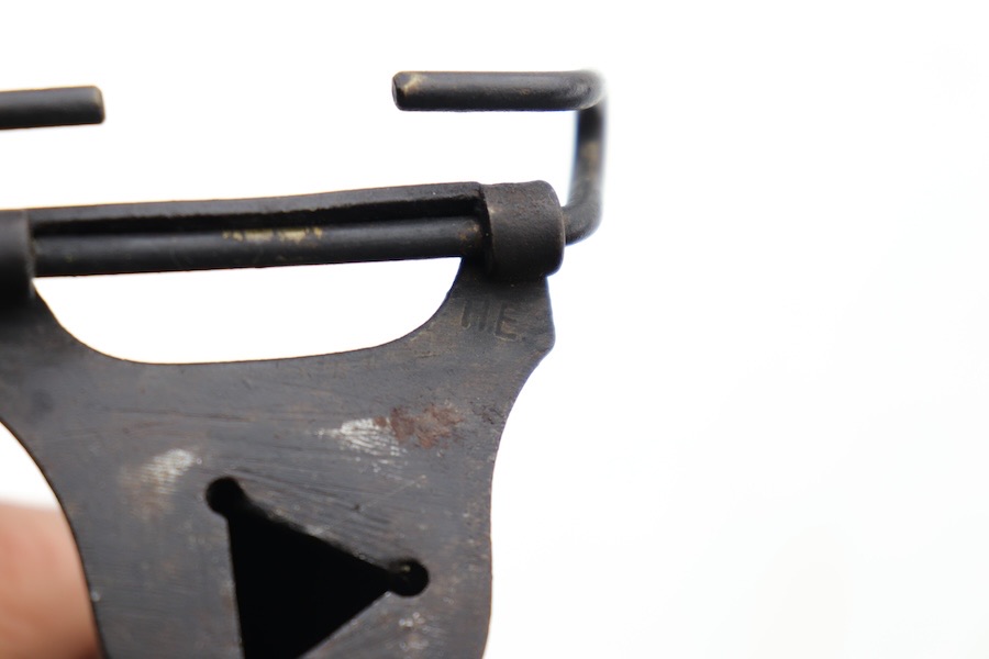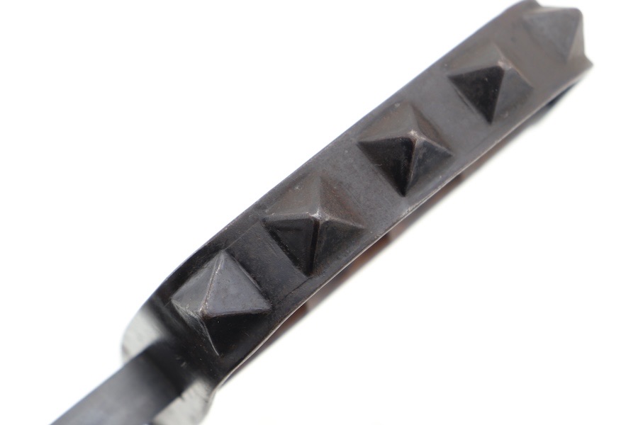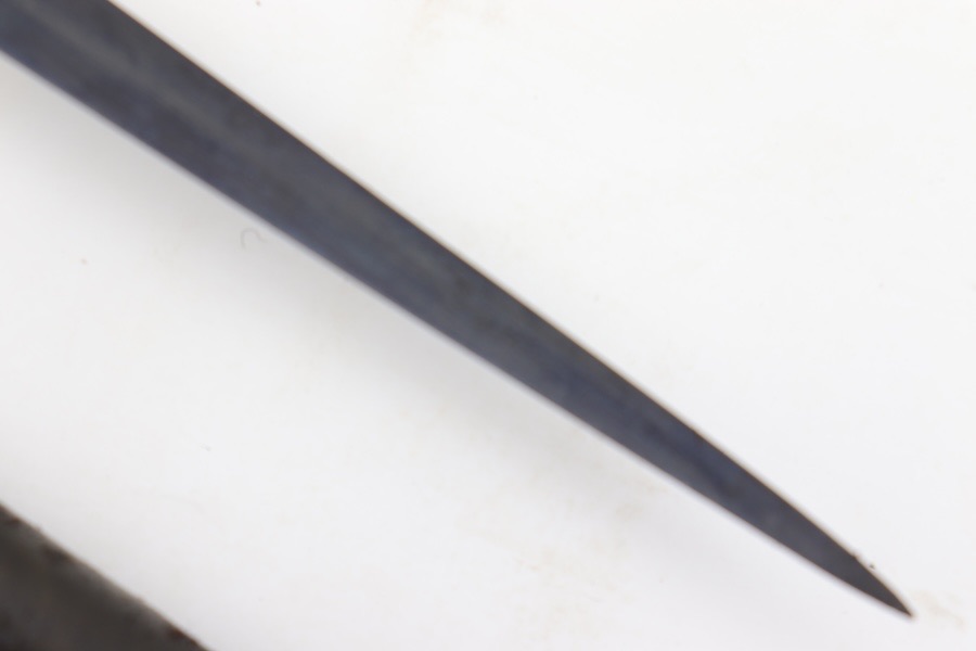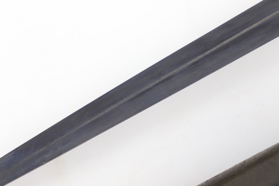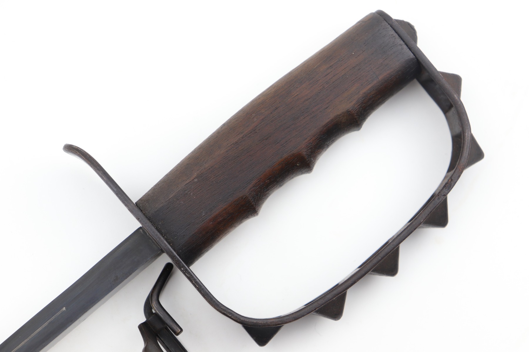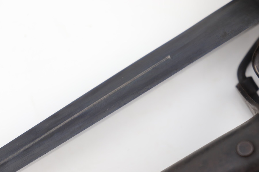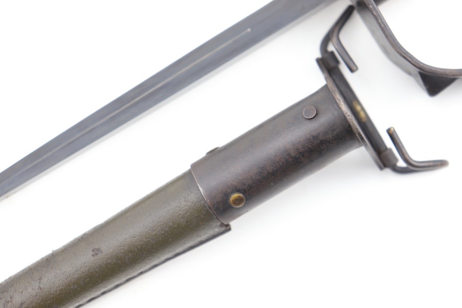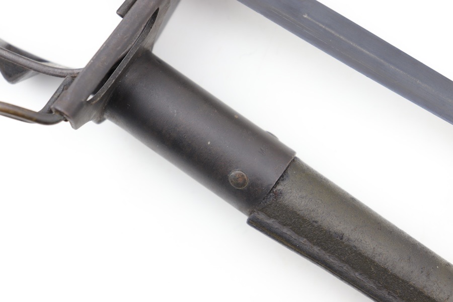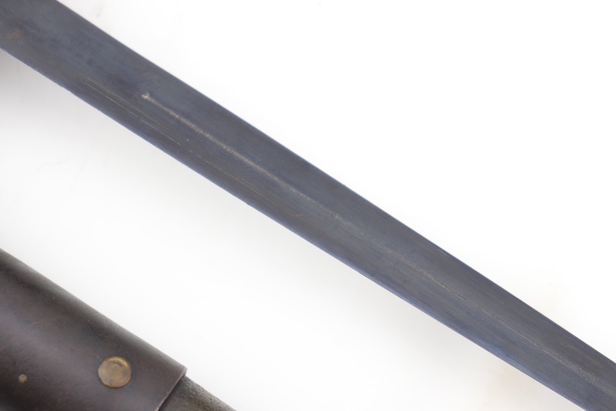 5/29/24 – This is an original, iconic WW1 US M1917 Trench Knife. The knife comes complete with an original scabbard. The knife blade is 3-sided. There’s mild finish loss on each side of the blade, but overall the original finish is near-excellent for a WW1 example. The hand guard has a few small dings and imperfections, but the original finish is mostly intact. Very nice wood handle with no cracks or chips. The scabbard is excellent, with a fairly clean leather body and minimal patina on the metal tips. Maker marked “JEWELL 1918” on the scabbard leather. This is a very nice original example.