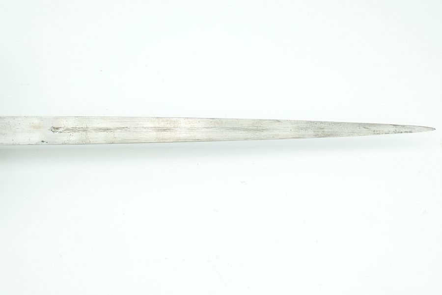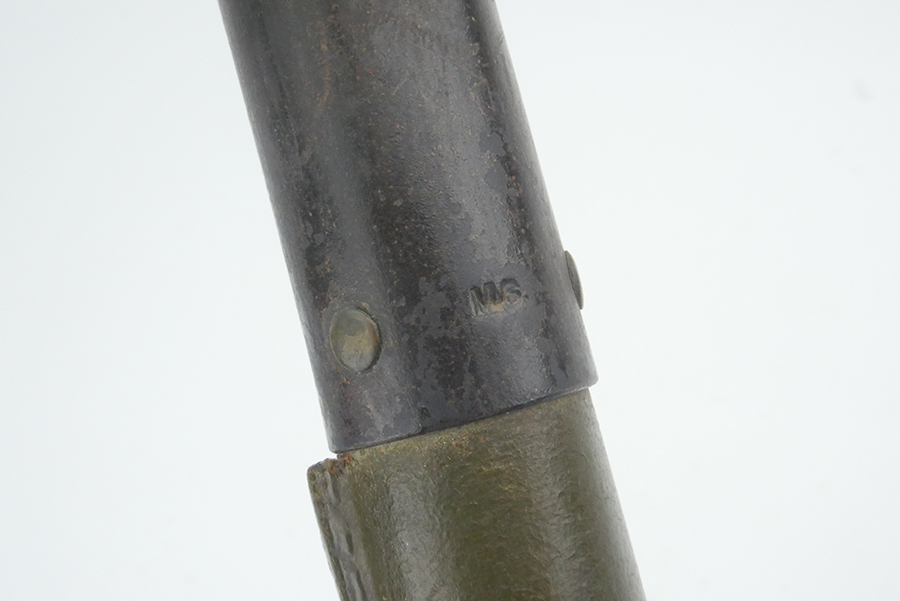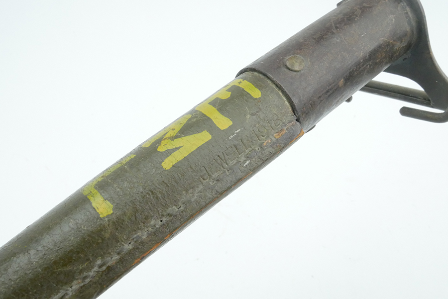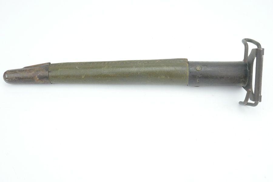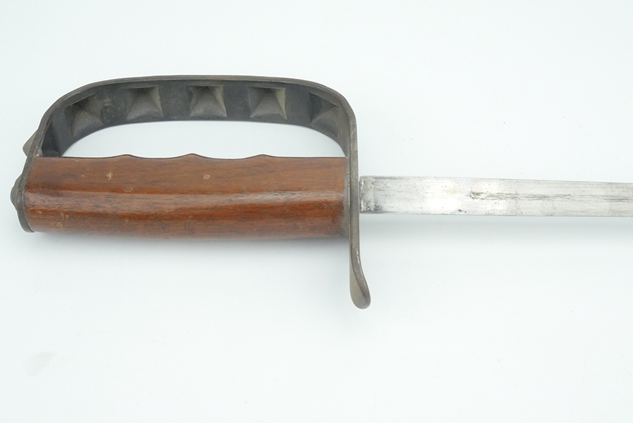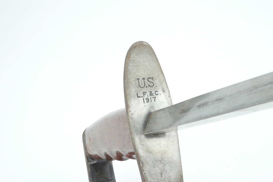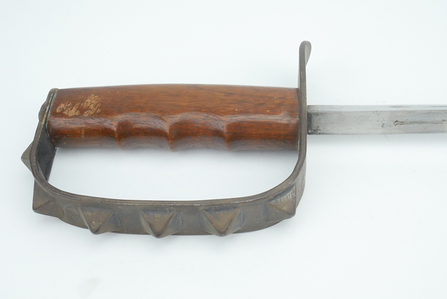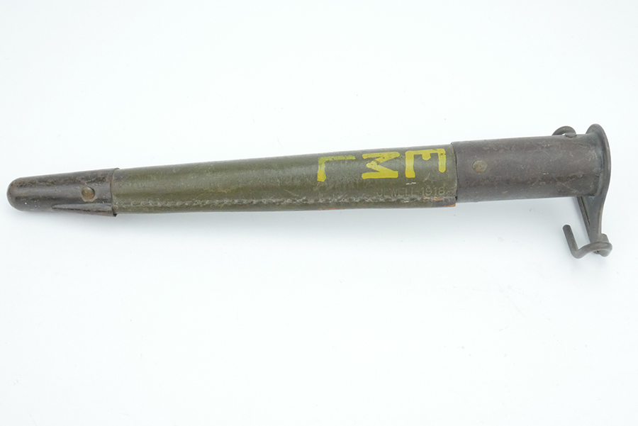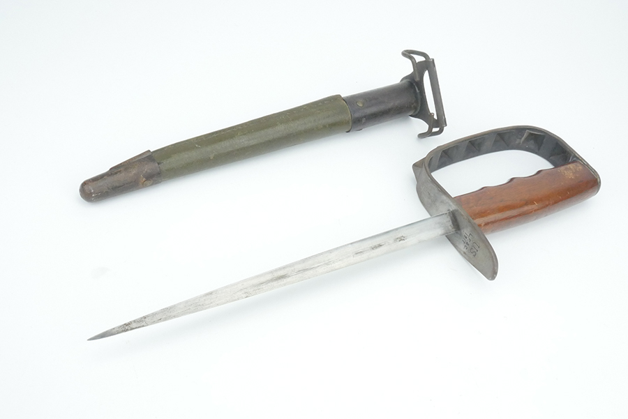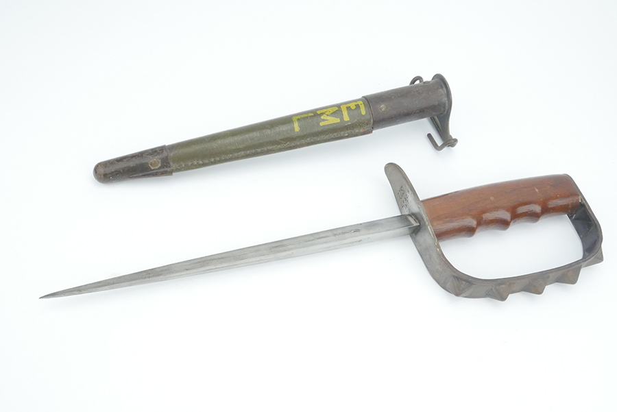 6/19/24 – This is an original, iconic WW1 US M1917 Trench Knife. The knife comes complete with an original scabbard. The 3-sided blade has lost most of its original finish but the blade itself is in excellent shape, particularly for a WW1 example. The hand guard has some finish loss and minor patina, but is in otherwise excellent condition. Very nice wood handle with no cracks or chips, just one small area with some light scratches on the right side. The scabbard is excellent, with clean leather body and minimal patina on the metal tips. Maker marked “JEWELL 1918” on the scabbard leather. A high-end example.