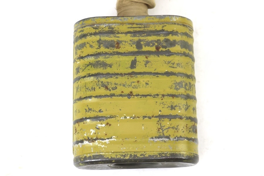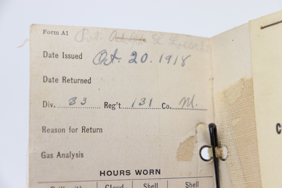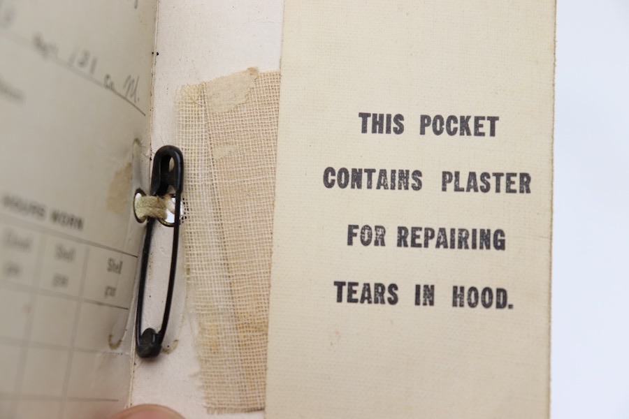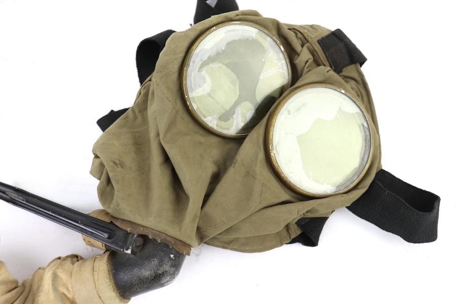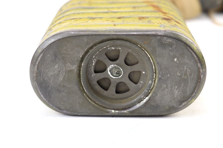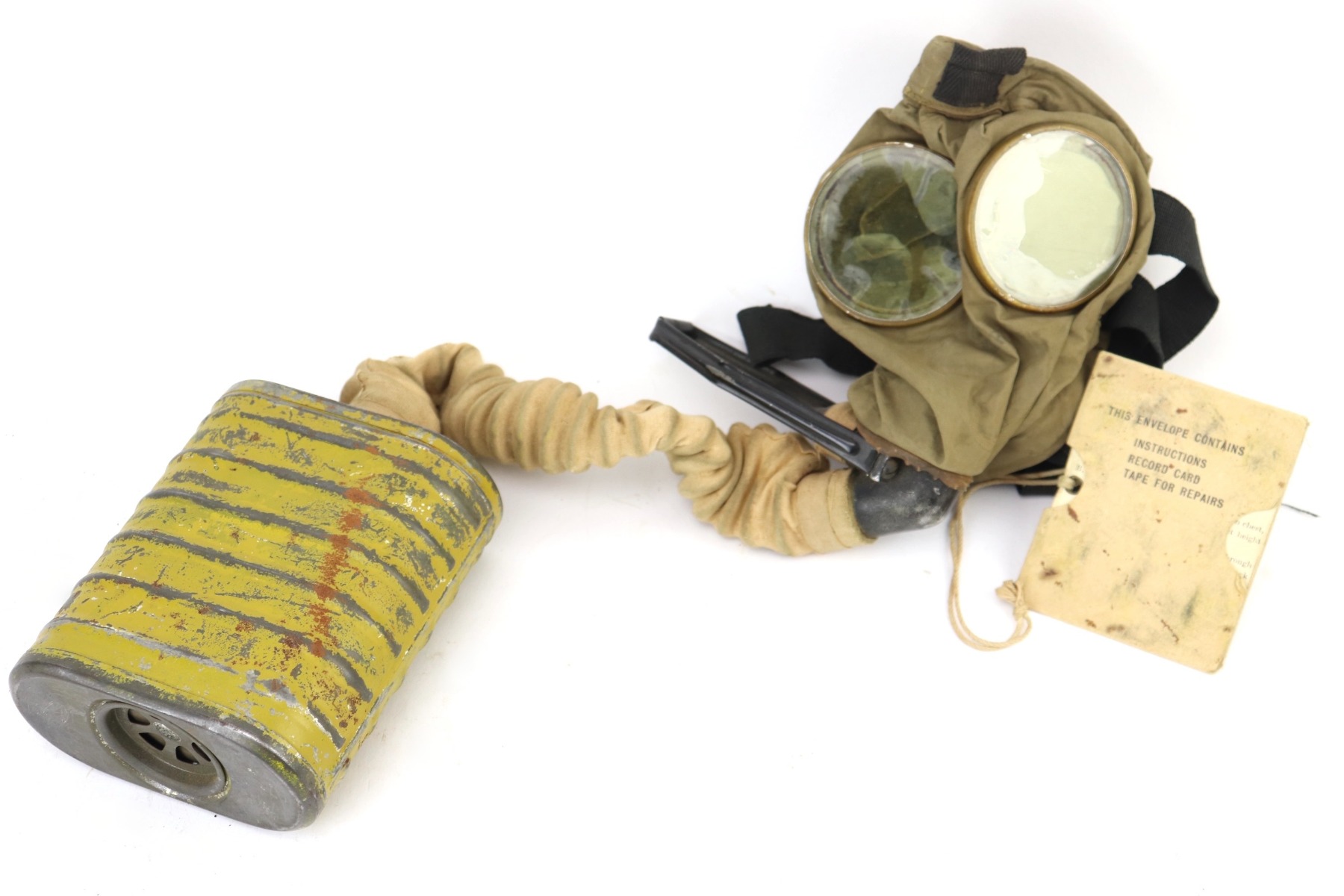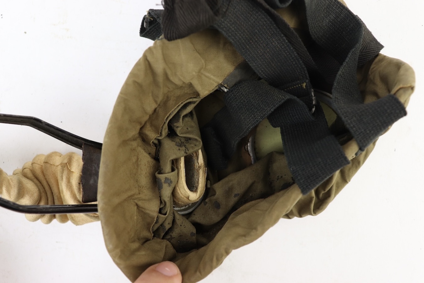 10/5/23 – This is an original M1917 SBR gas mask issued to American troops in WW1. This example shows some deterioration inside the mask, with the glass eyepieces intact and no cracks. The tube to the canister has hardened and is no longer malleable. The canister has about 60% of the yellow paint left, with a minor surface patina on the exposed metal. Original instruction pamphlet is included and is dated 1918. Overall great condition.