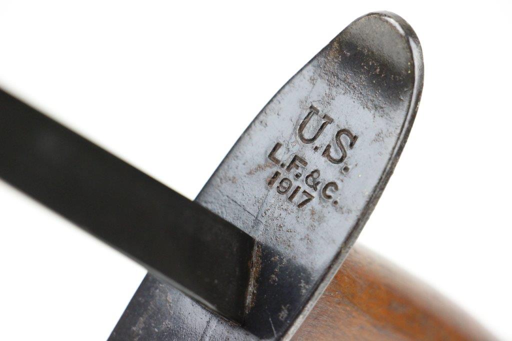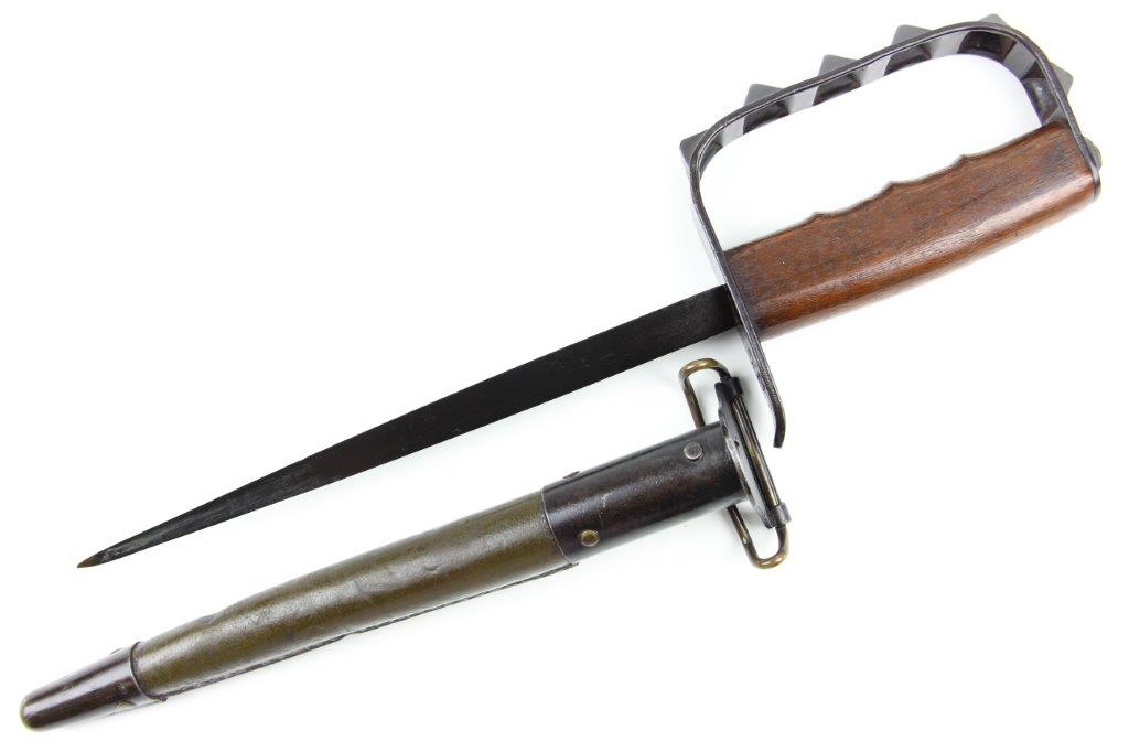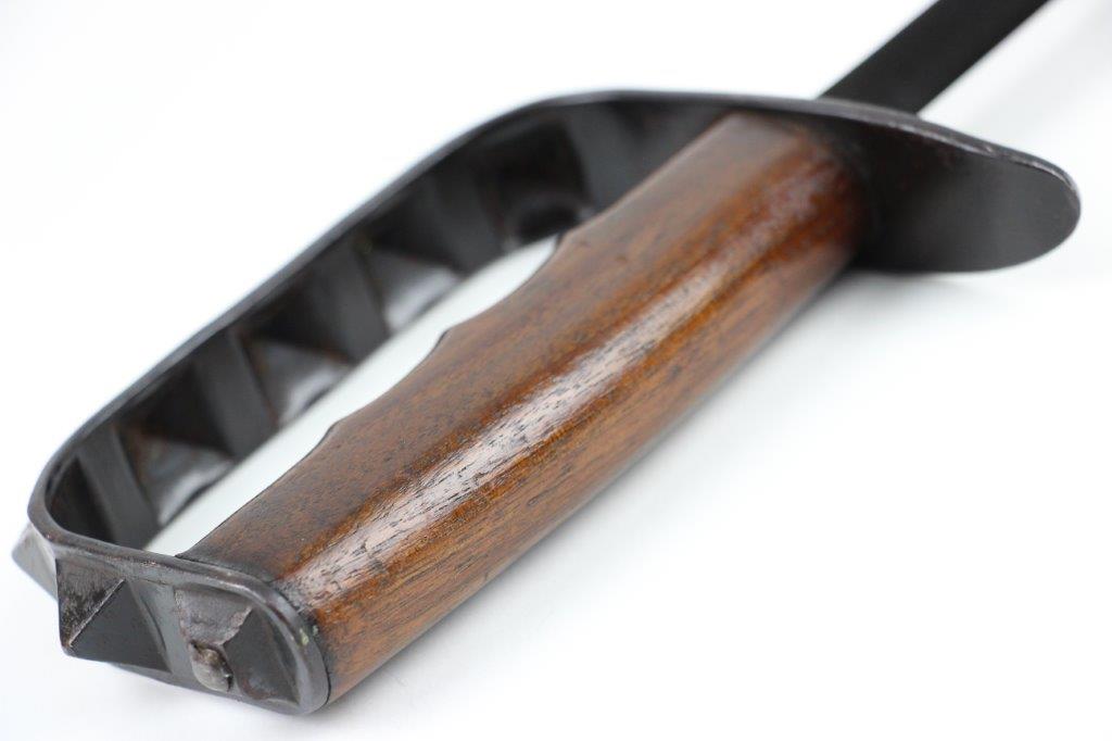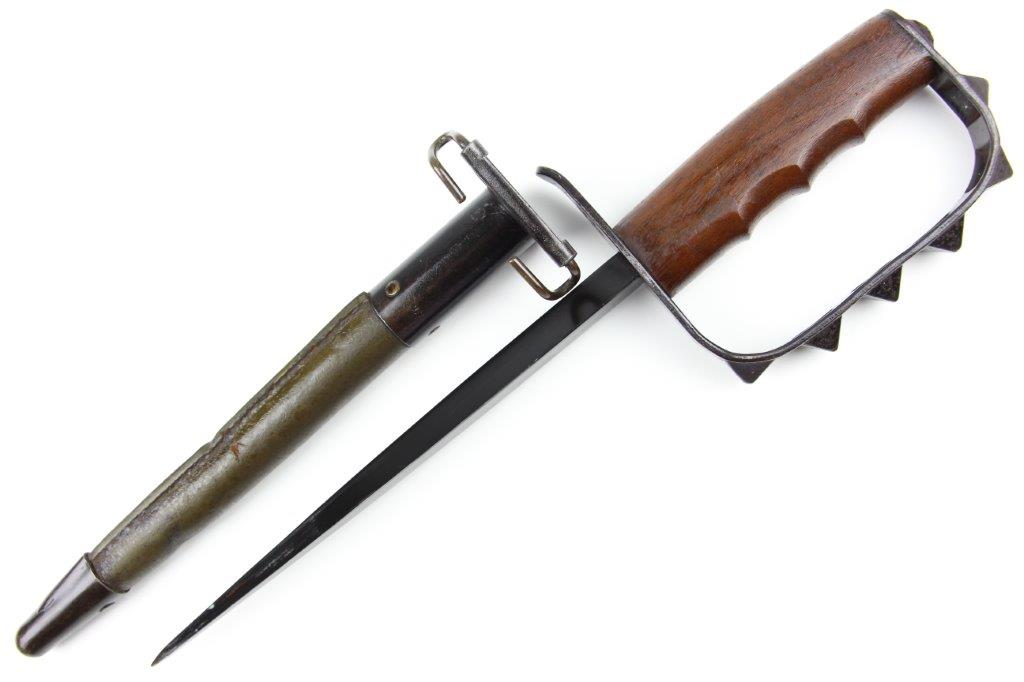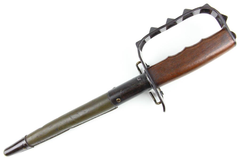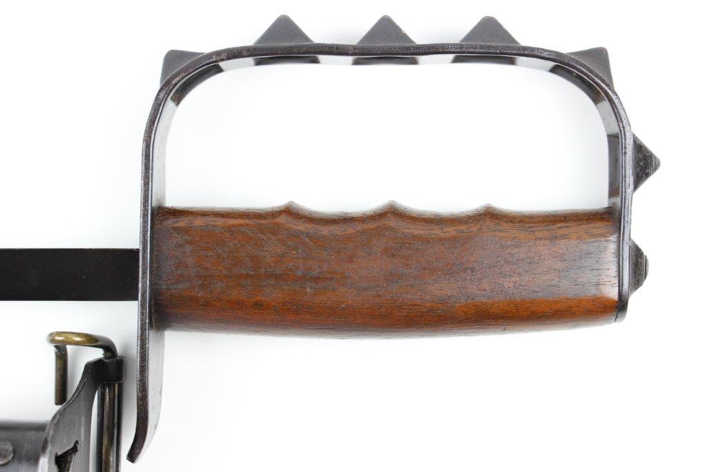 4/5/24 – This is an original WW1 US M1917 Trench Knife. The knife comes with an original scabbard and in great overall condition. The blade has dark finish throughout with some mild finish loss on the tip, along with minimal scabbard rub wear. Beautiful condition blade and edges. The hand guard is maker stamped and dated on the top. There’s spotty surface patina and mild discoloration throughout the hand guard and triangular-shaped spikes. Excellent wood handle with no cracks or chips. The scabbard has excellent finish throughout with some mild surface aging but no major issues. Properly marked and maker stamped “Jewell 1918”.