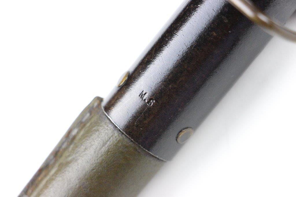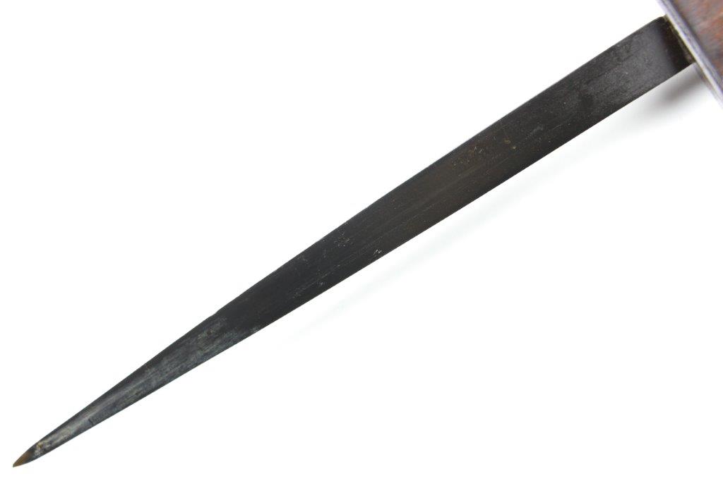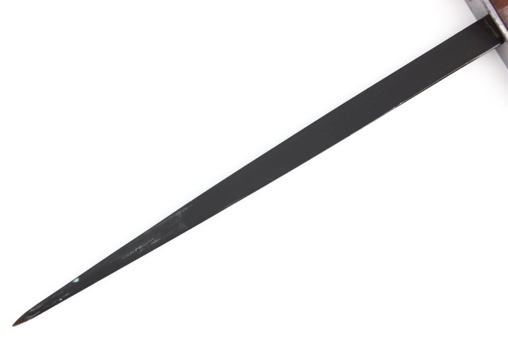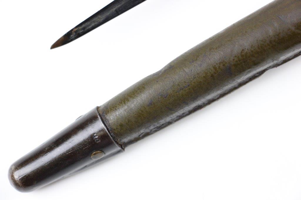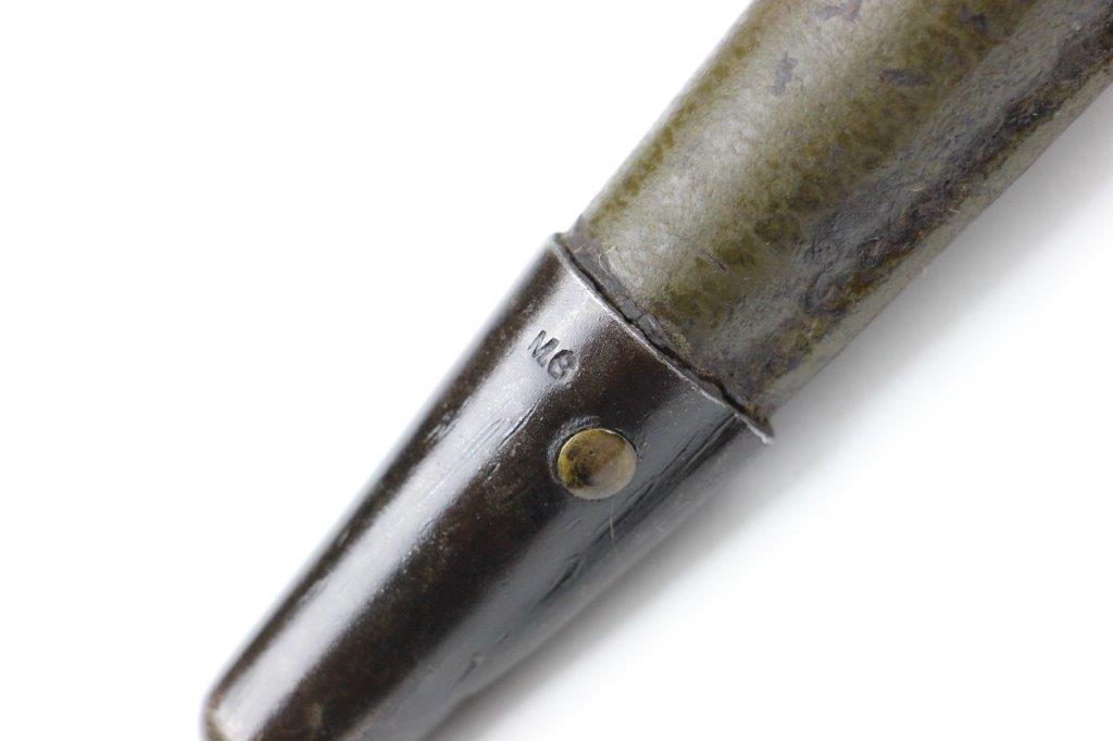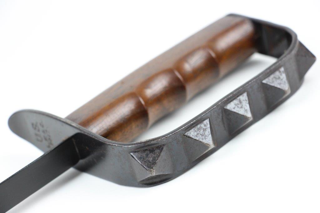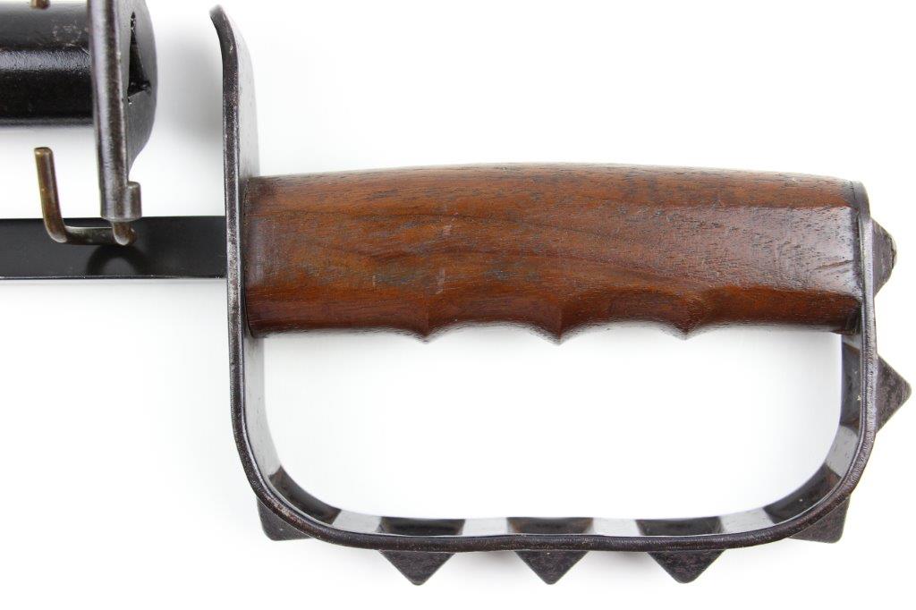 4/5/24 – This is an original WW1 US M1917 Trench Knife. The knife comes with an original scabbard and in great overall condition. The blade has dark finish throughout with some mild finish loss on the tip, along with minimal scabbard rub wear. Beautiful condition blade and edges. The hand guard is maker stamped and dated on the top. There’s spotty surface patina and mild discoloration throughout the hand guard and triangular-shaped spikes. Excellent wood handle with no cracks or chips. The scabbard has excellent finish throughout with some mild surface aging but no major issues. Properly marked and maker stamped “Jewell 1918”.
