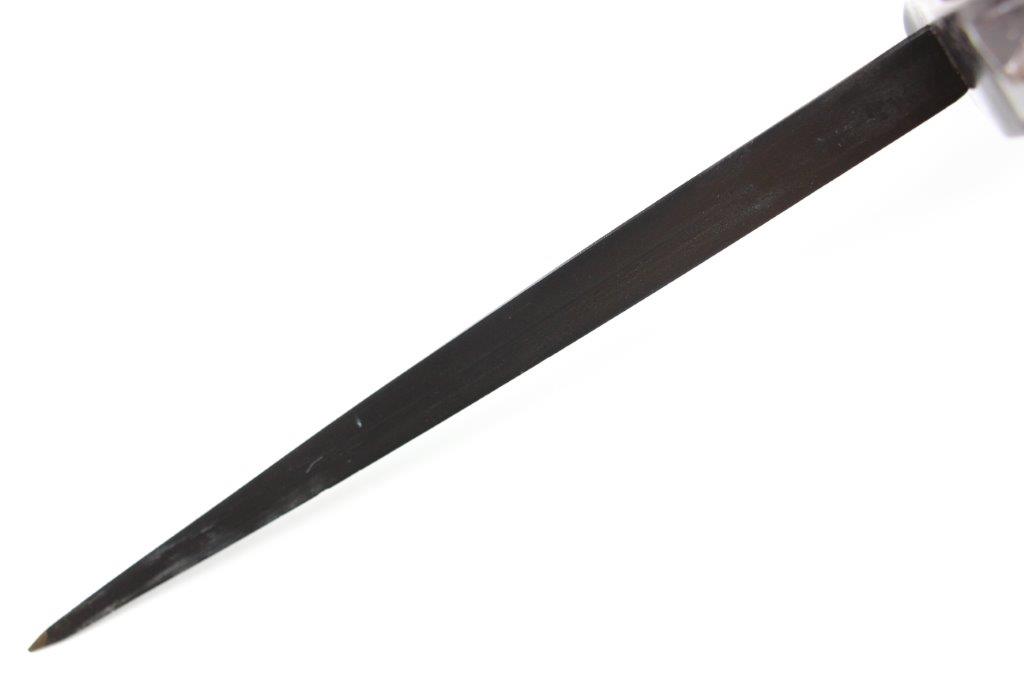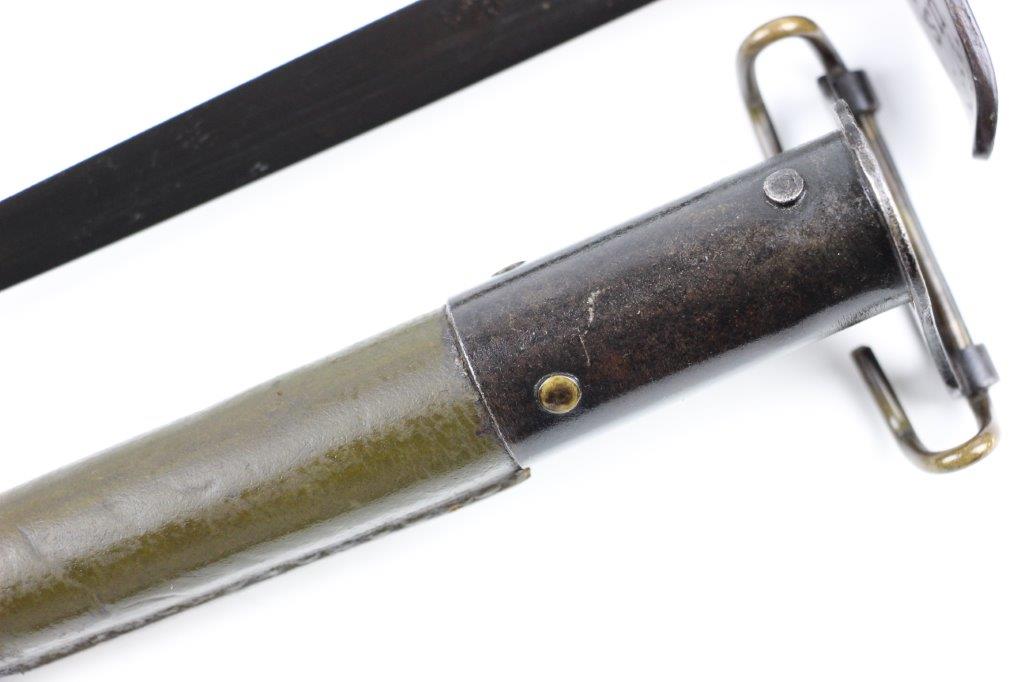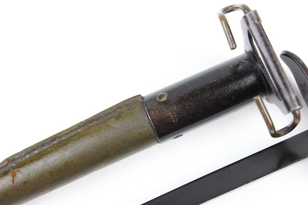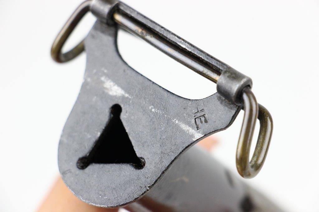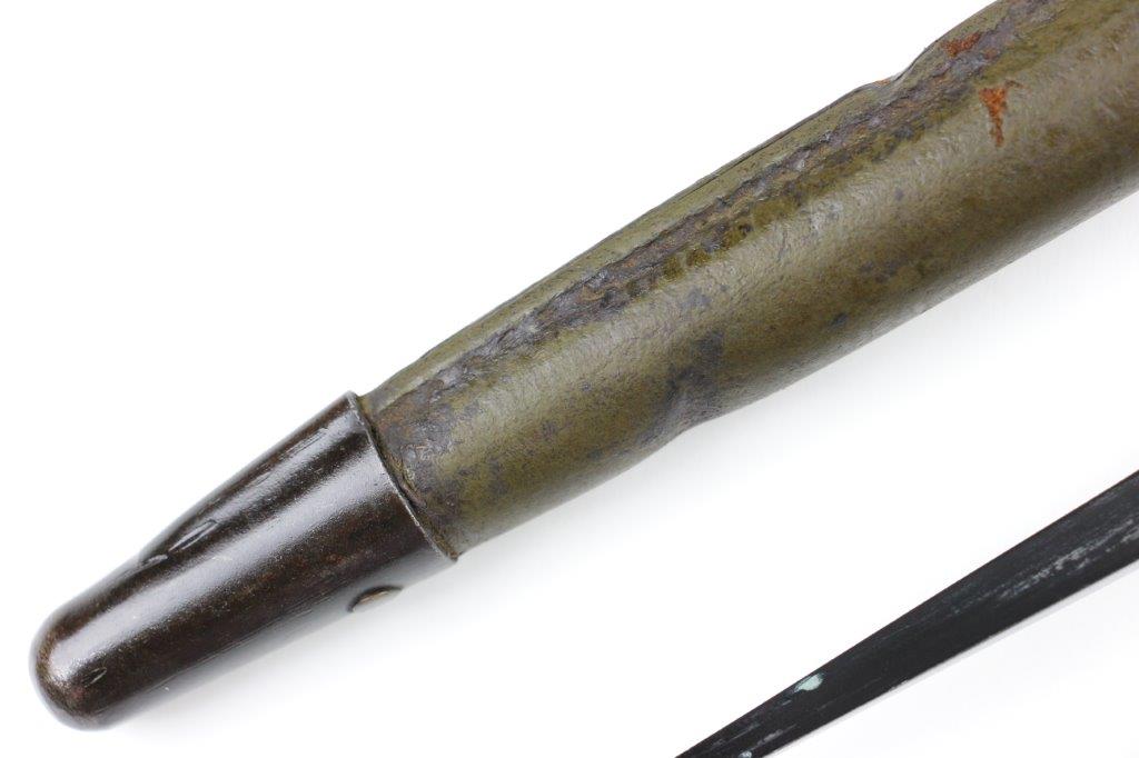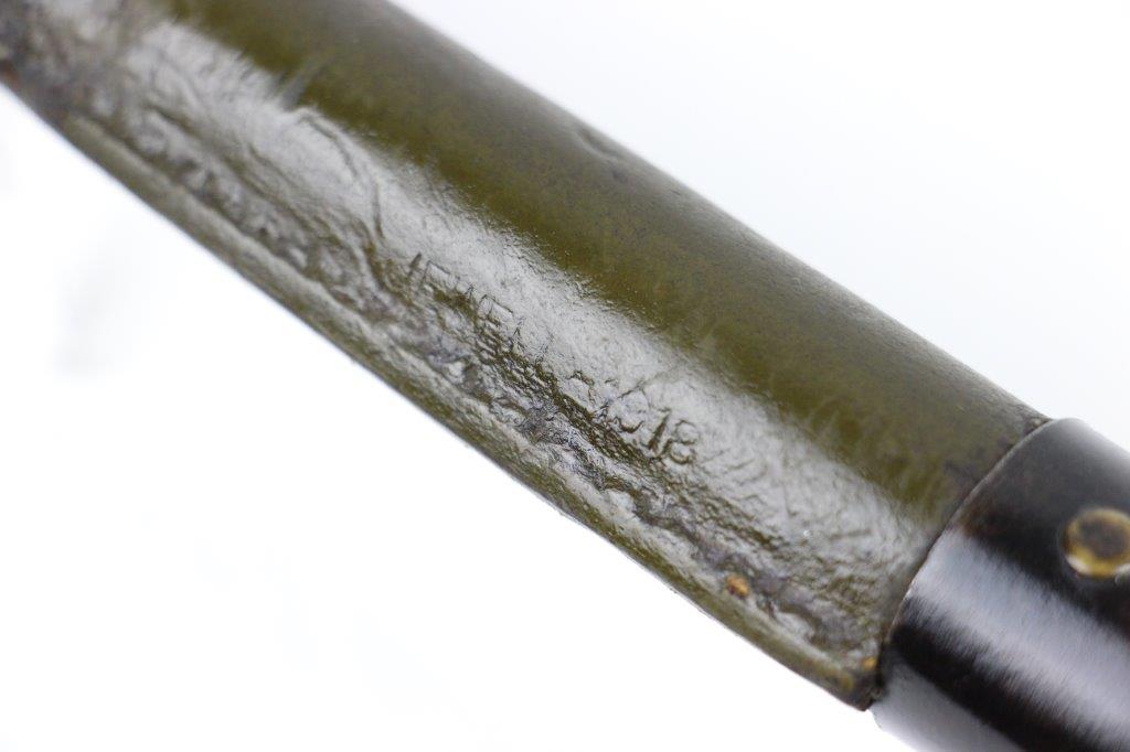 4/5/24 – This is an original WW1 US M1917 Trench Knife. The knife comes with an original scabbard and in great overall condition. The blade has dark finish throughout with some mild finish loss on the tip, along with minimal scabbard rub wear. Beautiful condition blade and edges. The hand guard is maker stamped and dated on the top. There’s spotty surface patina and mild discoloration throughout the hand guard and triangular-shaped spikes. Excellent wood handle with no cracks or chips. The scabbard has excellent finish throughout with some mild surface aging but no major issues. Properly marked and maker stamped “Jewell 1918”.