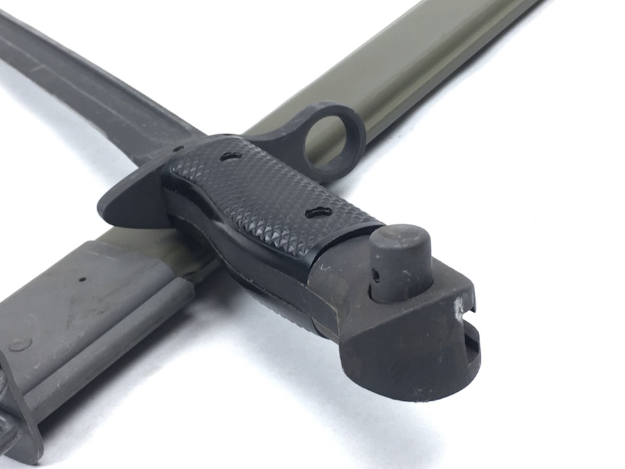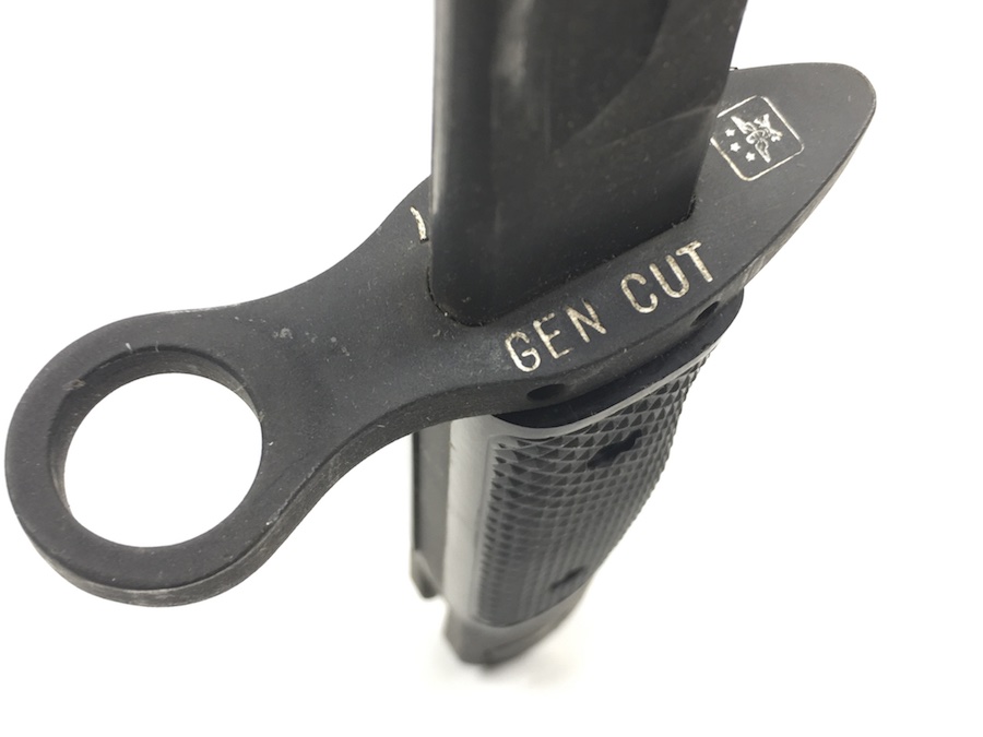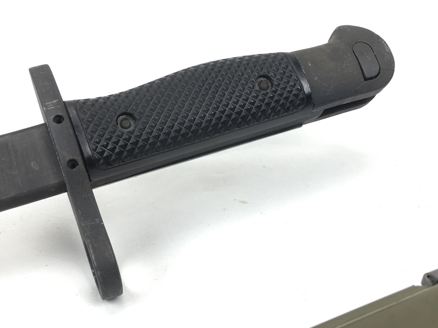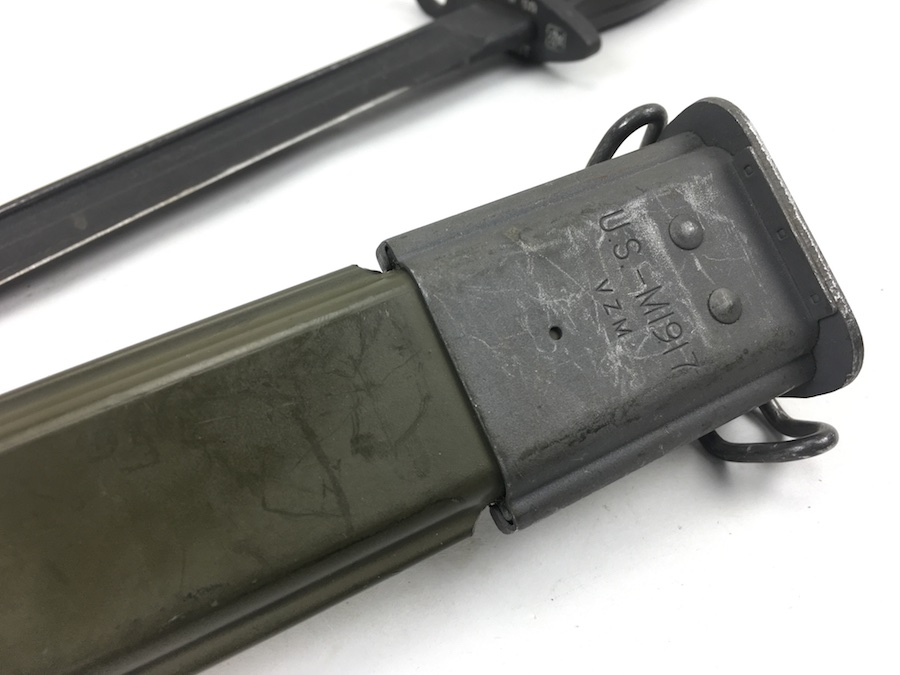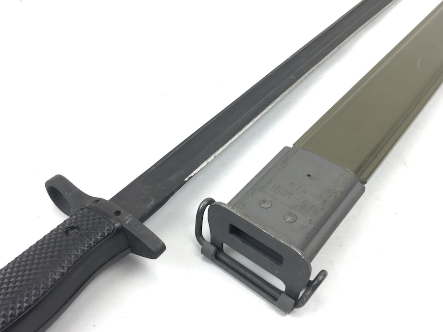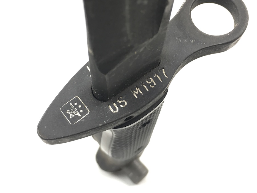 5/28/19 – This is an original M1917 bayonet for a trench shotgun made during the Vietnam war. The bayonet hand guard is stamped “U.S. M1917” and “GEN CUT” for General Cutlery (the maker). Also has the Eagle and Stars emblem. The bayonet is in excellent condition and comes with an original scabbard. No signs of sharpening on alteration on the blade. Overall length is 22.5inches. Handle grips are excellent with no chips or cracks.