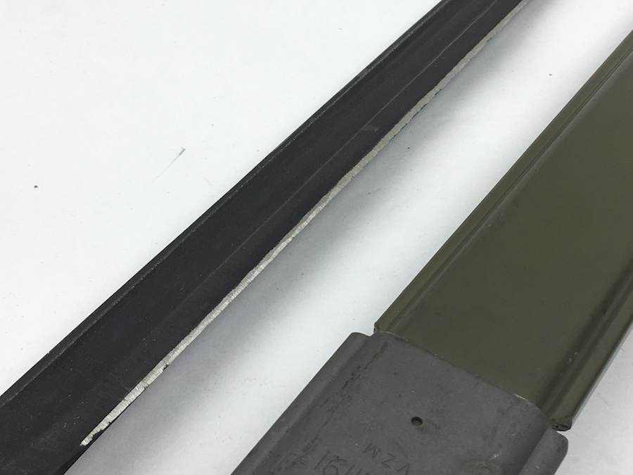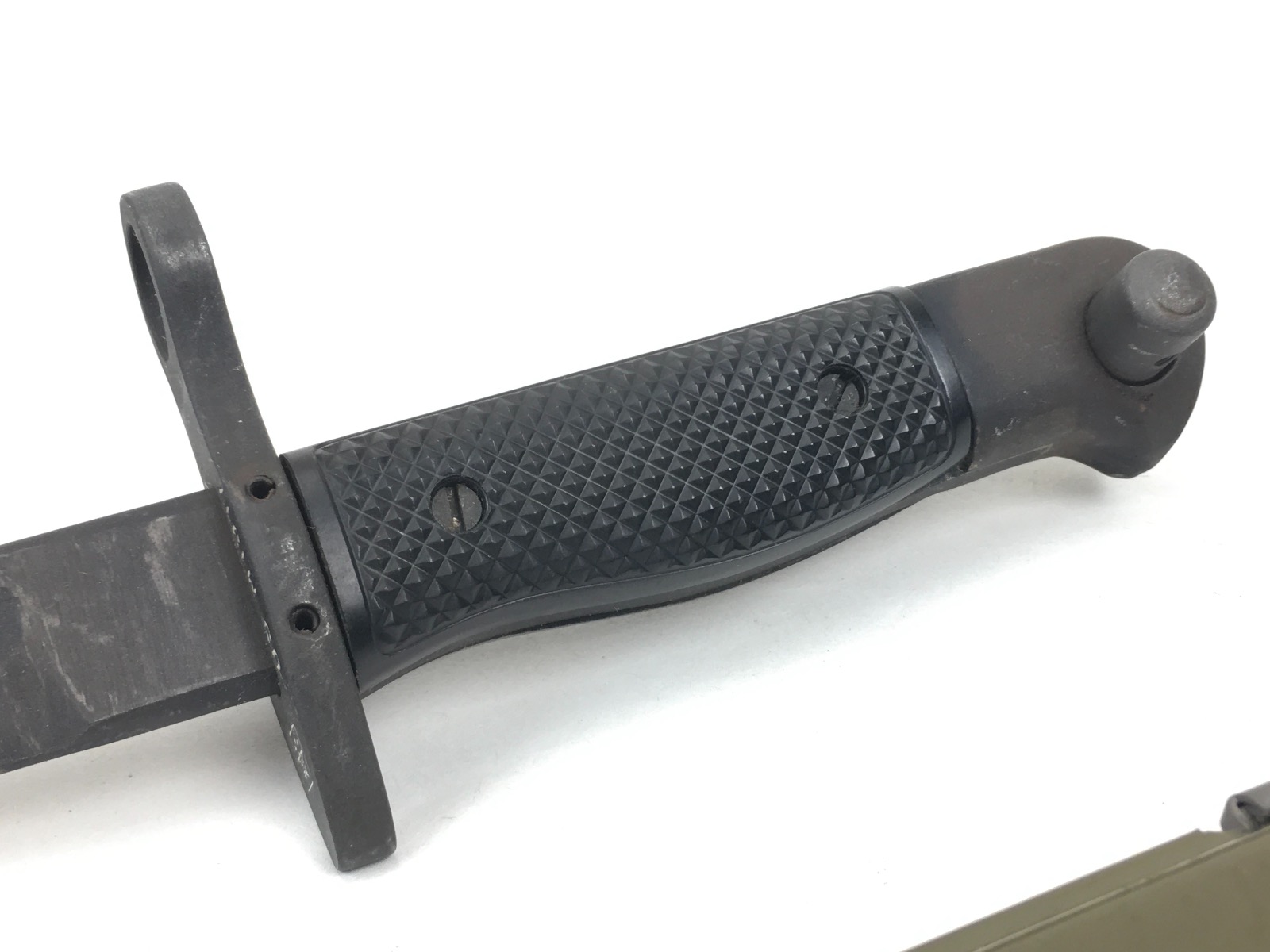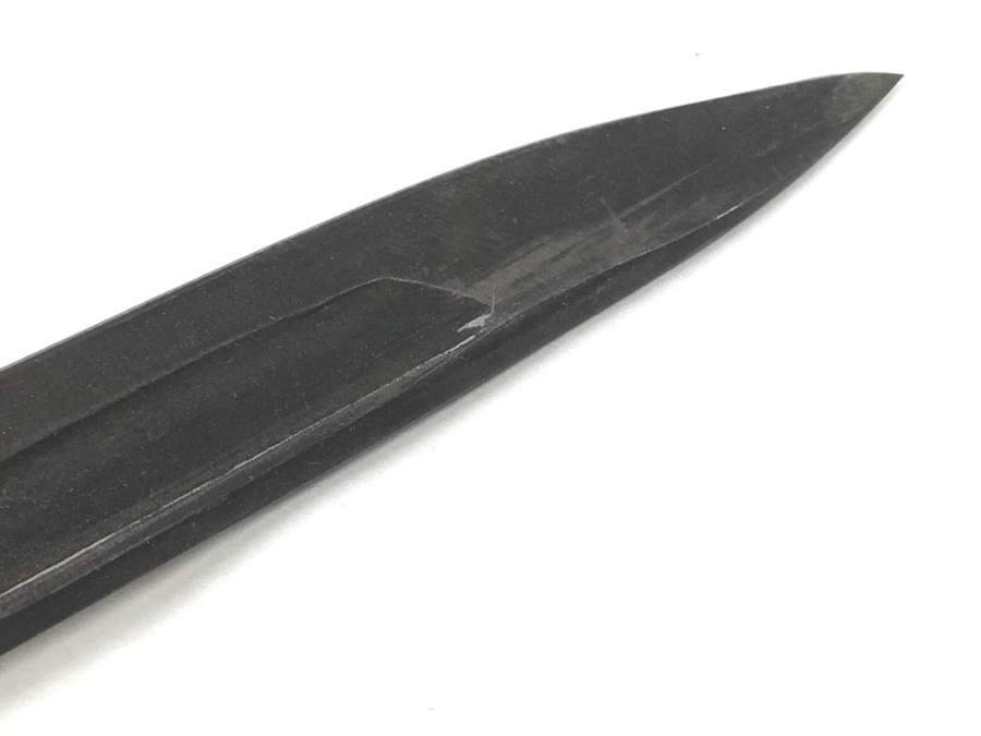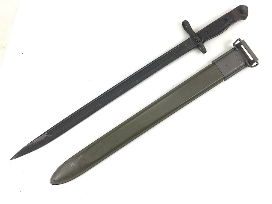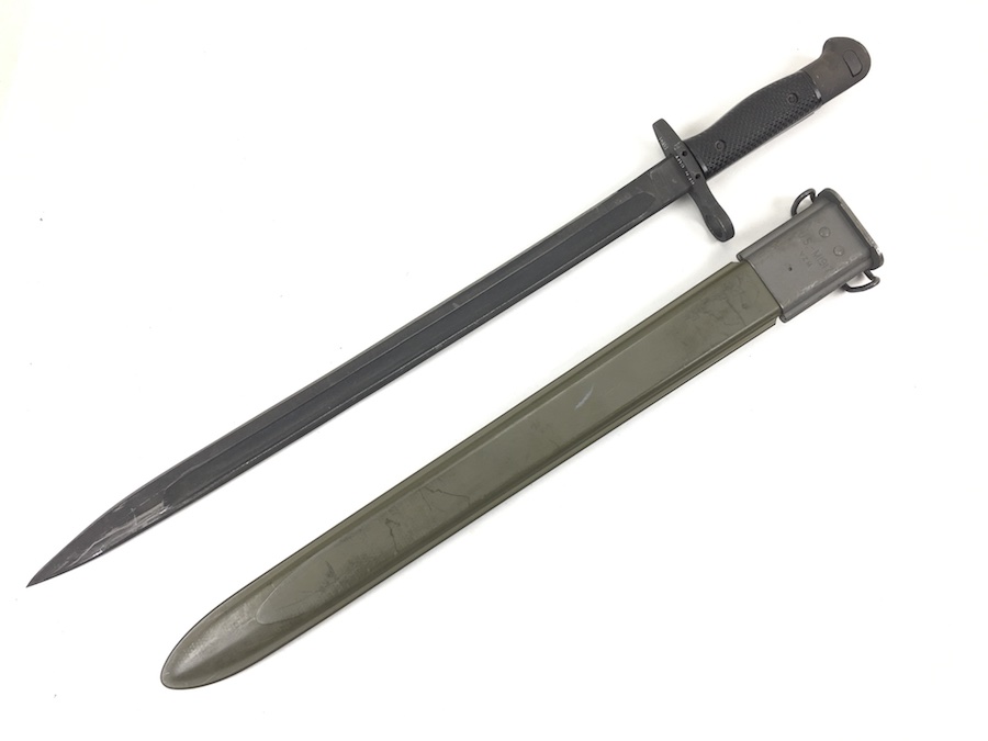 5/28/19 – This is an original M1917 bayonet for a trench shotgun made during the Vietnam war. The bayonet hand guard is stamped “U.S. M1917” and “GEN CUT” for General Cutlery (the maker). Also has the Eagle and Stars emblem. The bayonet is in excellent condition and comes with an original scabbard. No signs of sharpening on alteration on the blade. Overall length is 22.5inches. Handle grips are excellent with no chips or cracks.