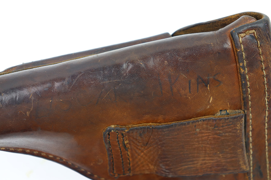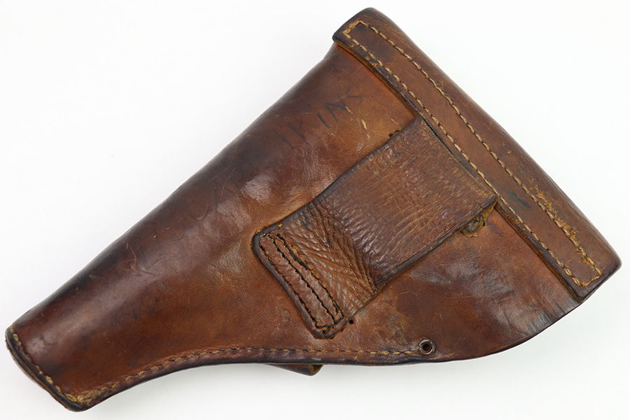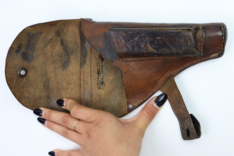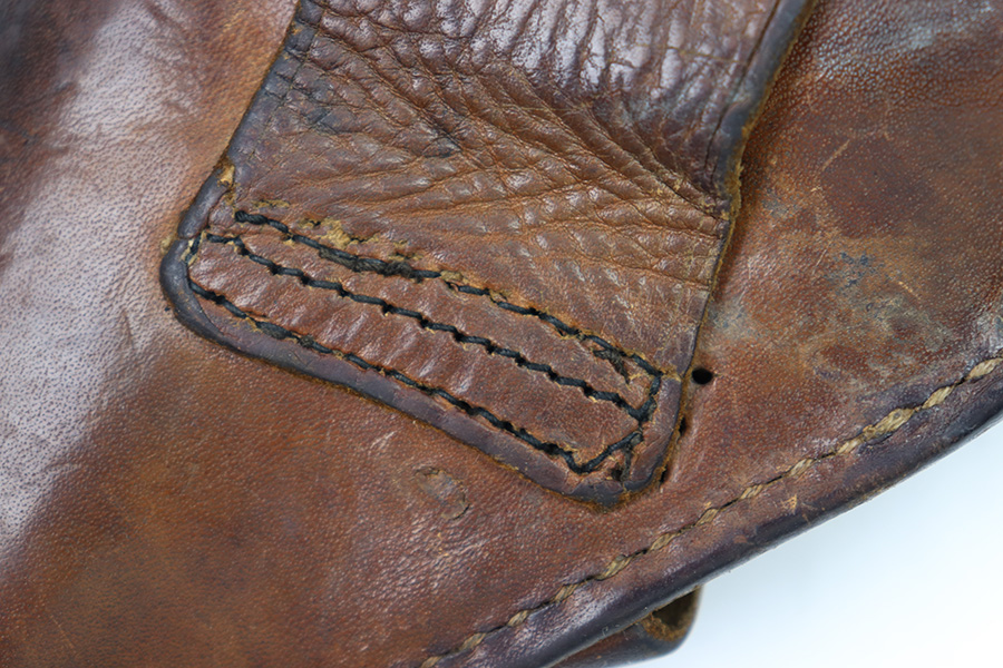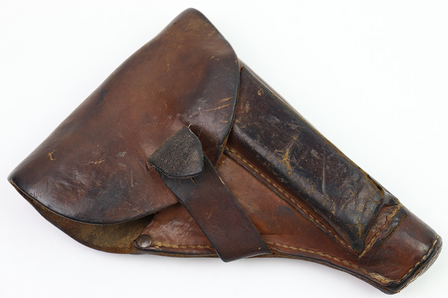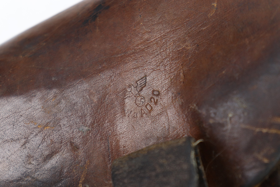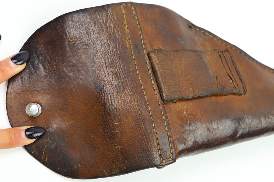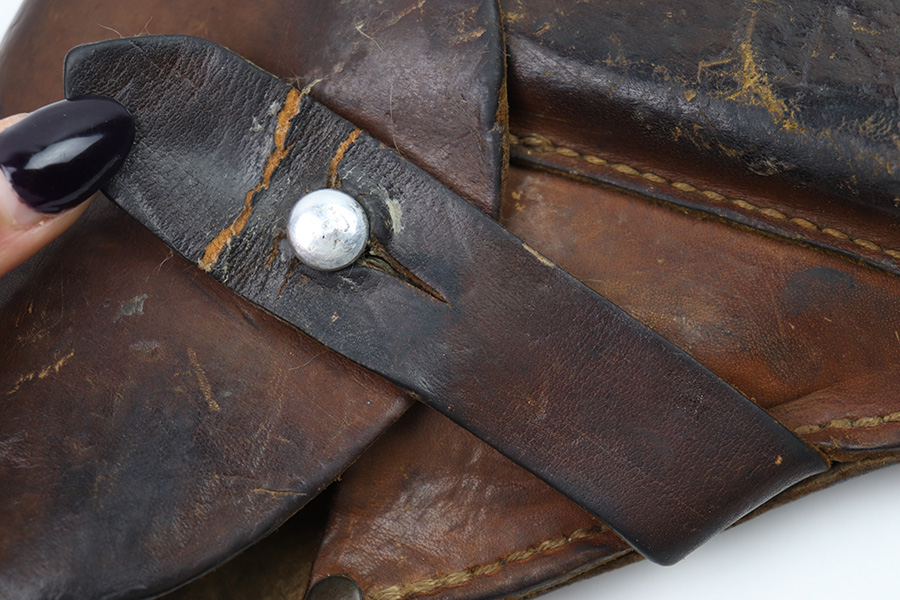 11/15/22 – This is an original WW2 production French Unique M1917 holster. The holster is Nazi proof stamped on the front leather with an eagle/WaAD20 proof stamp. There are no other markings. The leather shows use and aging wear with light surface scuffs and discoloration throughout. The closure strap is bent at the tip, and there’s some cracking along this bend in the leather. The stitching is all original except for the back belt loop, which has been re-stitched as shown.