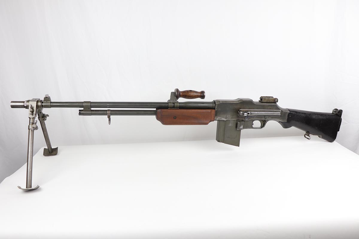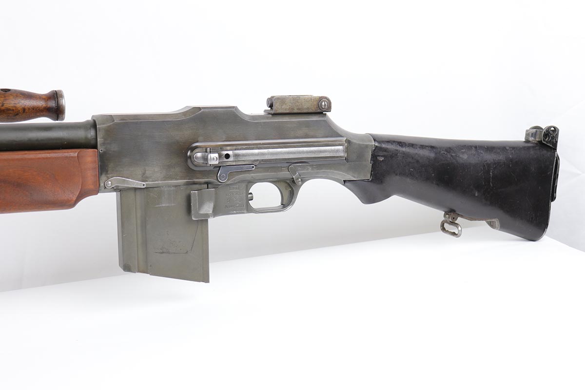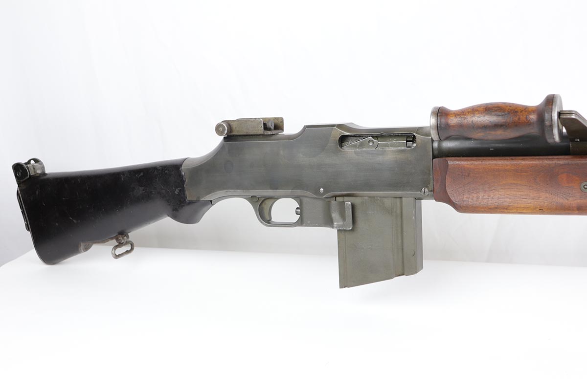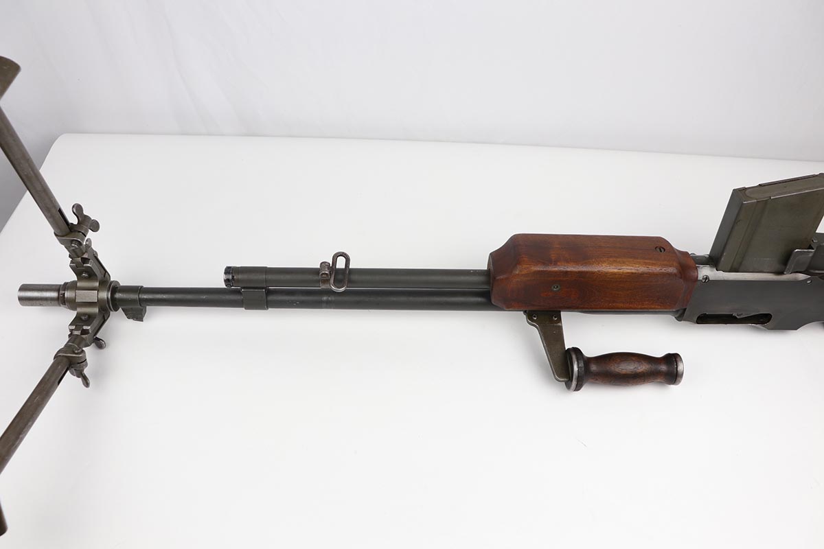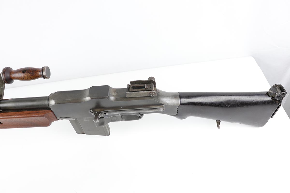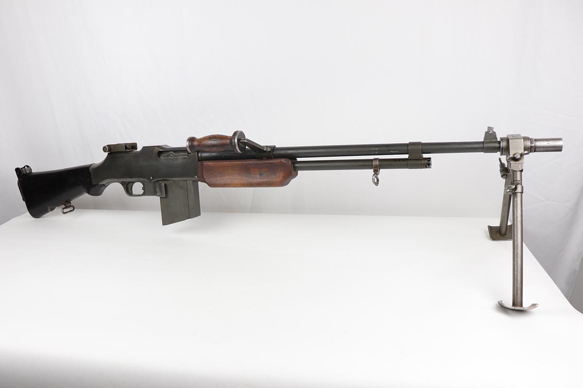 9/6/19 – Manufactured by Philadelphia Ordnance, this is an excellent example of a dummy BAR M1918 rifle. This is an 80% receiver with all US military parts, aside from the receiver. Barrel is dated to October of 1952, while most of the other parts are WW2 era. The parts kit has been reassembled onto a BATF approved steel new made display receiver complete with the with correct adjustable bipod, exceptional bakelite butt stock, flash hider and 20 round magazine. Will make an awesome display or can be used for a super desirable semi-auto rebuild.