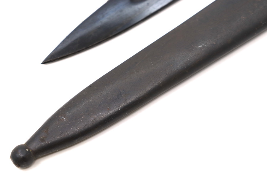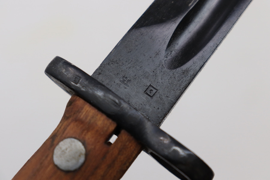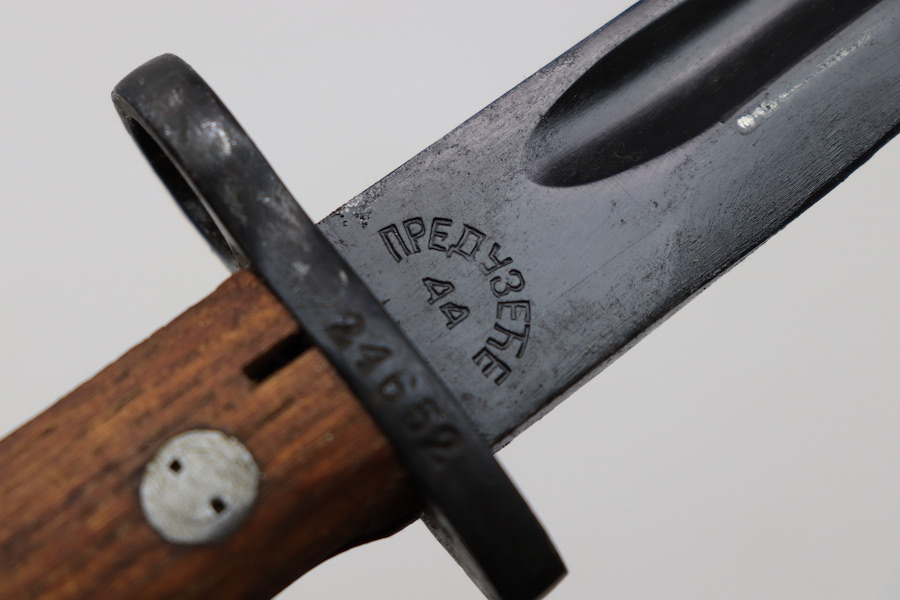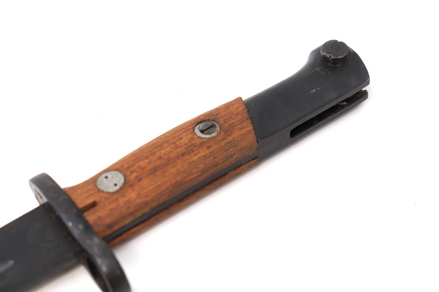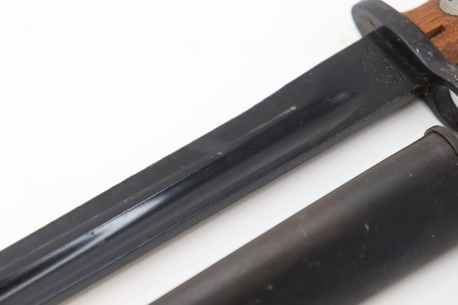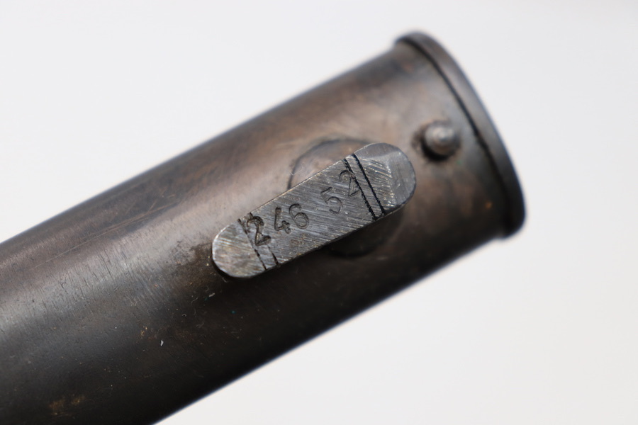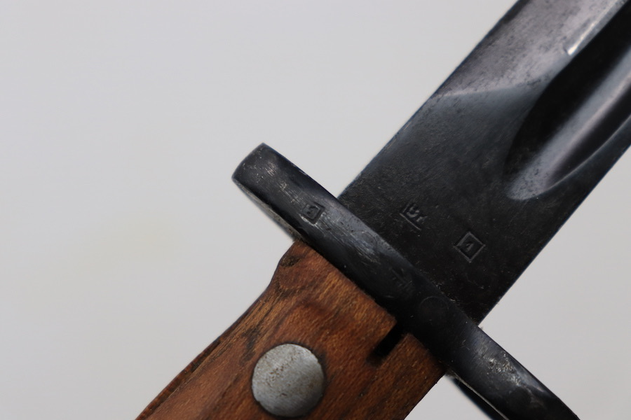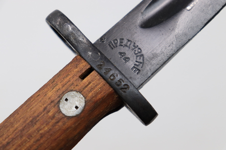 9/8/23 – This is an excellent condition Yugoslavian Mauser bayonet with a matching scabbard. This bayonet features all blued steel, with the blade retaining 95% of its original finish and no evidence of re-sharpening. The ricasso shows Cyrillic writing, the number 44, and different symbols on the reverse. Below is the serial number matching the scabbard; it reads 24652. Wood grips are tightly secured and are without chips/cracks. The scabbard has minor spots of speckling finish loss but otherwise comes in top shape with no rust, pitting, or dents.