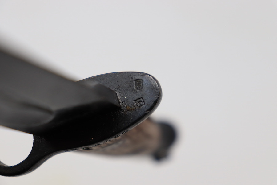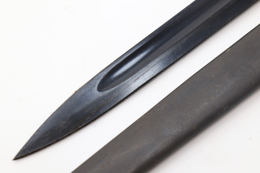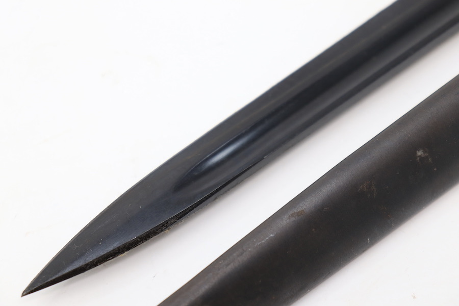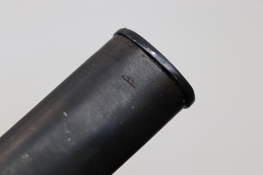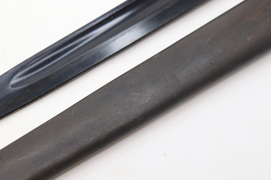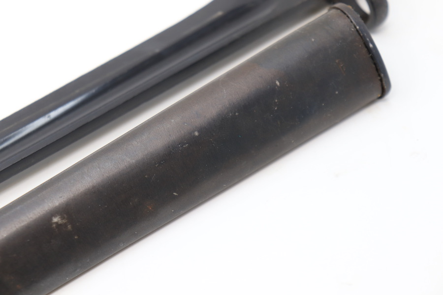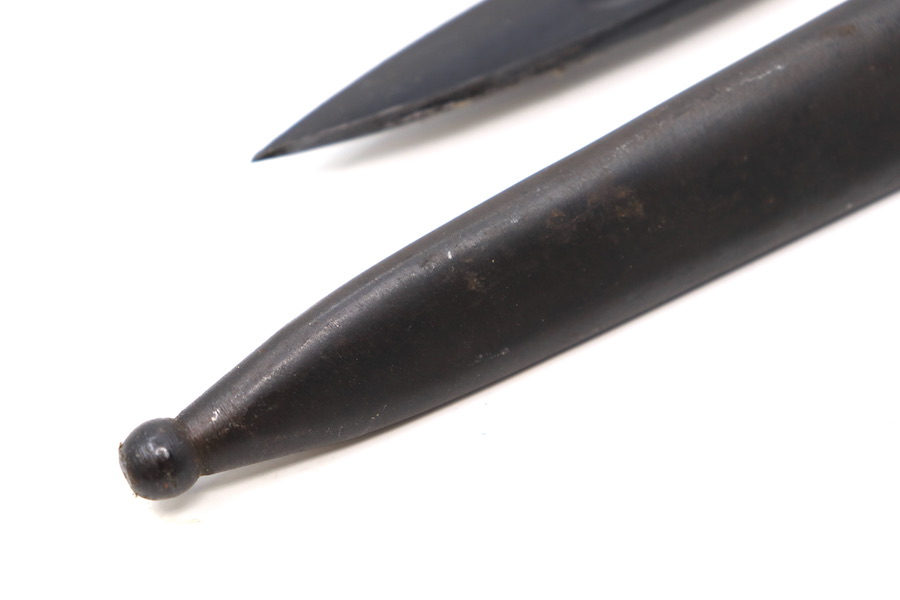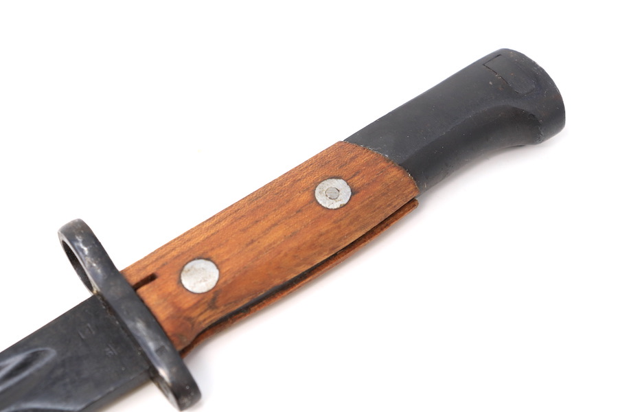 9/8/23 – This is an excellent condition Yugoslavian Mauser bayonet with a matching scabbard. This bayonet features all blued steel, with the blade retaining 95% of its original finish and no evidence of re-sharpening. The ricasso shows Cyrillic writing, the number 44, and different symbols on the reverse. Below is the serial number matching the scabbard; it reads 24652. Wood grips are tightly secured and are without chips/cracks. The scabbard has minor spots of speckling finish loss but otherwise comes in top shape with no rust, pitting, or dents.