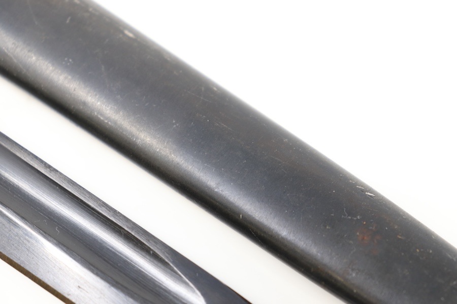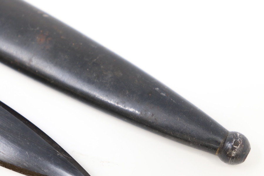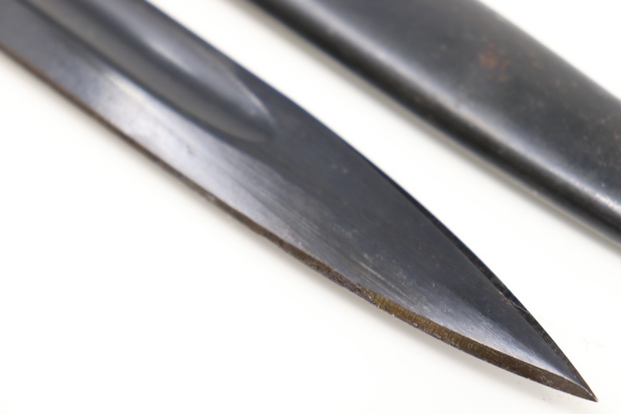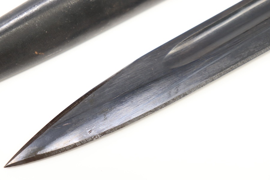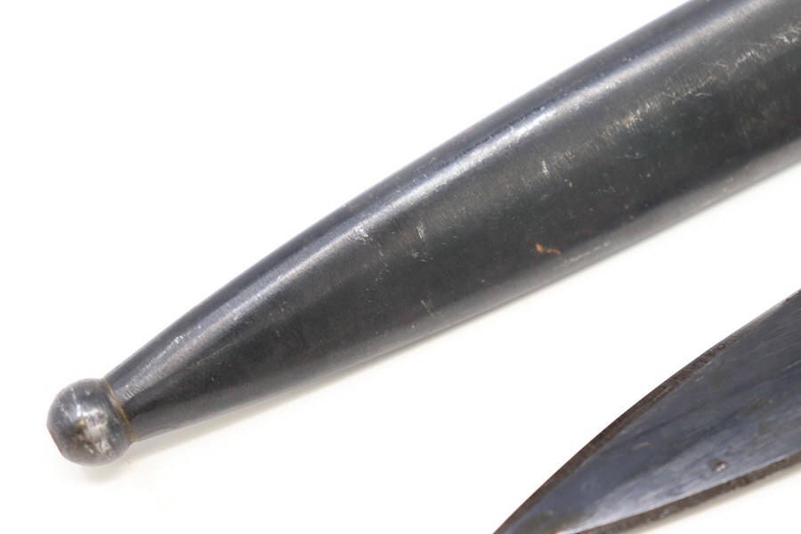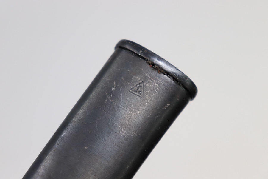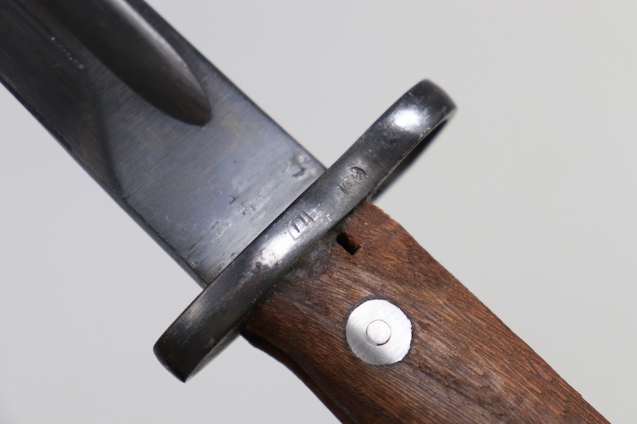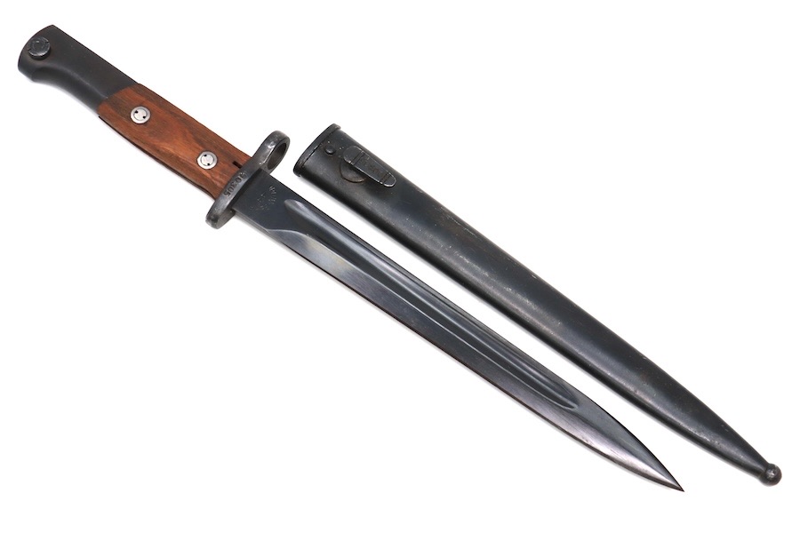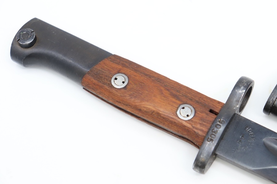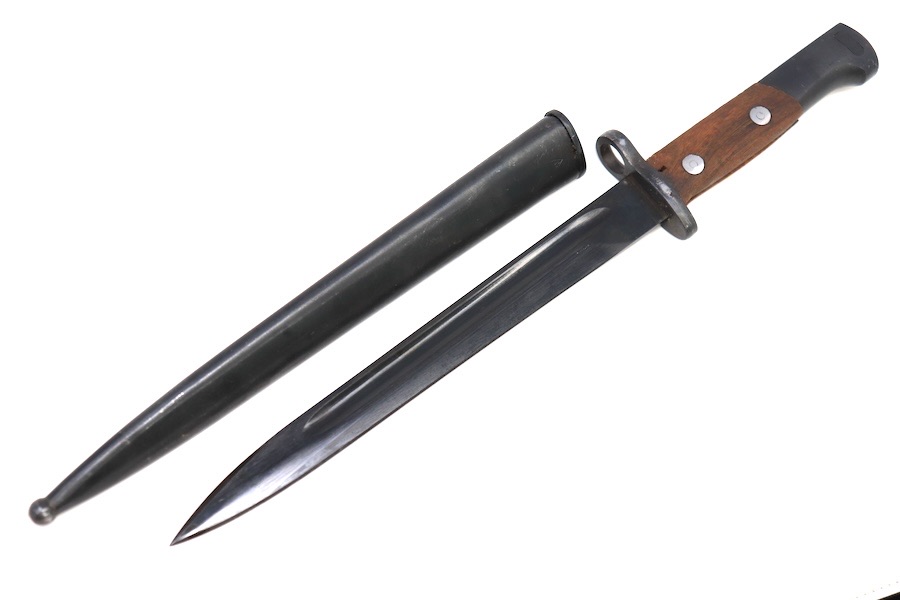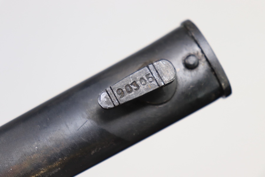 9/27/23 – This is a great-condition Yugoslavian Mauser bayonet with a matching scabbard. Blade has not been sharpened. Ricasso is maker-stamped, and a serial number just below reads 90305. The cross guard and pommel show almost no finish loss and the wood grips come in top condition with no issues. The scabbard has a few light scratches but no major issues. The frog stud serial number is matching to the bayonet 90305.