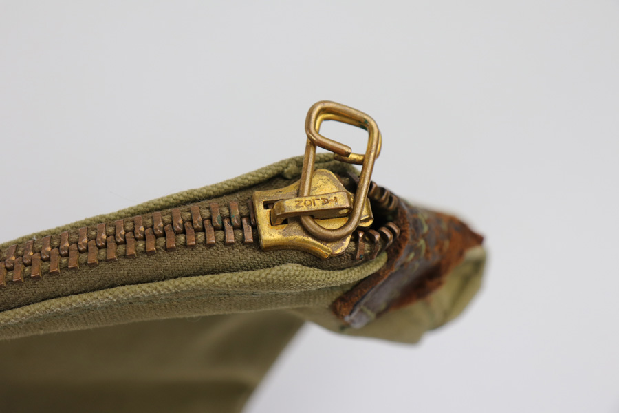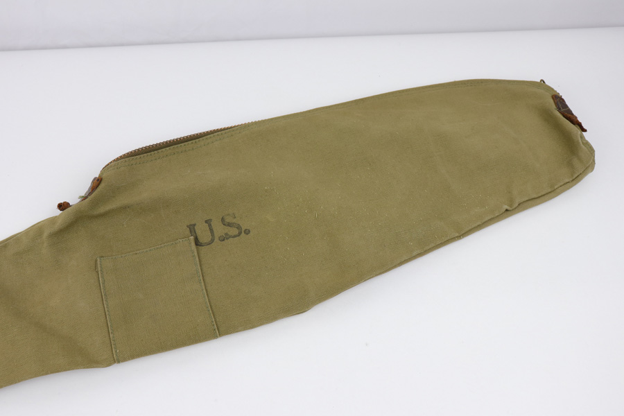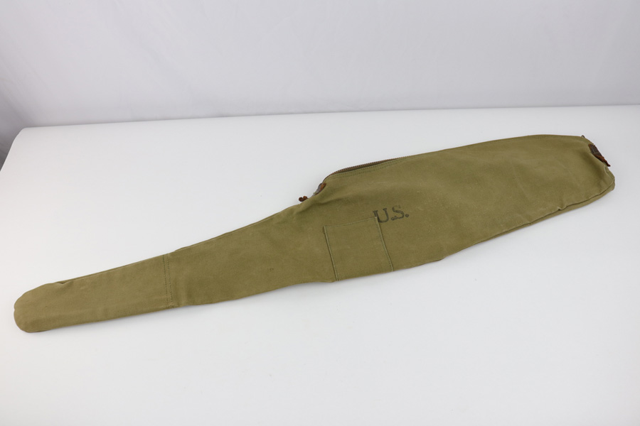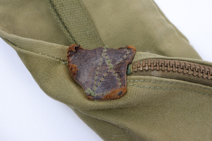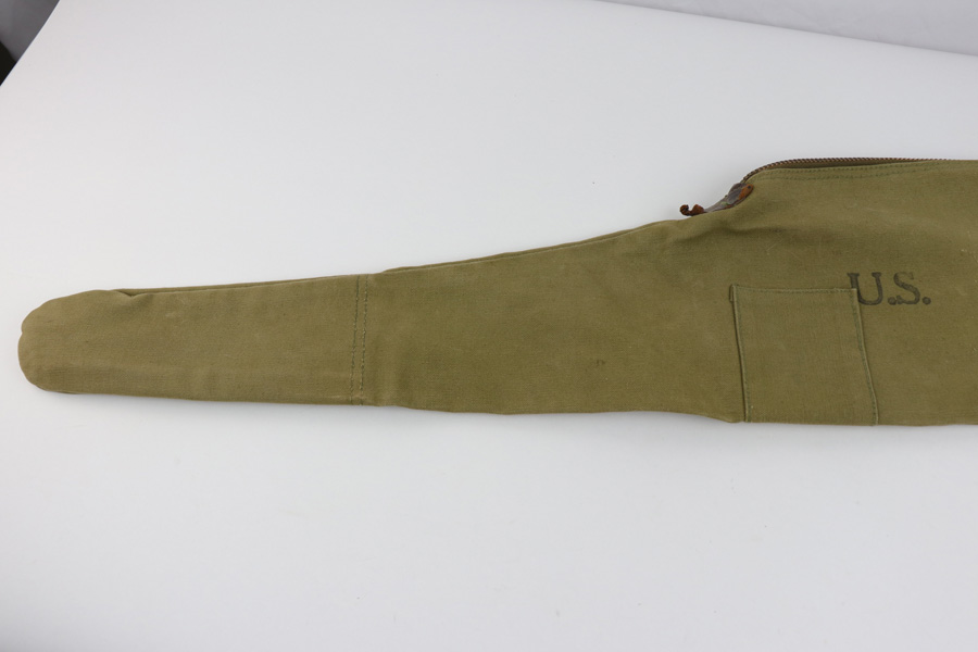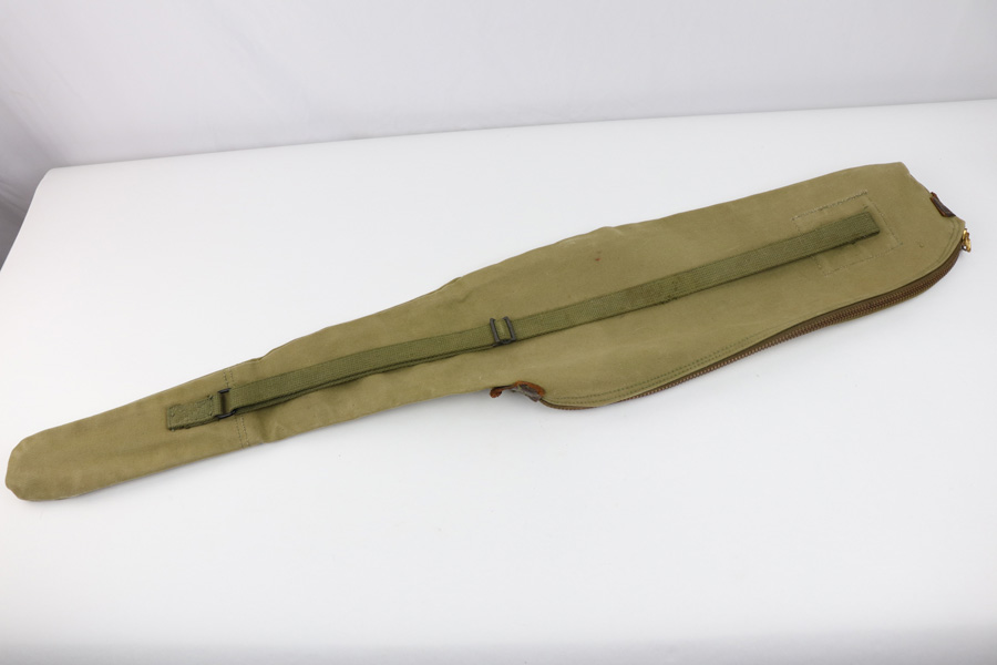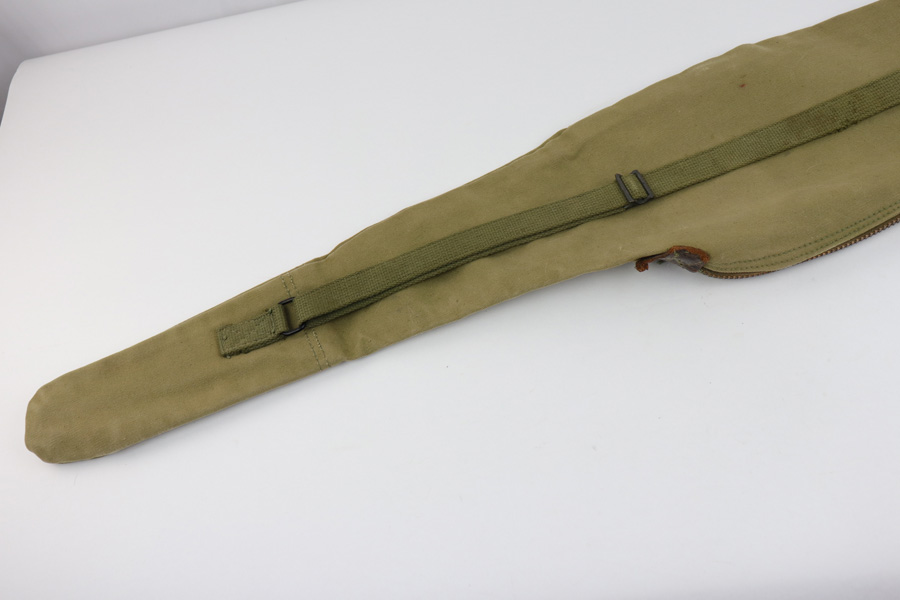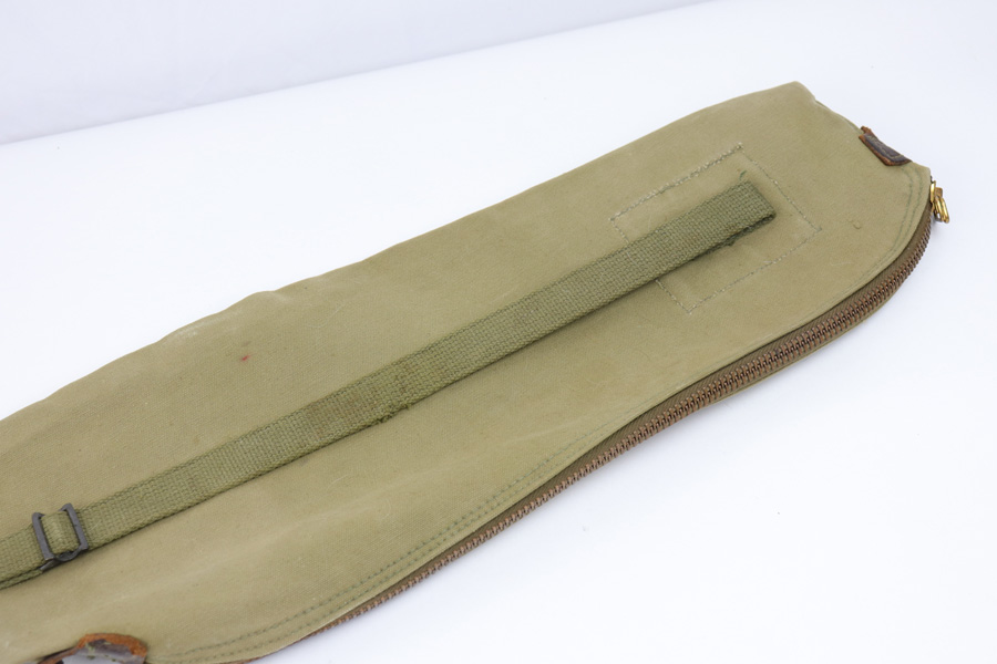5/29/19 – This is an original M1A1 carbine canvas carrying case. The case is in excellent condition with no major issues except for some minor wear on the leather tab at the base of the zipper. The interior canvas is ink stamped with a maker, “SUAHE MFG Co” and a 1944 date. The shoulder strap included is excellent as well. All original and authentic.