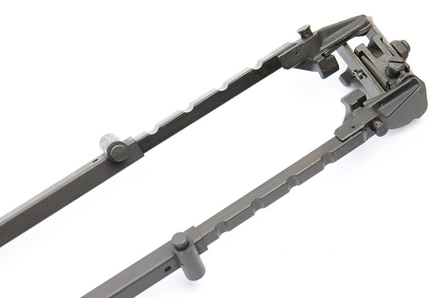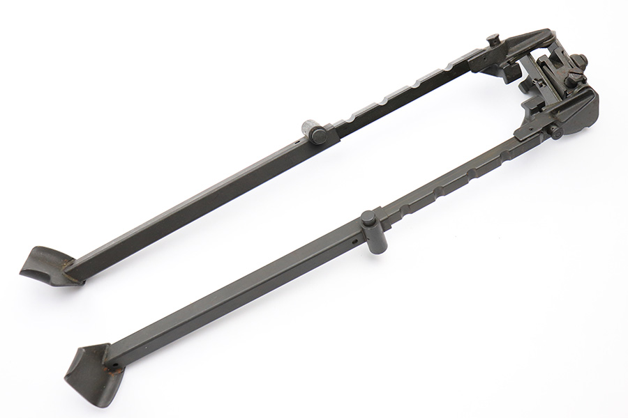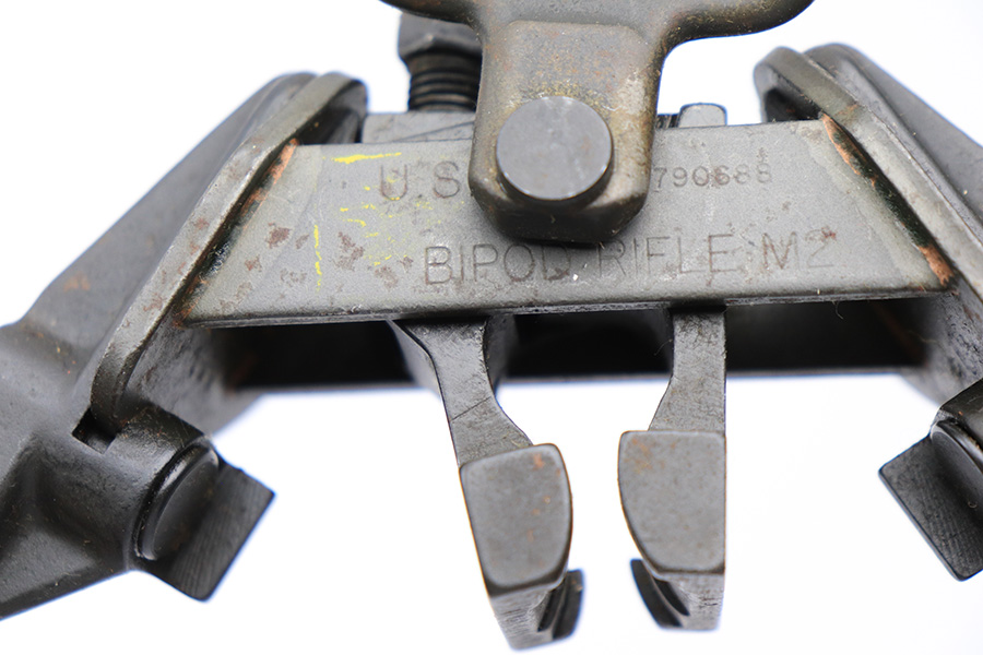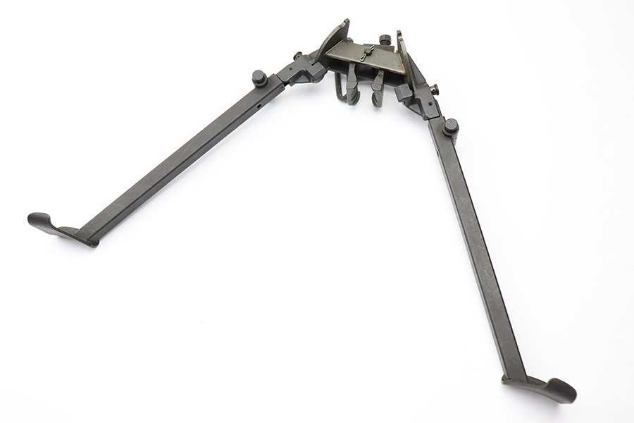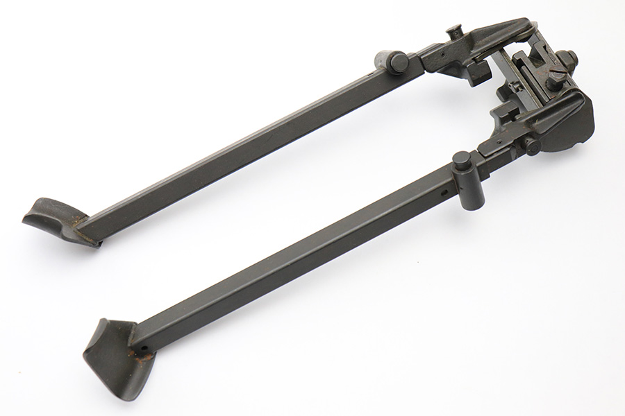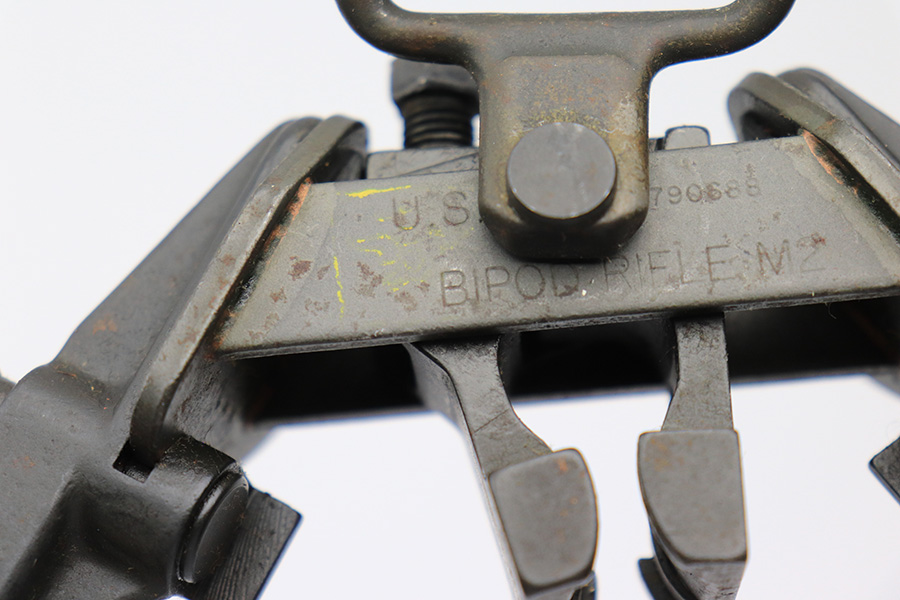 5/10/22 – This is an original US M2 bipod for M14 or M1A rifles. The bipod comes with the original wax paper wrapping and cardboard box, although the cardboard is somewhat tattered and broken open on one side. The bipod has a dull parkerized finish and is in great overall condition despite some mild spots of rust, as shown in photos. This vintage bipod is a perfect fit for a vintage collectible M14 or M1A.
