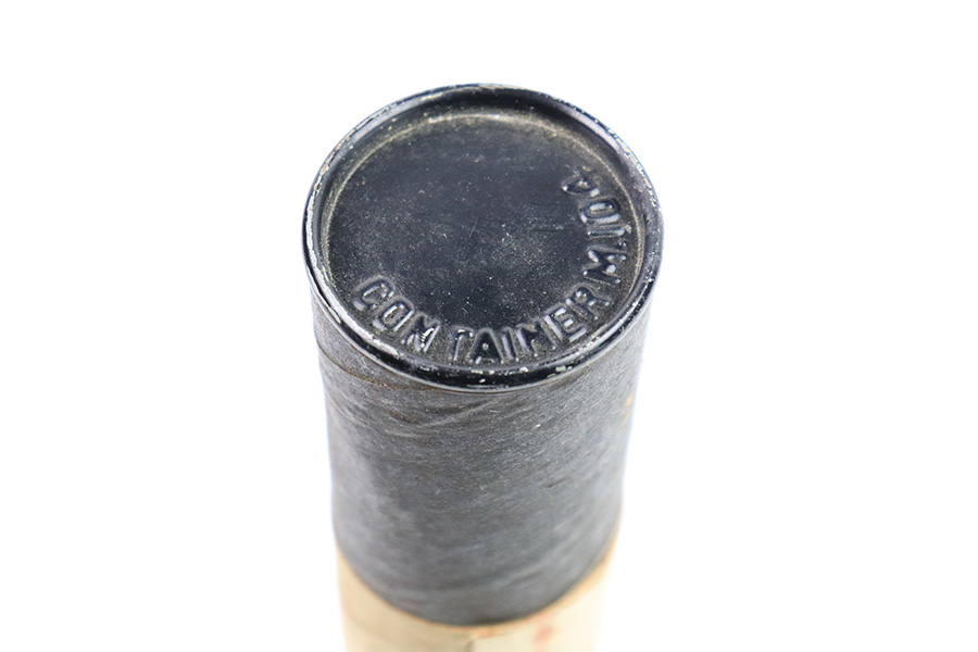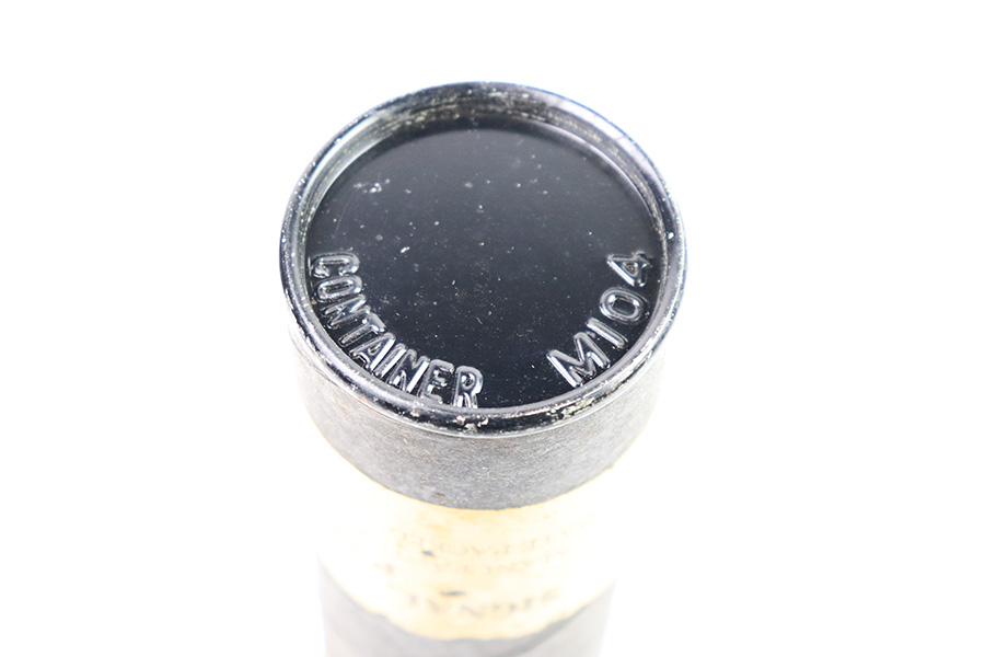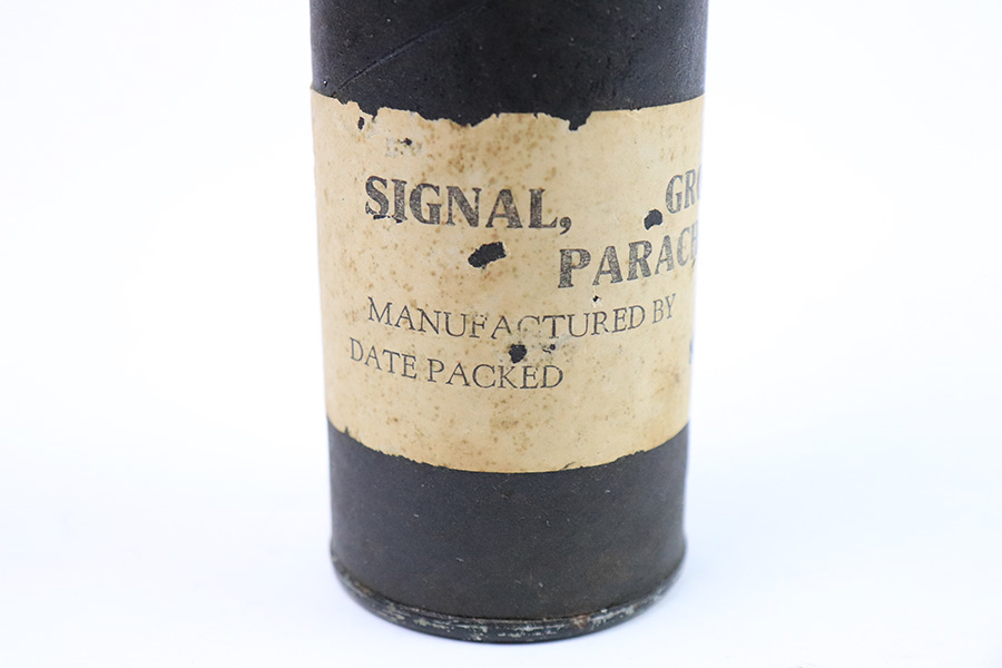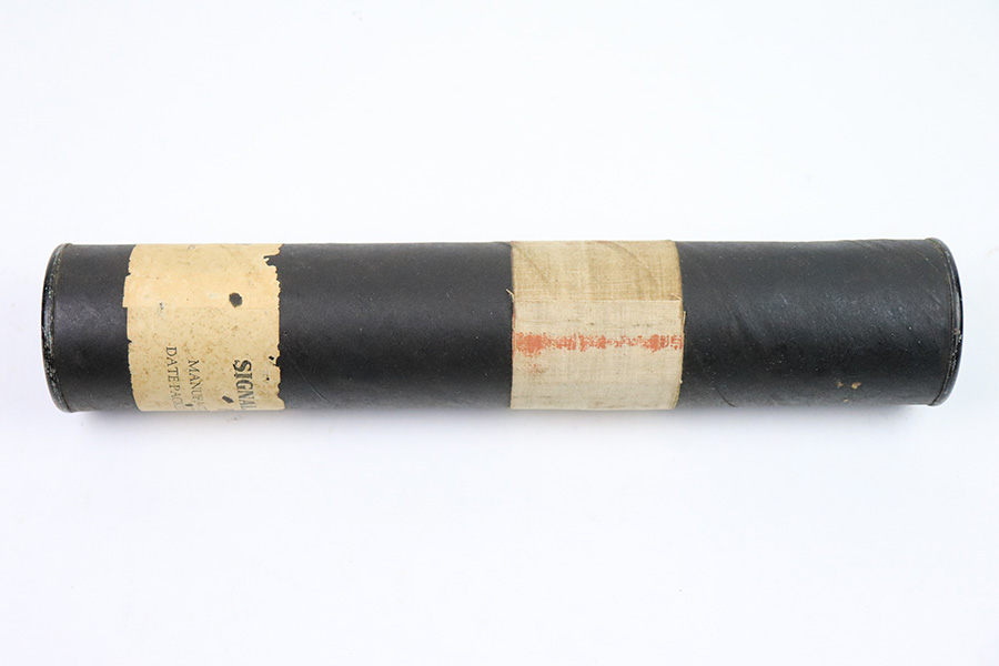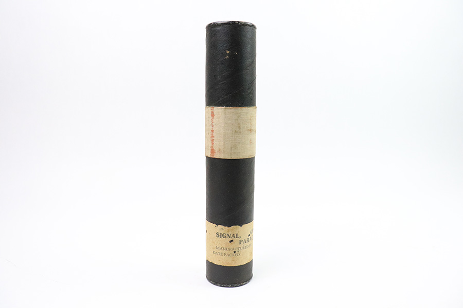 12/7/22 – This is an unopened M21A1 Amber Signal Parachute Flare. The flare is still sealed in the original cardboard storage tube. These are designed to be fired from a M1 rifle. The flare hangs from a small parachute and slowly floats to the ground while illuminating a larger area. The original label with November 1944 packaging date is still intact and clearly visible. A cool piece of US history.